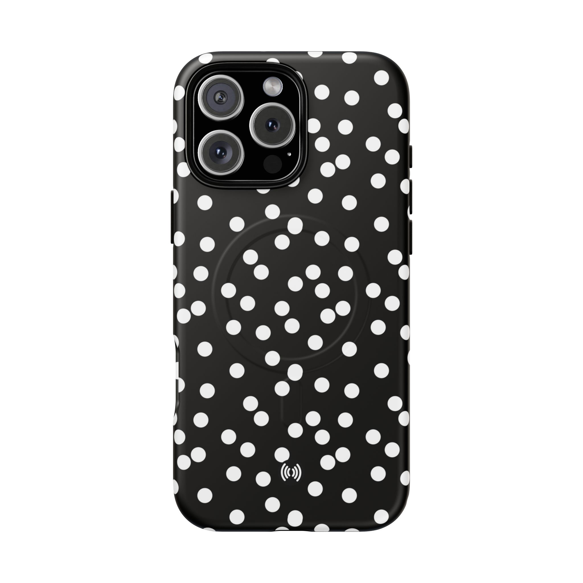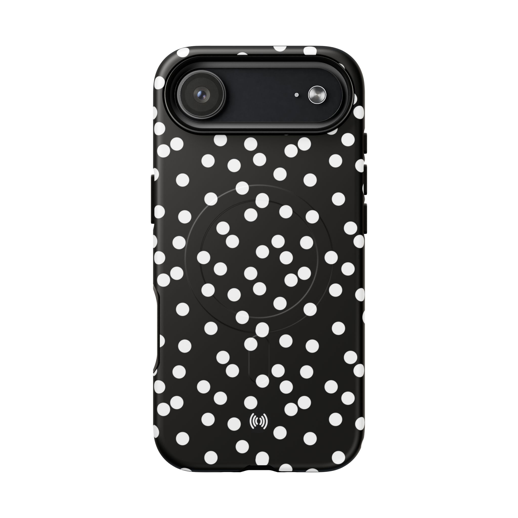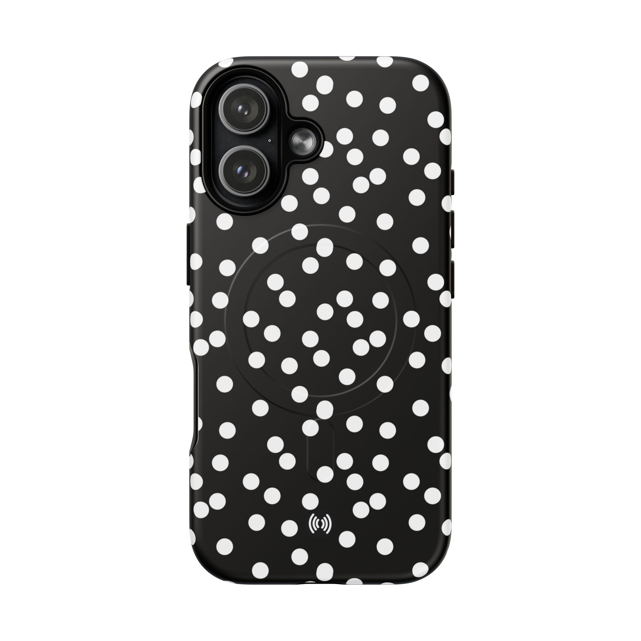 A sleek, protective phone case that blends bold contrast with practical protection. The glossy black background punctuated by scattered white dots creates a playful yet sophisticated look that stands out without shouting. Built with a dual-layer design — a tough polycarbonate shell and a shock-absorbing TPU silicone liner — it cushions drops and resists daily wear. The case supports MagSafe® accessories with a built-in magnetic module and keeps ports accessible with precision cutouts. Lightweight and slim, it slips easily into pockets while delivering all-around coverage and a premium 3D wrap finish that preserves the printed pattern’s depth and shine.