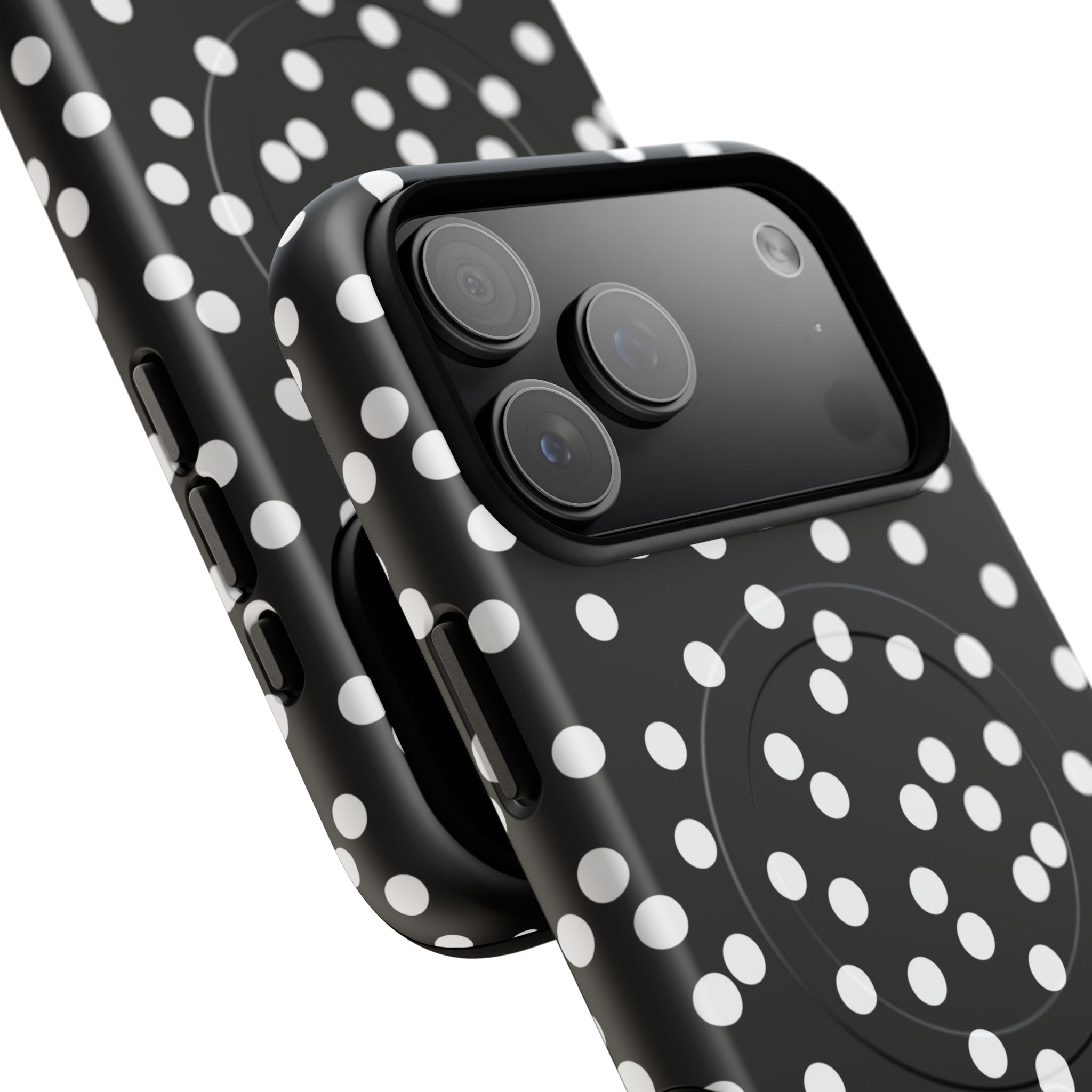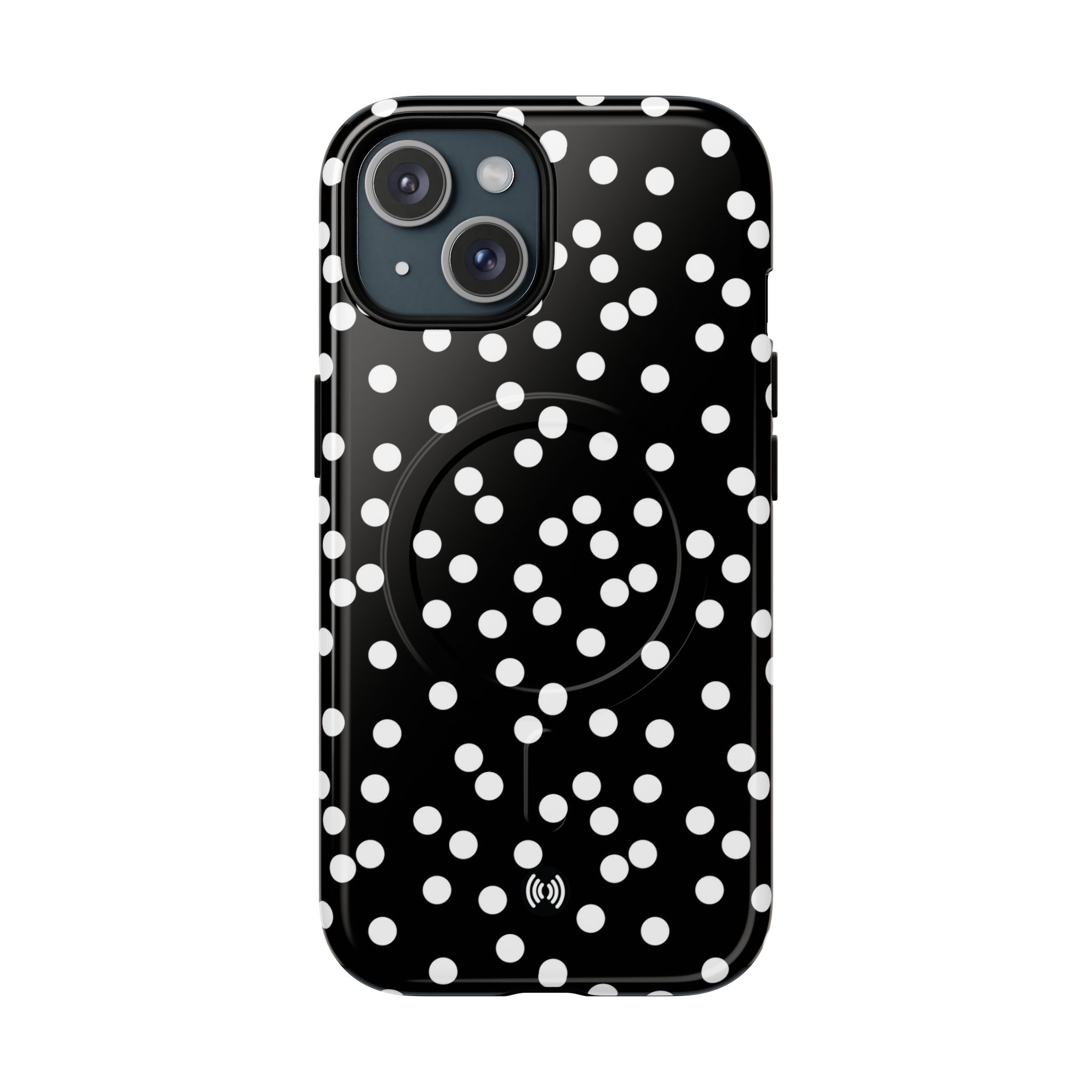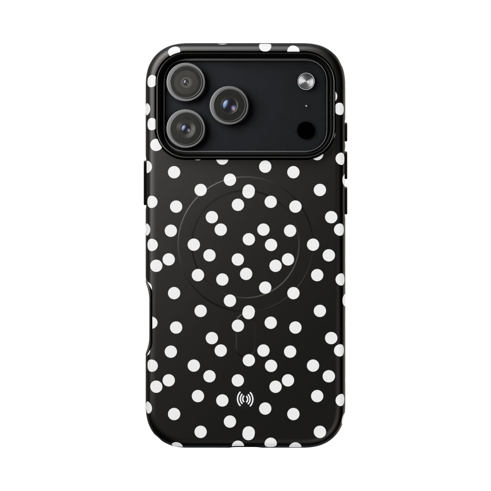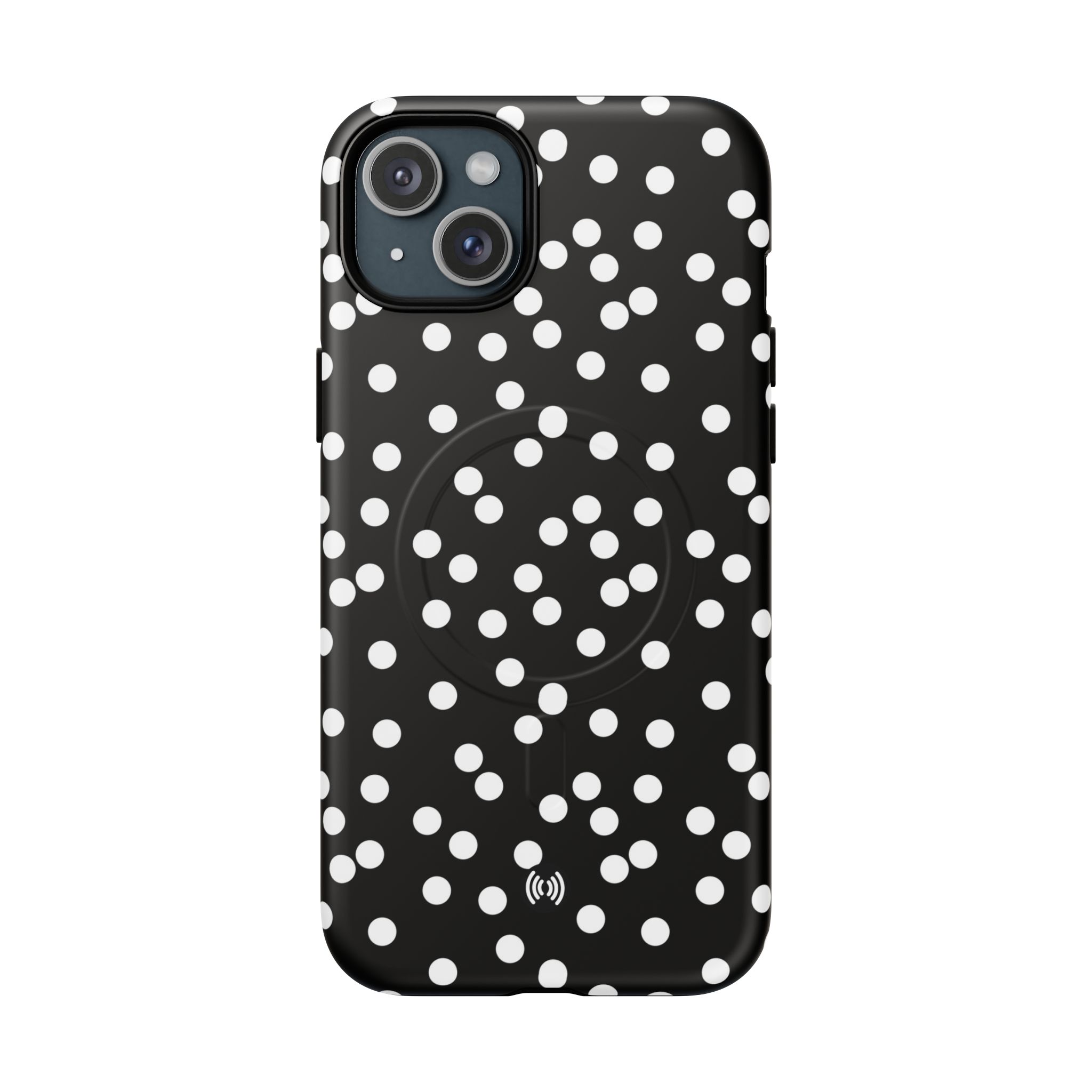 A sleek, protective phone case that blends bold contrast with practical protection. The glossy black background punctuated by scattered white dots creates a playful yet sophisticated look that stands out without shouting. Built with a dual-layer design — a tough polycarbonate shell and a shock-absorbing TPU silicone liner — it cushions drops and resists daily wear. The case supports MagSafe® accessories with a built-in magnetic module and keeps ports accessible with precision cutouts. Lightweight and slim, it slips easily into pockets while delivering all-around coverage and a premium 3D wrap finish that preserves the printed pattern’s depth and shine.