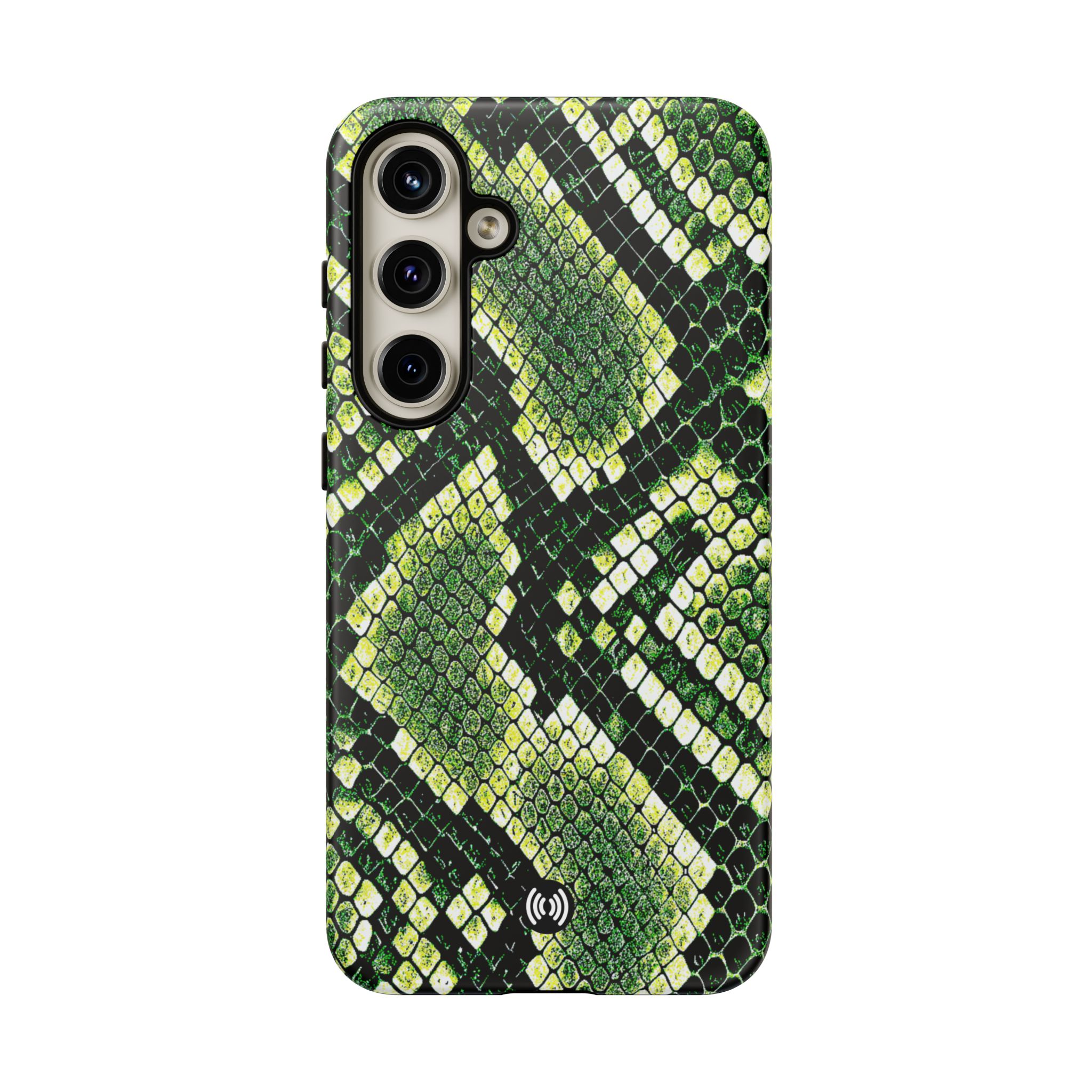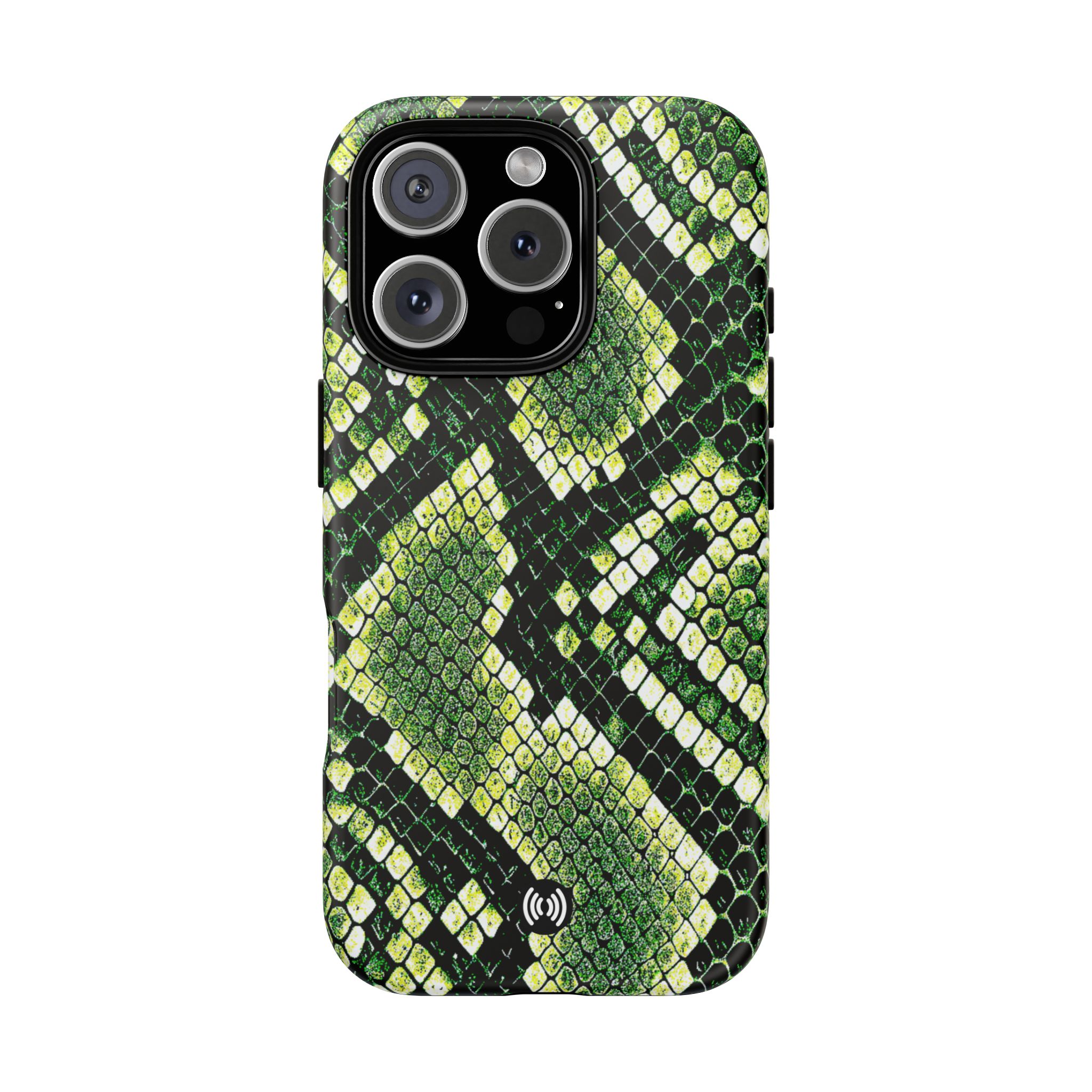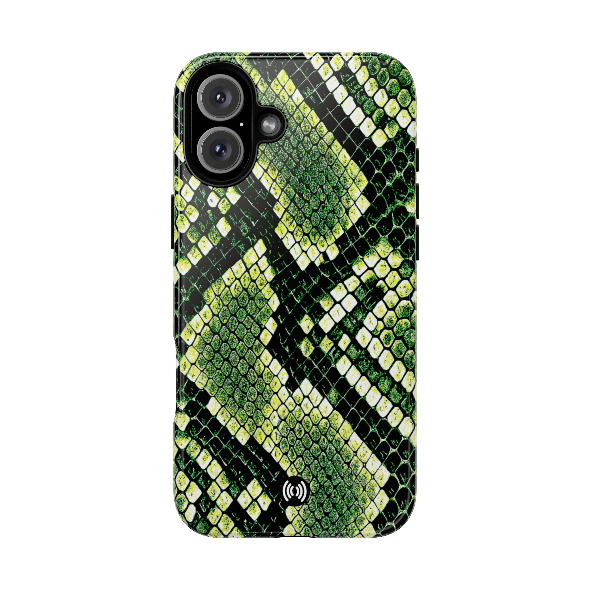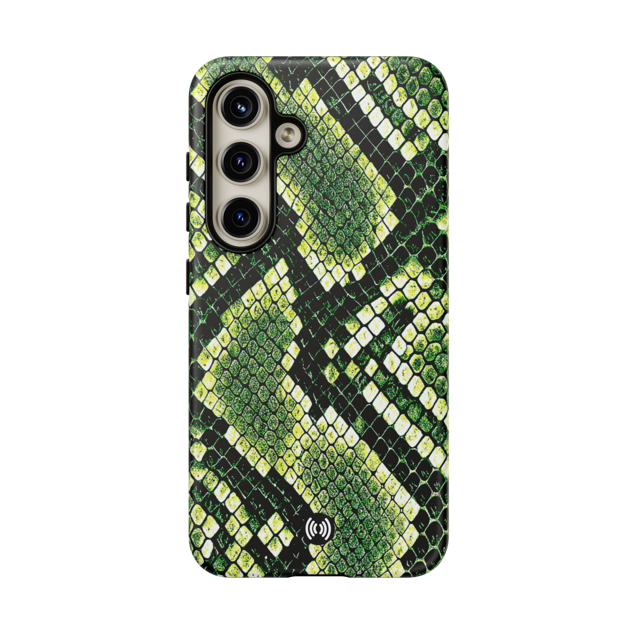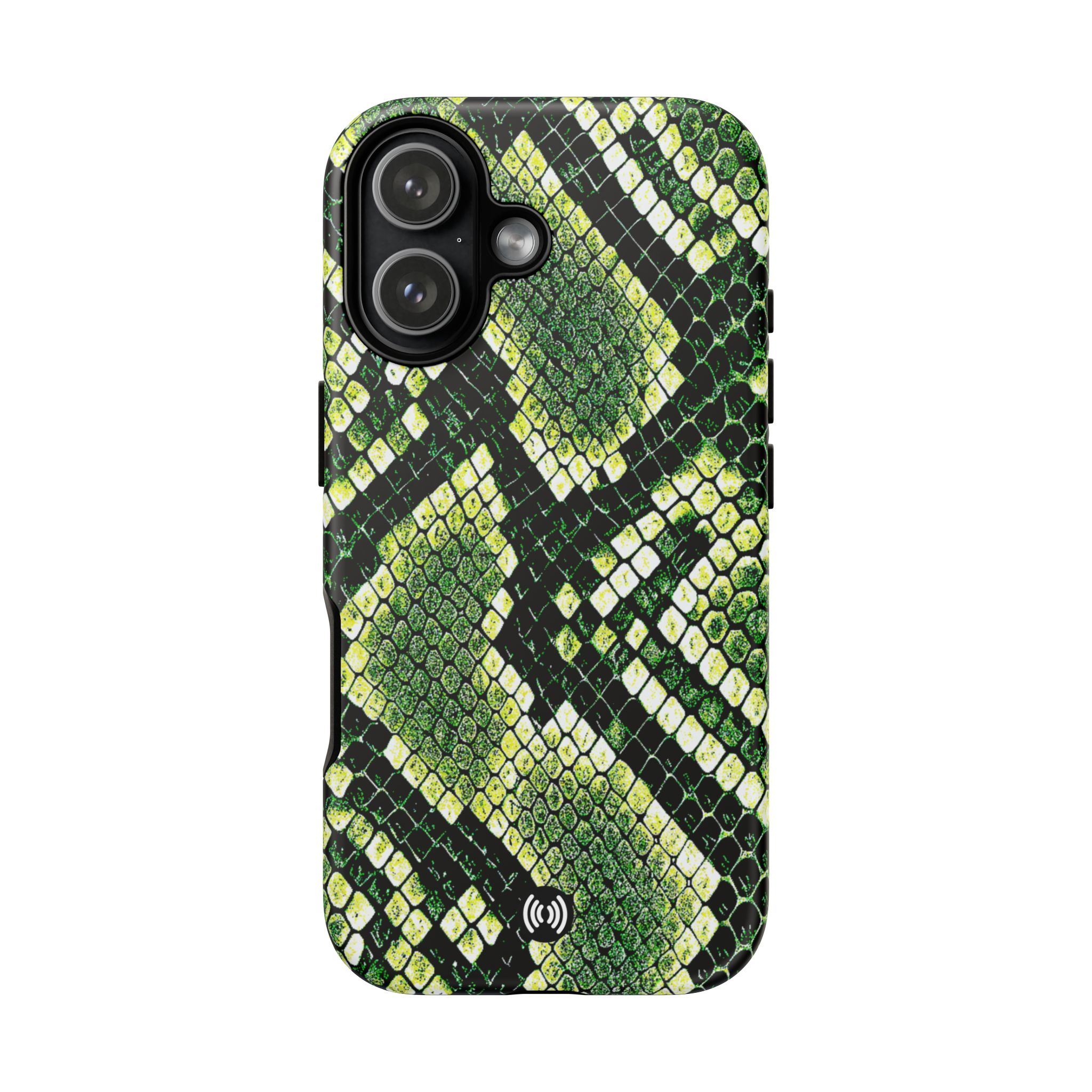 This green snakeskin phone case brings bold texture and confident style to everyday carry. The dual-layer shell combines a rigid polycarbonate exterior with a soft TPU silicone liner for reliable shock absorption and secure fit. A full-wrap 3D print gives rich, high-density color across the whole surface while UV protection helps preserve the vibrant pattern outdoors. Slim profiles and open ports keep your phone accessible and support wireless charging, so the case stays as functional as it is striking. Built to meet international safety standards and sourced from South Korea, it’s a sturdy, fashion-forward option for someone who likes an edgy, tactile look.