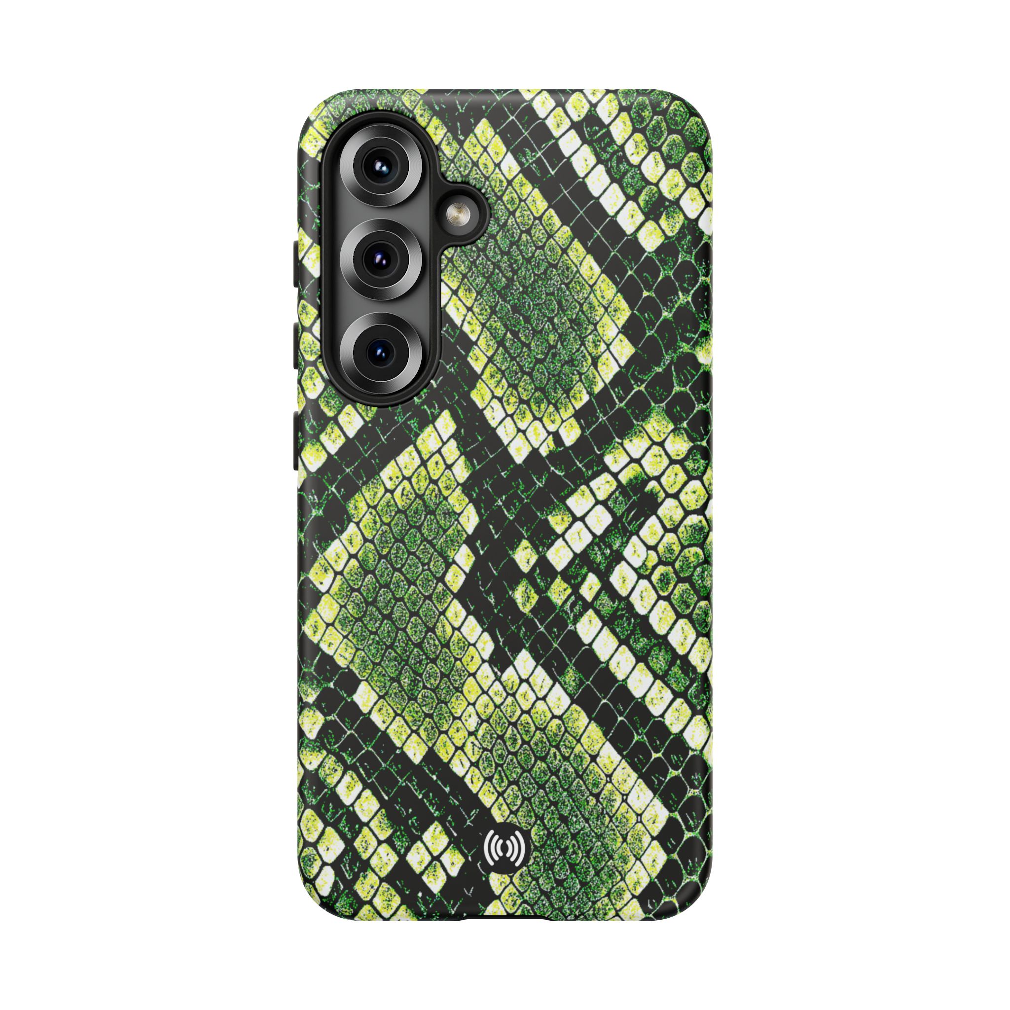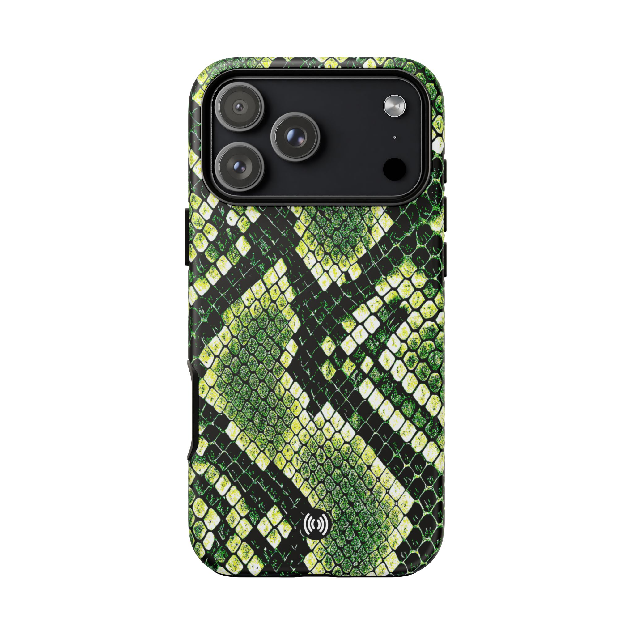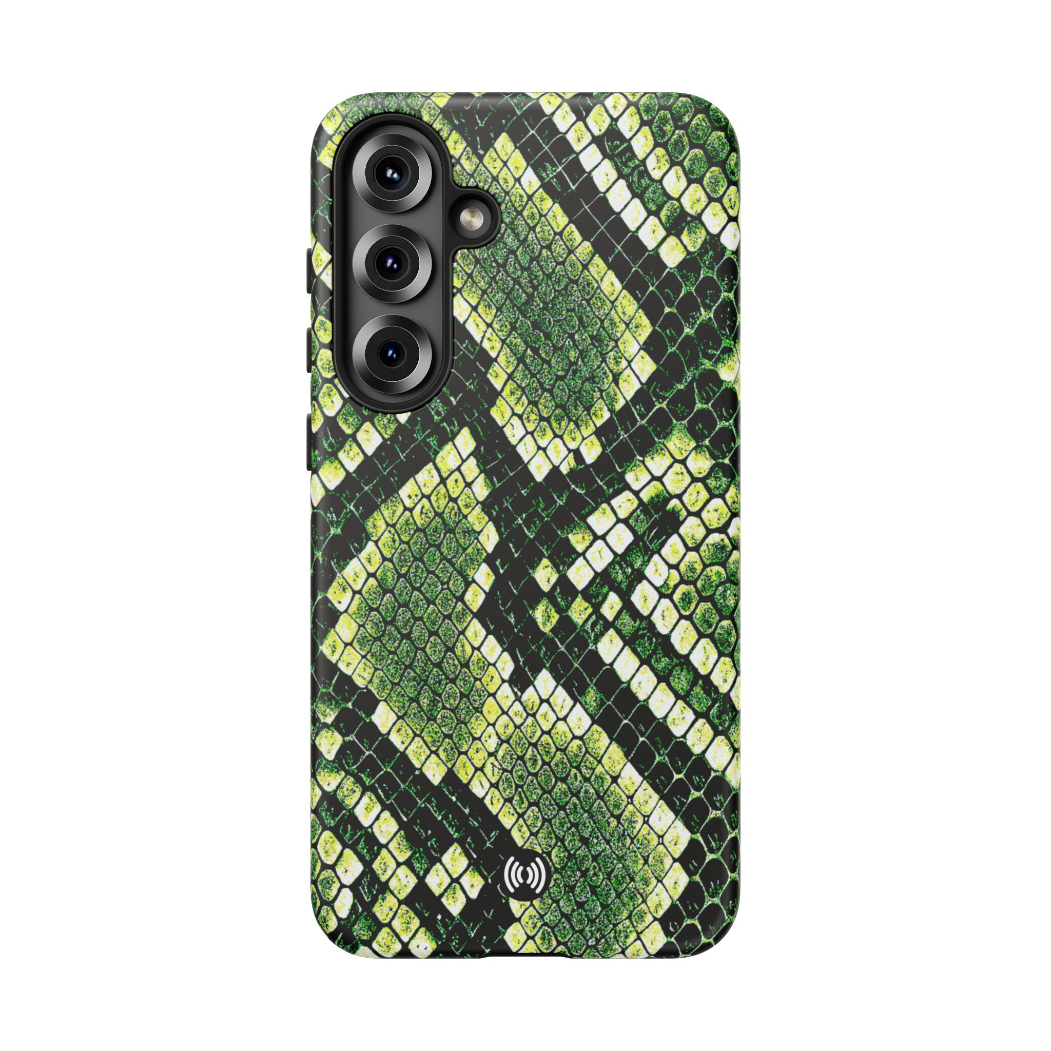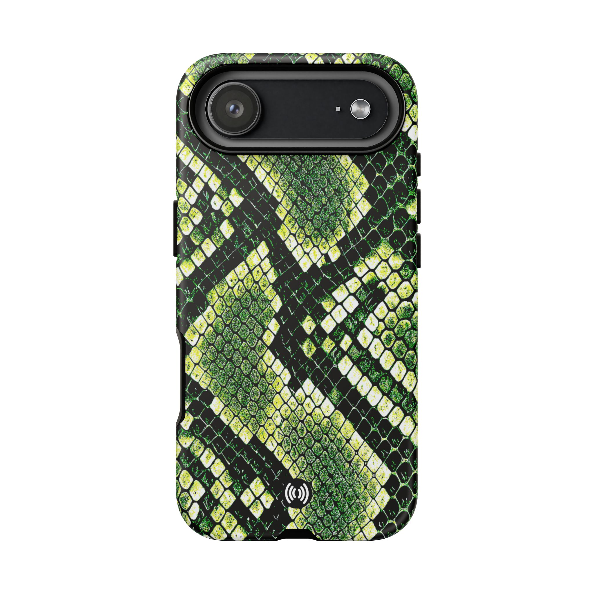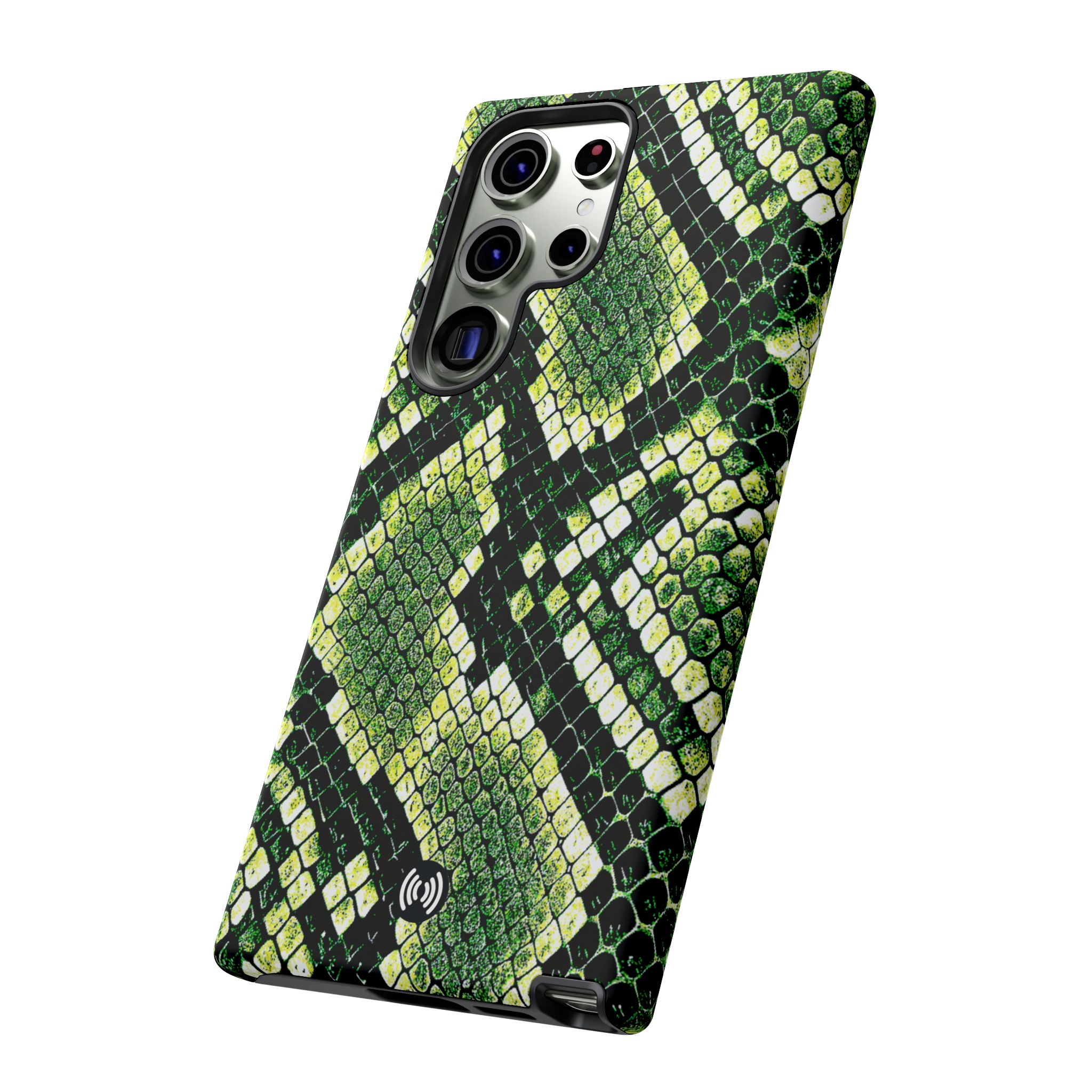 This green snakeskin phone case brings bold texture and confident style to everyday carry. The dual-layer shell combines a rigid polycarbonate exterior with a soft TPU silicone liner for reliable shock absorption and secure fit. A full-wrap 3D print gives rich, high-density color across the whole surface while UV protection helps preserve the vibrant pattern outdoors. Slim profiles and open ports keep your phone accessible and support wireless charging, so the case stays as functional as it is striking. Built to meet international safety standards and sourced from South Korea, it’s a sturdy, fashion-forward option for someone who likes an edgy, tactile look.