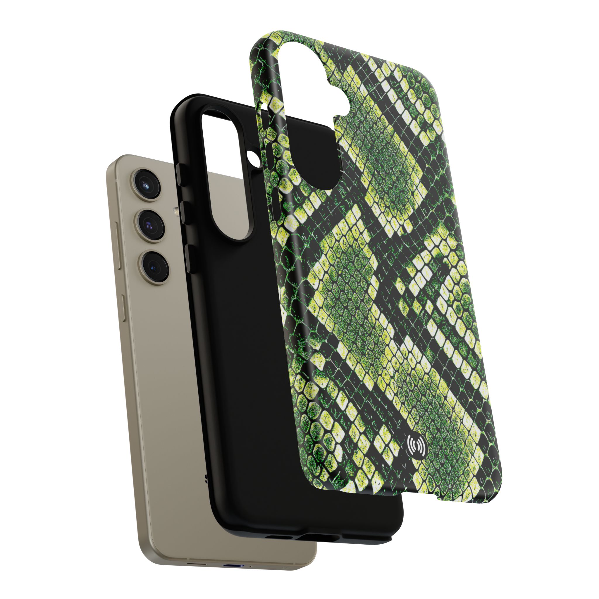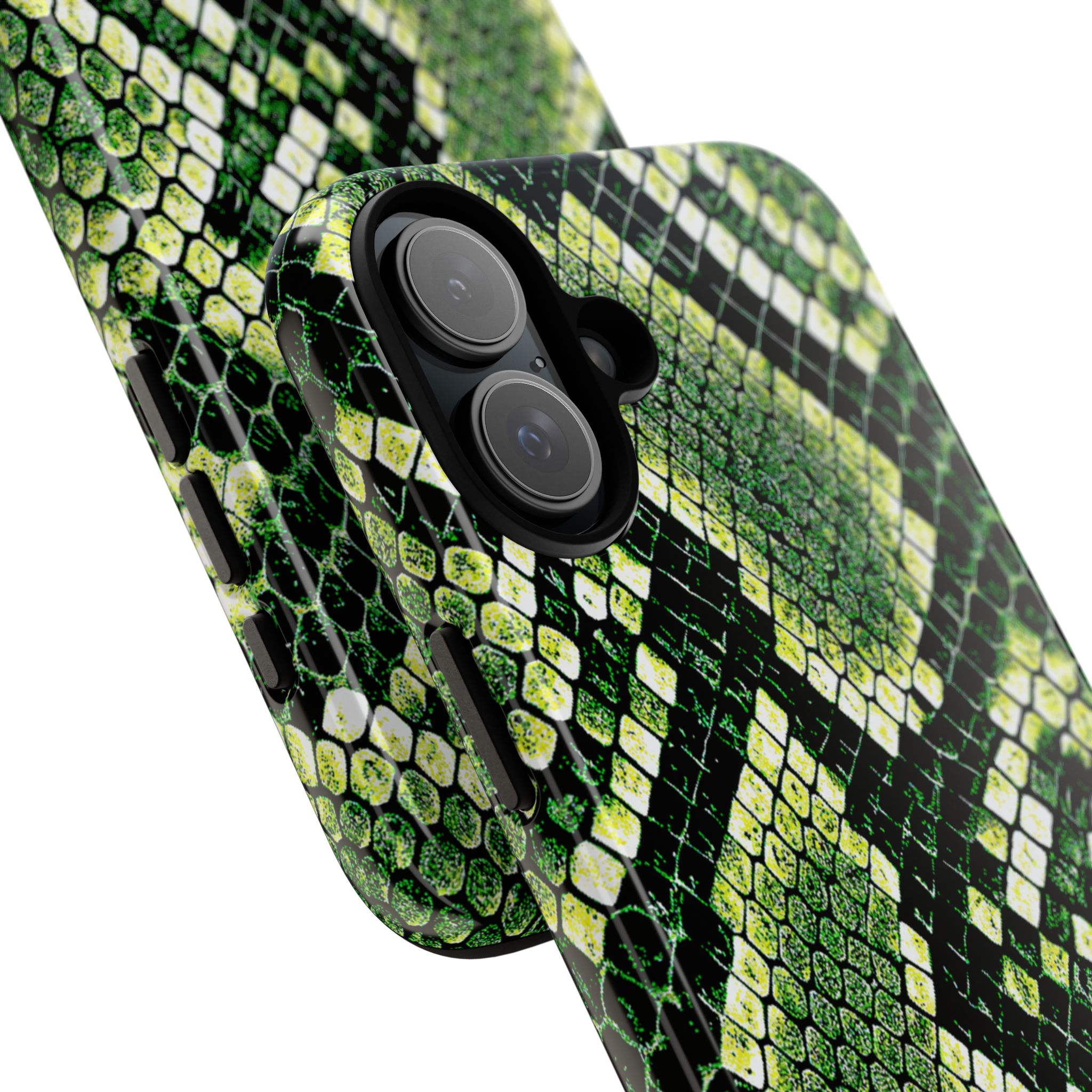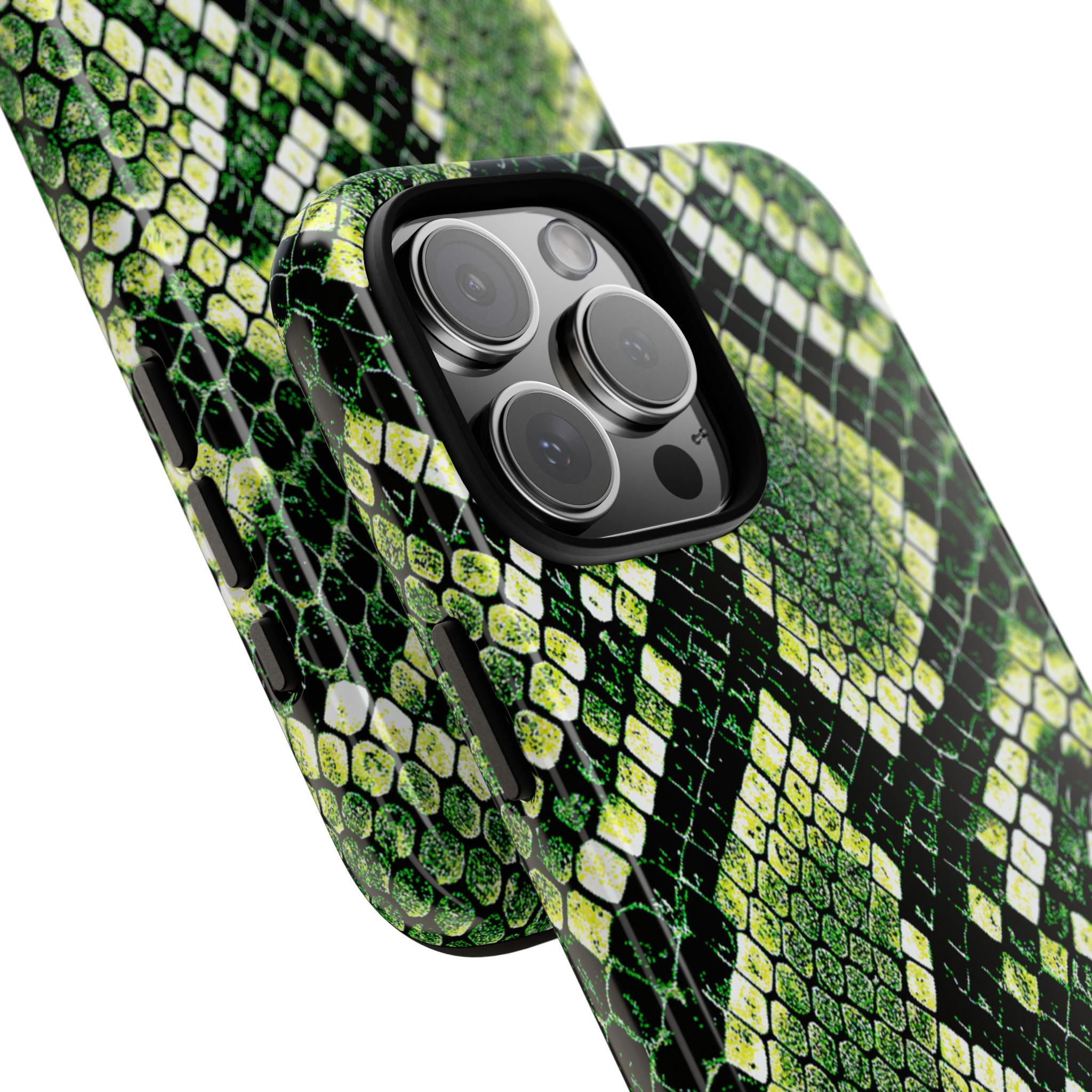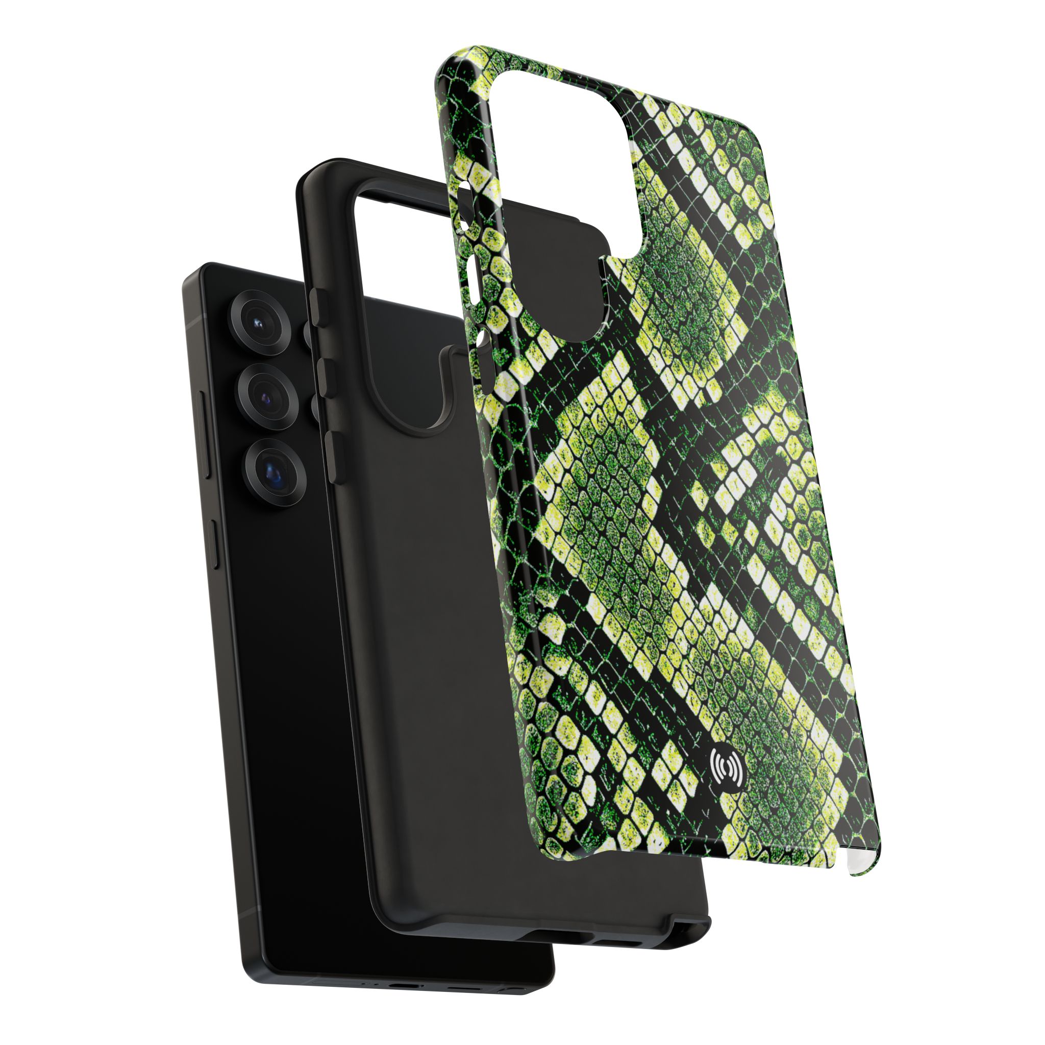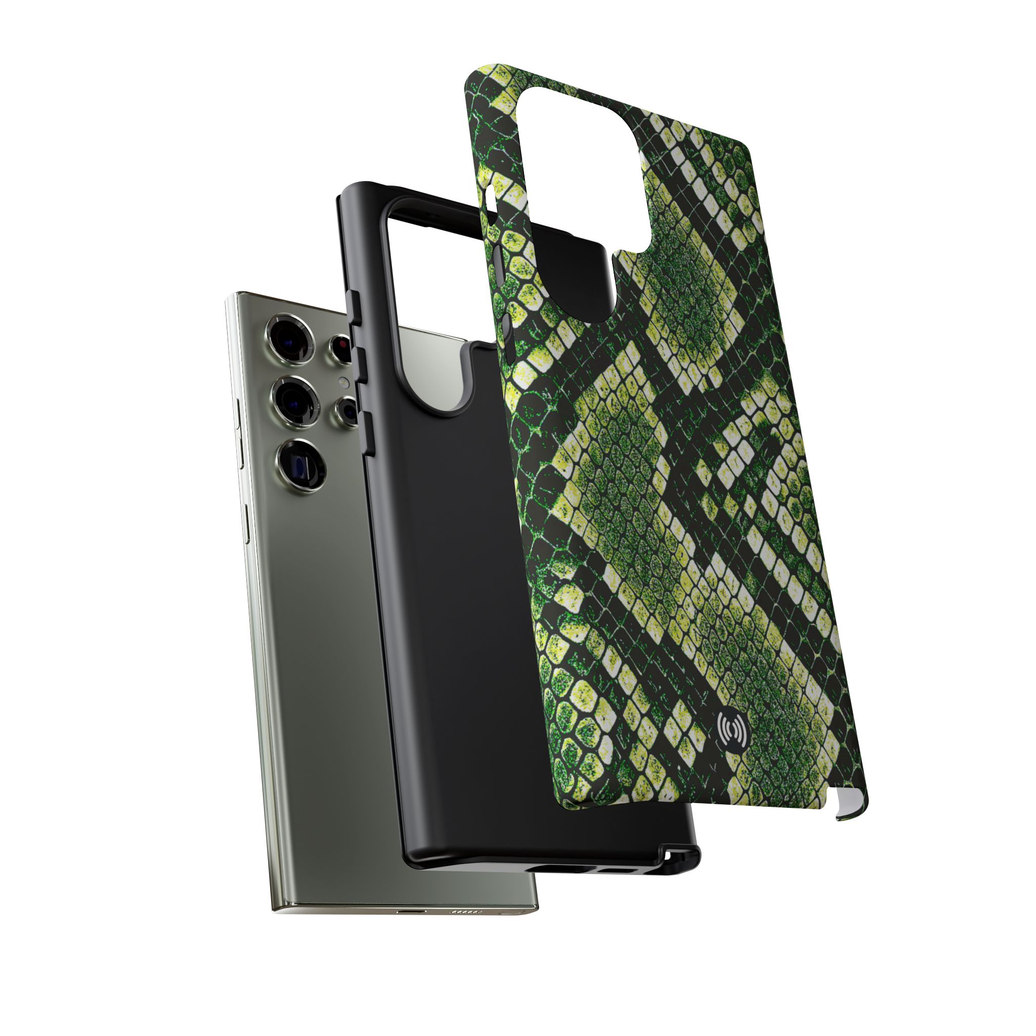 This green snakeskin phone case brings bold texture and confident style to everyday carry. The dual-layer shell combines a rigid polycarbonate exterior with a soft TPU silicone liner for reliable shock absorption and secure fit. A full-wrap 3D print gives rich, high-density color across the whole surface while UV protection helps preserve the vibrant pattern outdoors. Slim profiles and open ports keep your phone accessible and support wireless charging, so the case stays as functional as it is striking. Built to meet international safety standards and sourced from South Korea, it’s a sturdy, fashion-forward option for someone who likes an edgy, tactile look.