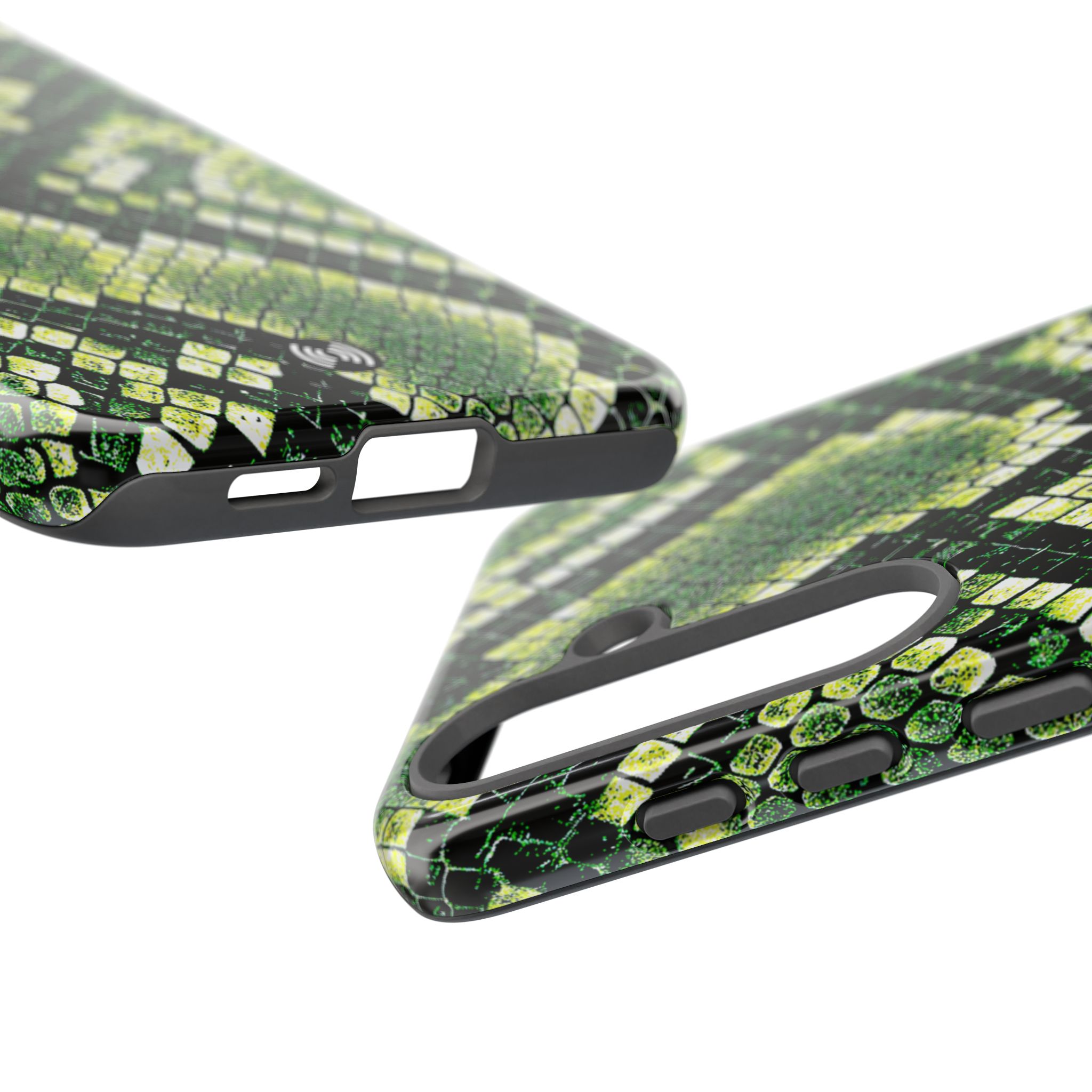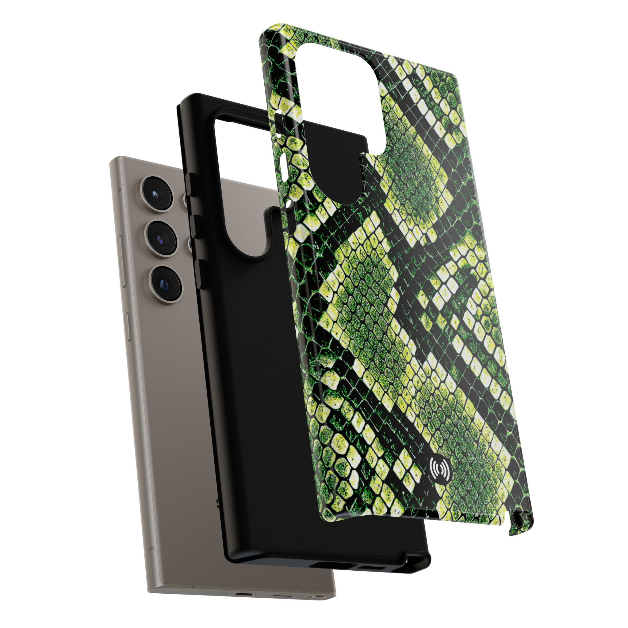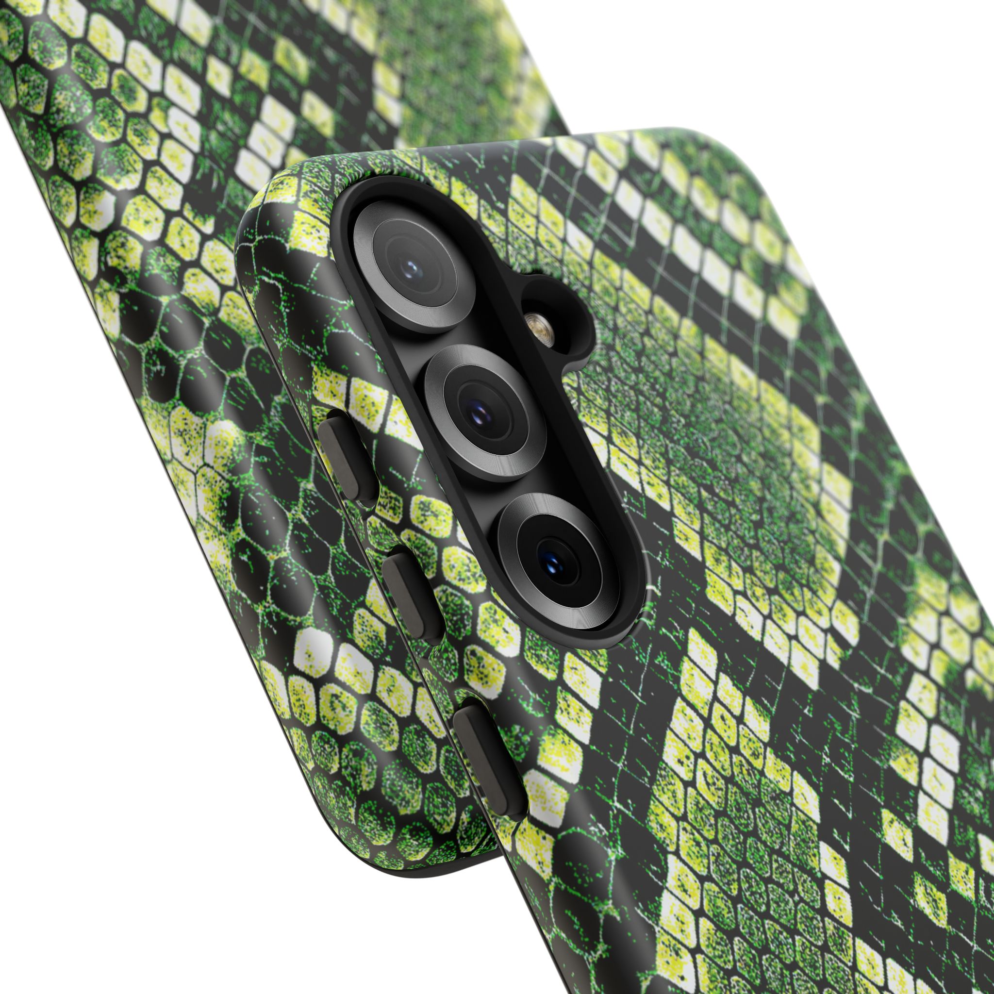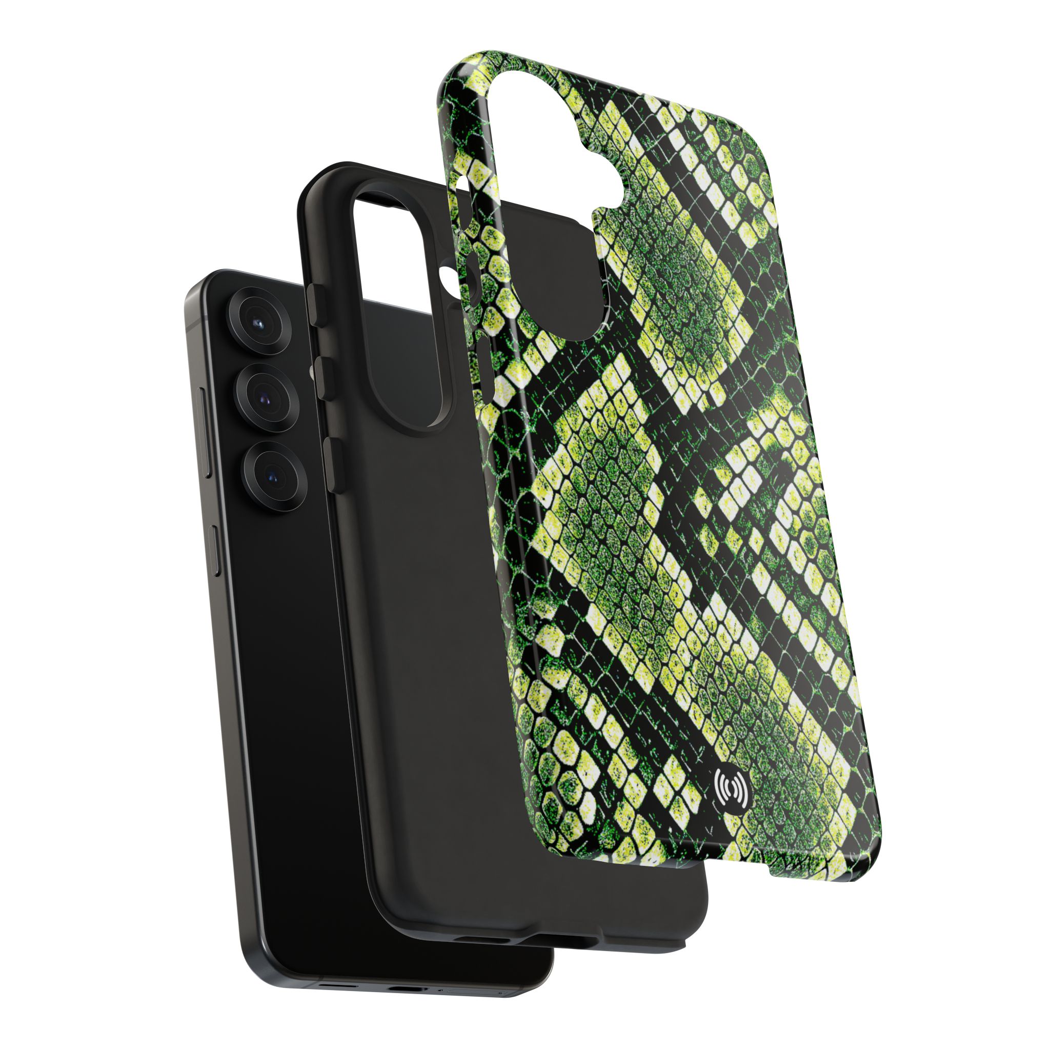 This green snakeskin phone case brings bold texture and confident style to everyday carry. The dual-layer shell combines a rigid polycarbonate exterior with a soft TPU silicone liner for reliable shock absorption and secure fit. A full-wrap 3D print gives rich, high-density color across the whole surface while UV protection helps preserve the vibrant pattern outdoors. Slim profiles and open ports keep your phone accessible and support wireless charging, so the case stays as functional as it is striking. Built to meet international safety standards and sourced from South Korea, it’s a sturdy, fashion-forward option for someone who likes an edgy, tactile look.