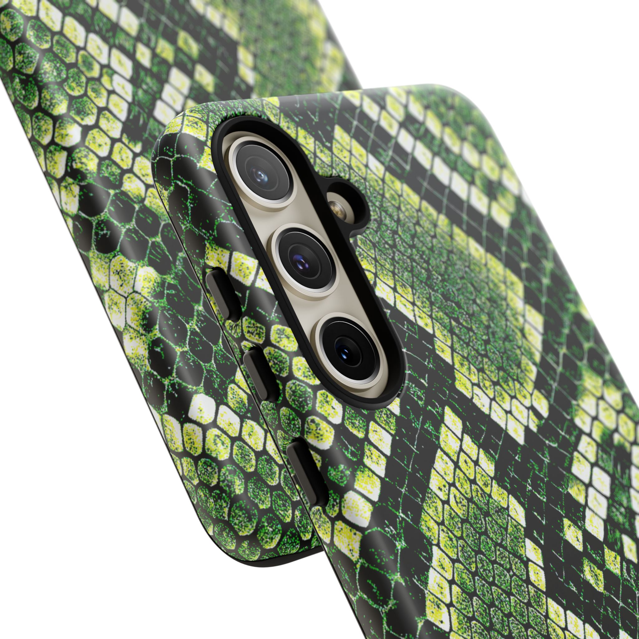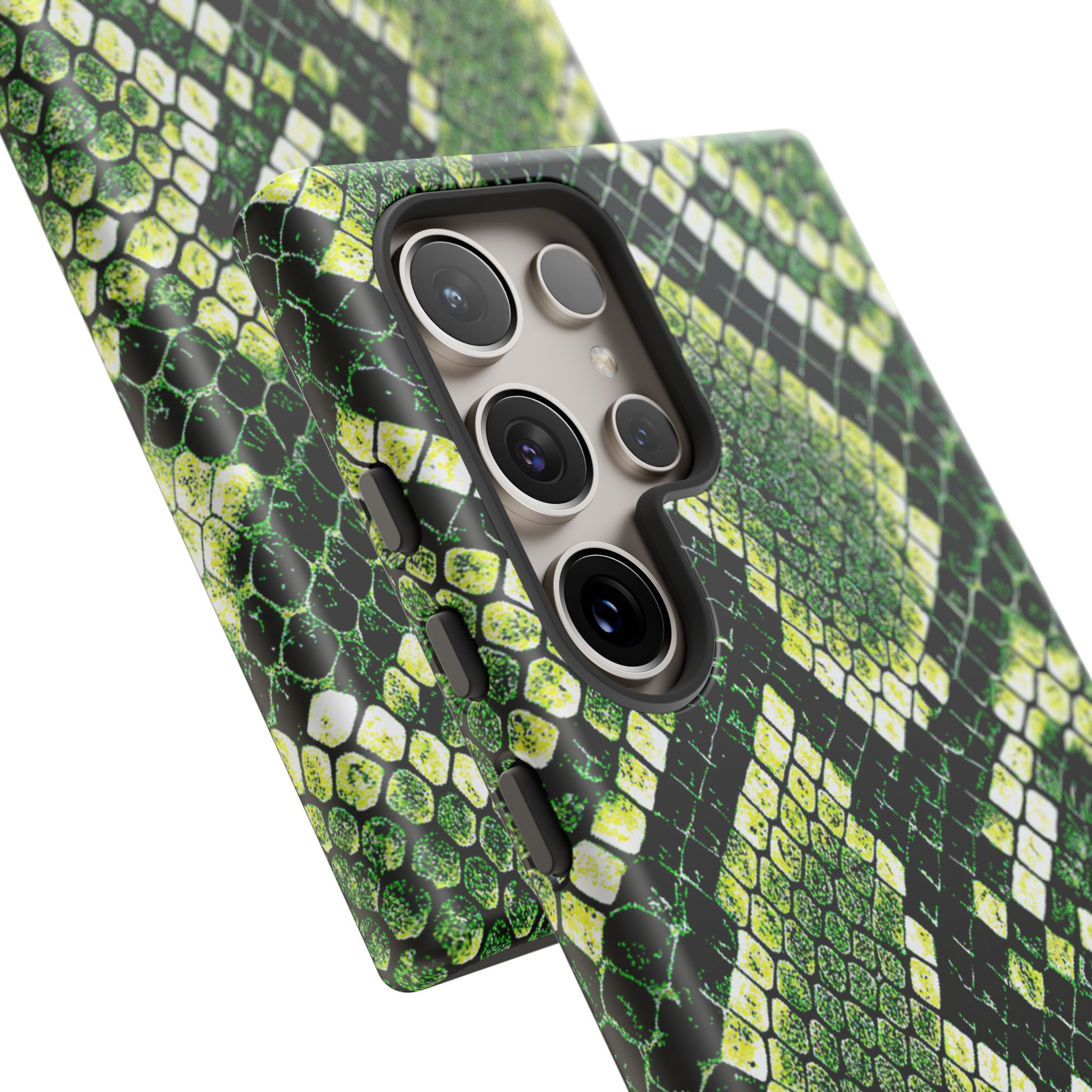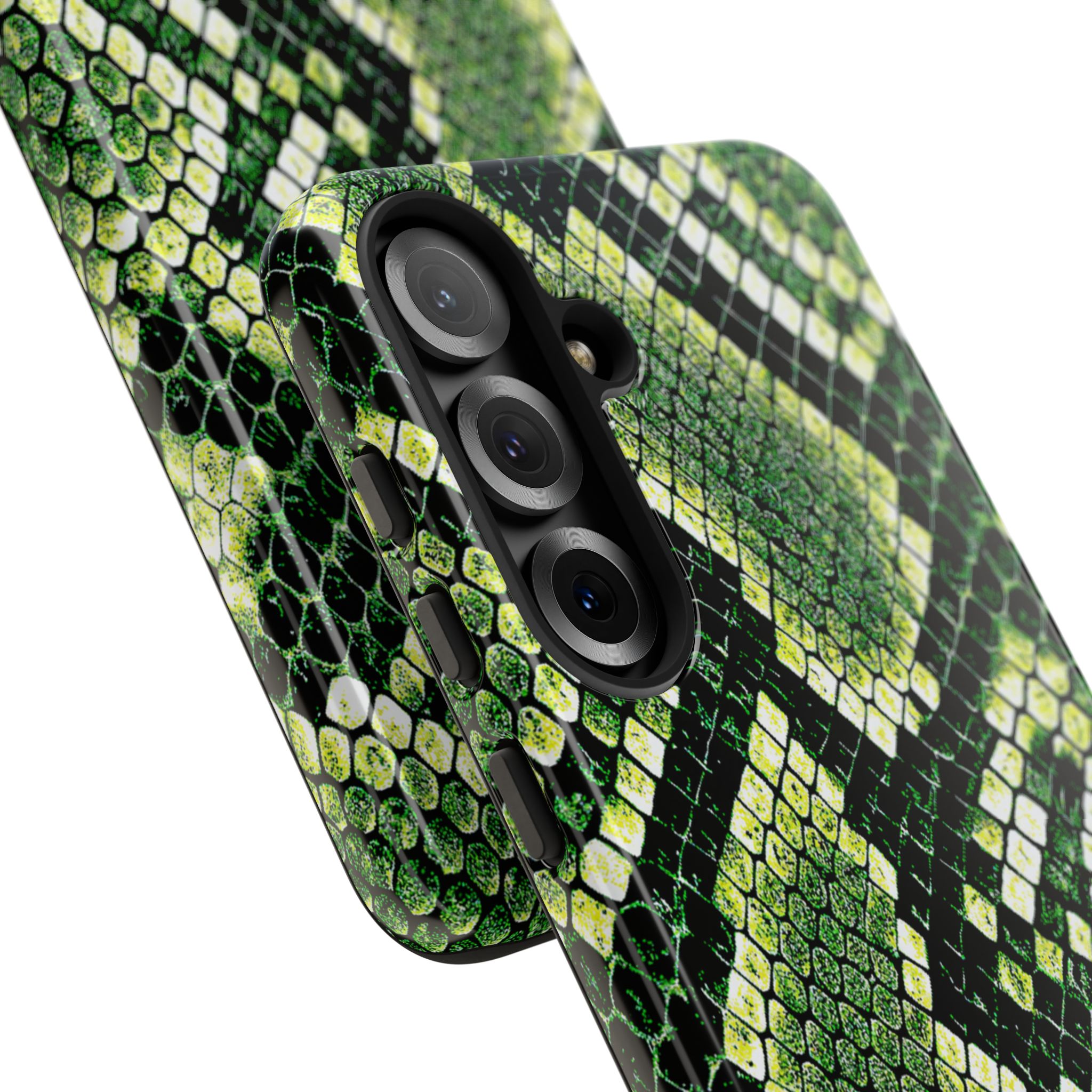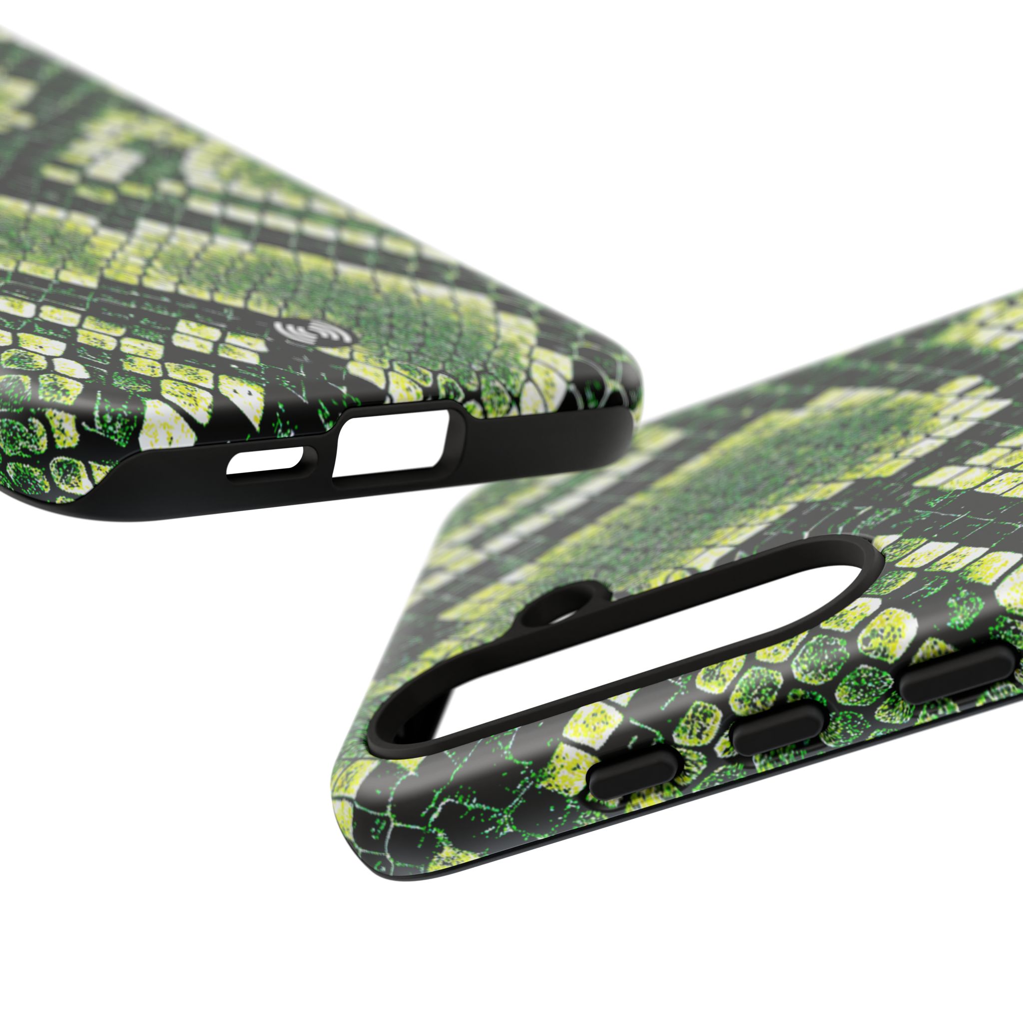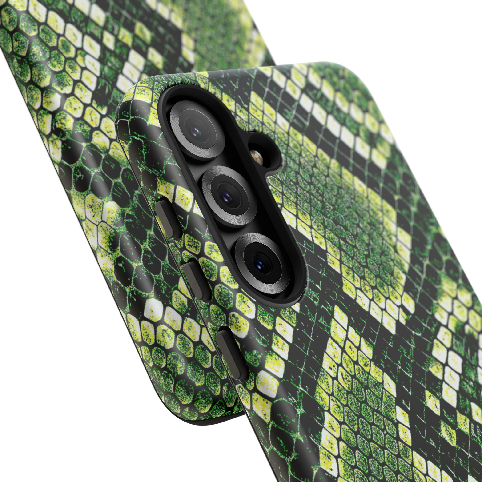 This green snakeskin phone case brings bold texture and confident style to everyday carry. The dual-layer shell combines a rigid polycarbonate exterior with a soft TPU silicone liner for reliable shock absorption and secure fit. A full-wrap 3D print gives rich, high-density color across the whole surface while UV protection helps preserve the vibrant pattern outdoors. Slim profiles and open ports keep your phone accessible and support wireless charging, so the case stays as functional as it is striking. Built to meet international safety standards and sourced from South Korea, it’s a sturdy, fashion-forward option for someone who likes an edgy, tactile look.