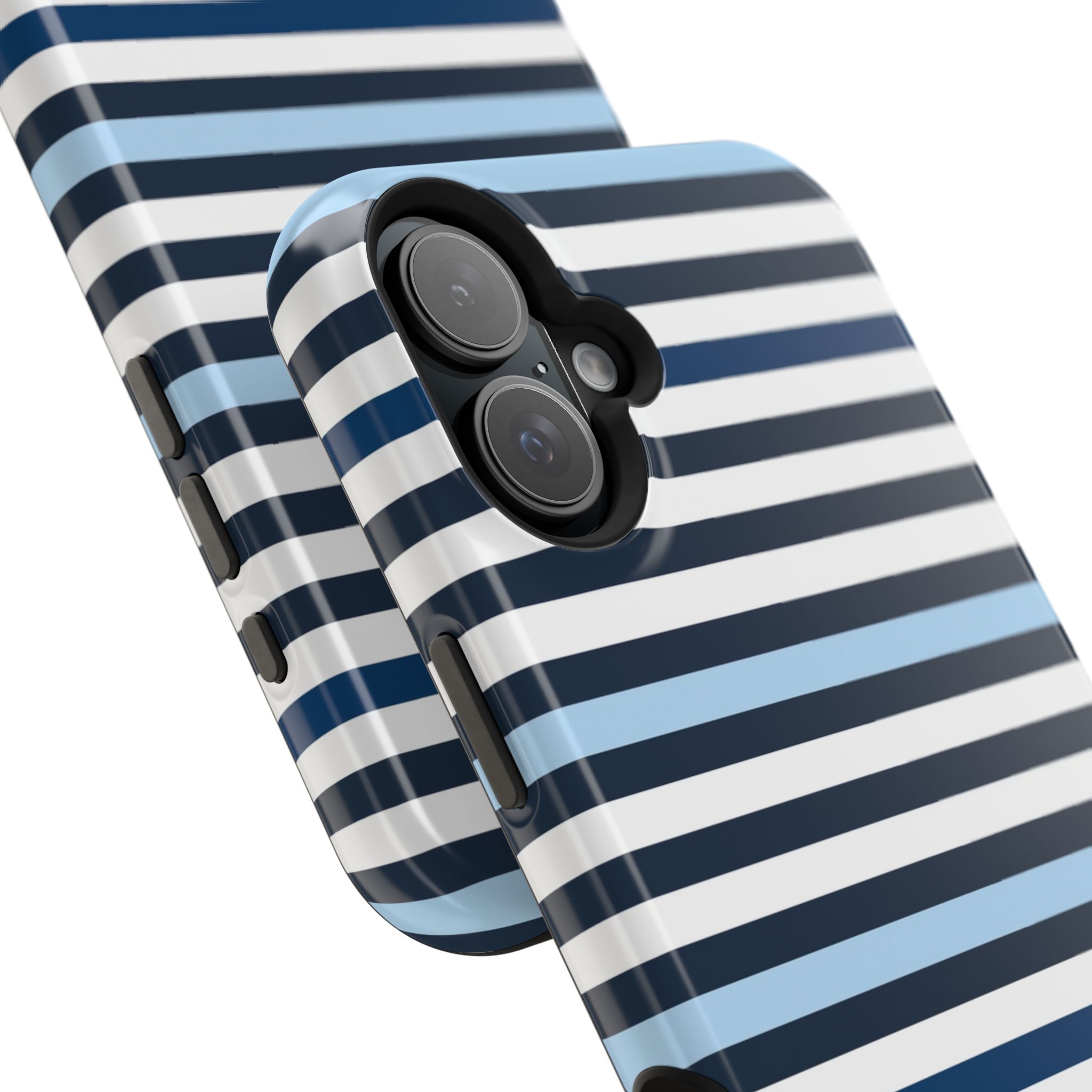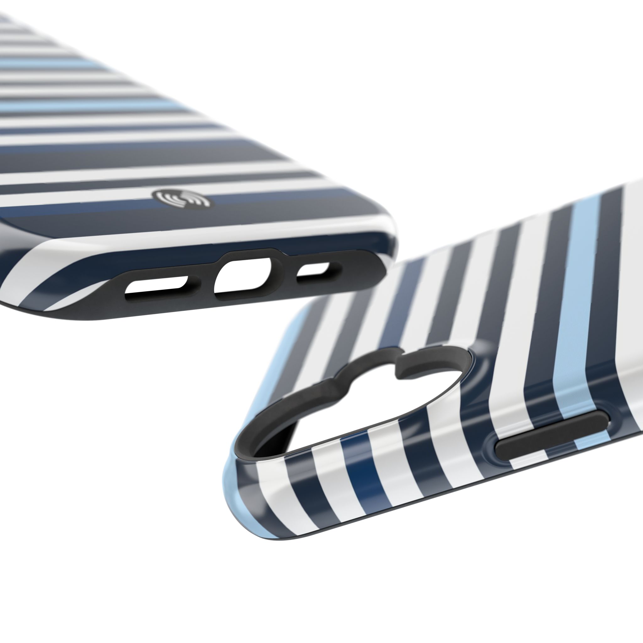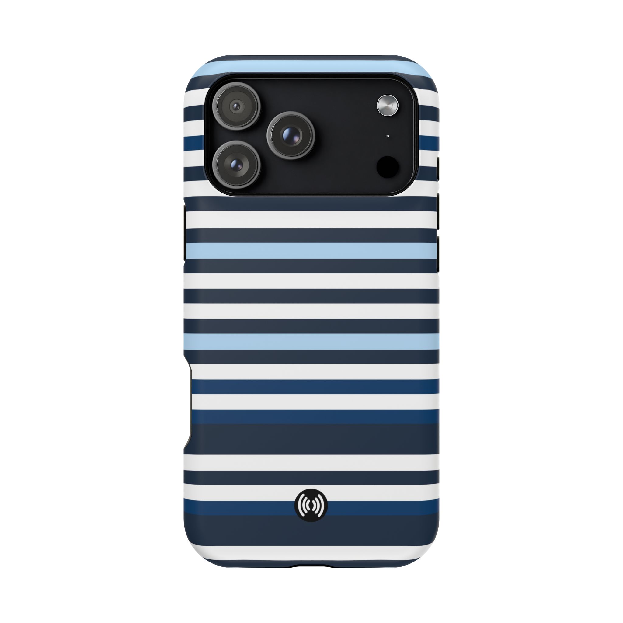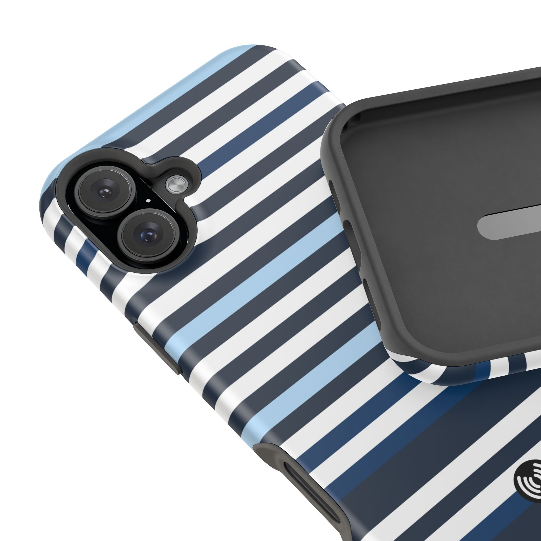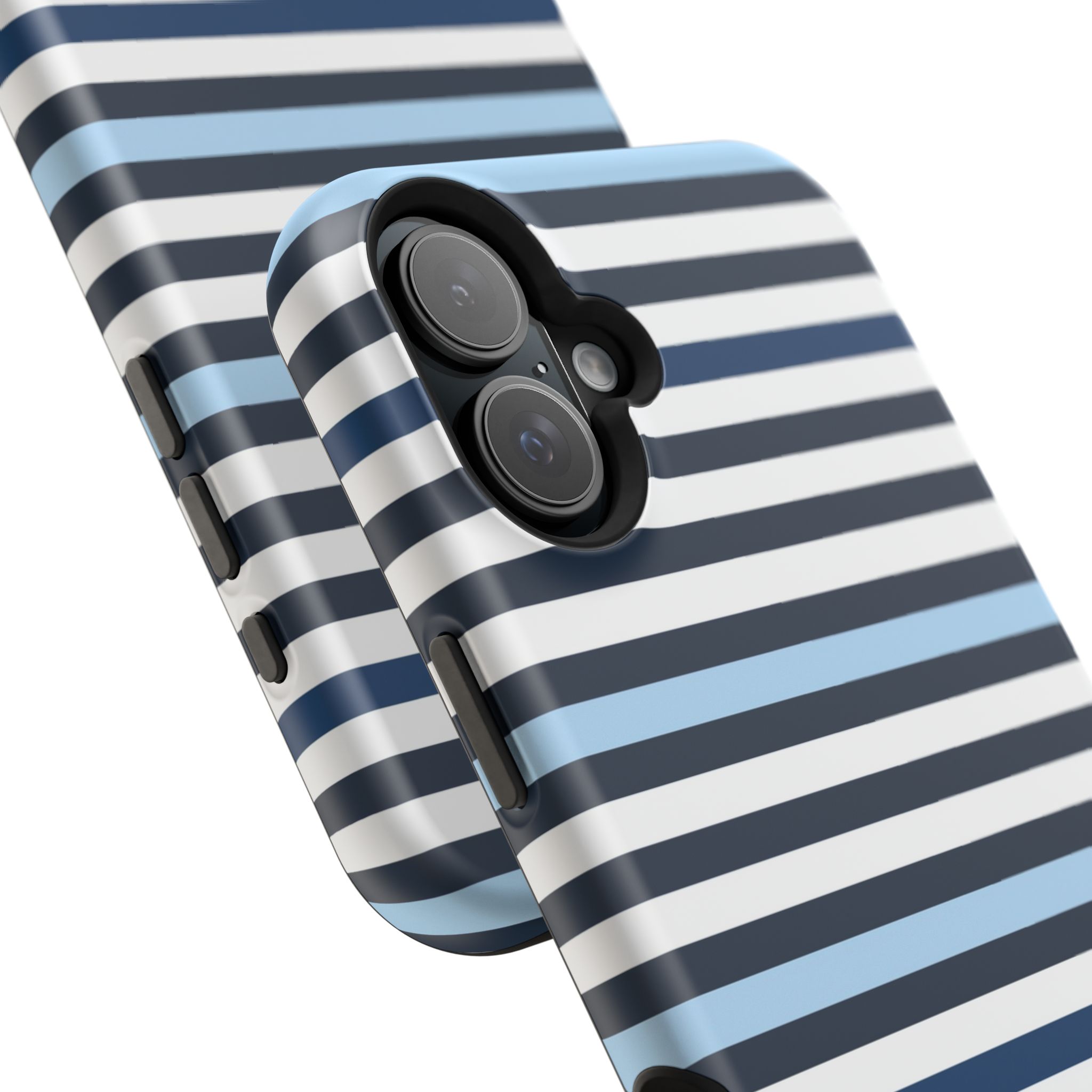 This slim, impact-resistant phone case brings everyday reliability with a calm, coastal look. The soft navy and sky-blue stripes wrap the edges for a seamless, full-coverage print that feels both modern and quietly familiar. Built as a dual-layer shell — a rigid polycarbonate exterior with a cushioned TPU inner liner — it absorbs bumps and resists scratches while keeping your phone lightweight and pocket-friendly. A glossy or matte finish lets you choose a sleek shine or a low-reflective texture. Embedded magnets make it work with MagSafe® accessories so charging and mounts sit right where they should. For people who move between café tables and commuter trains, this case blends polished design with protective engineering, keeping your device secure without shouting for attention.
