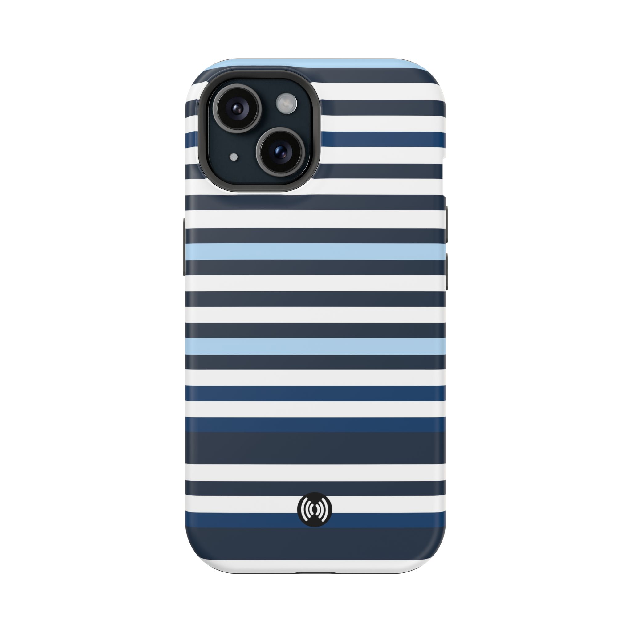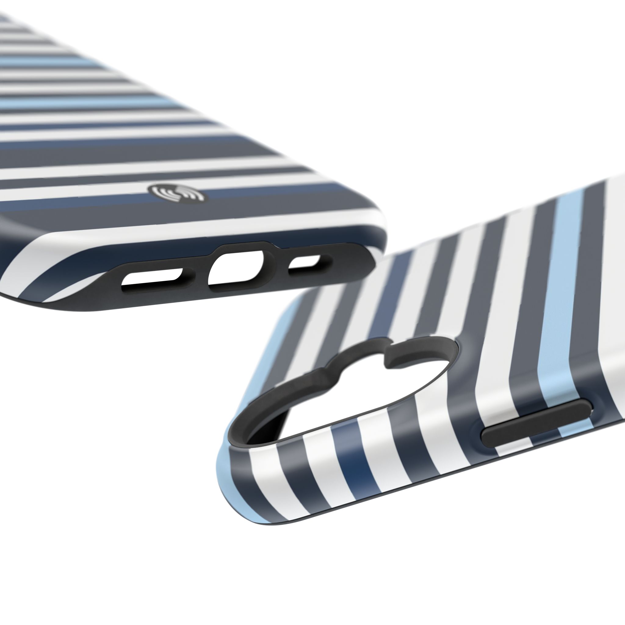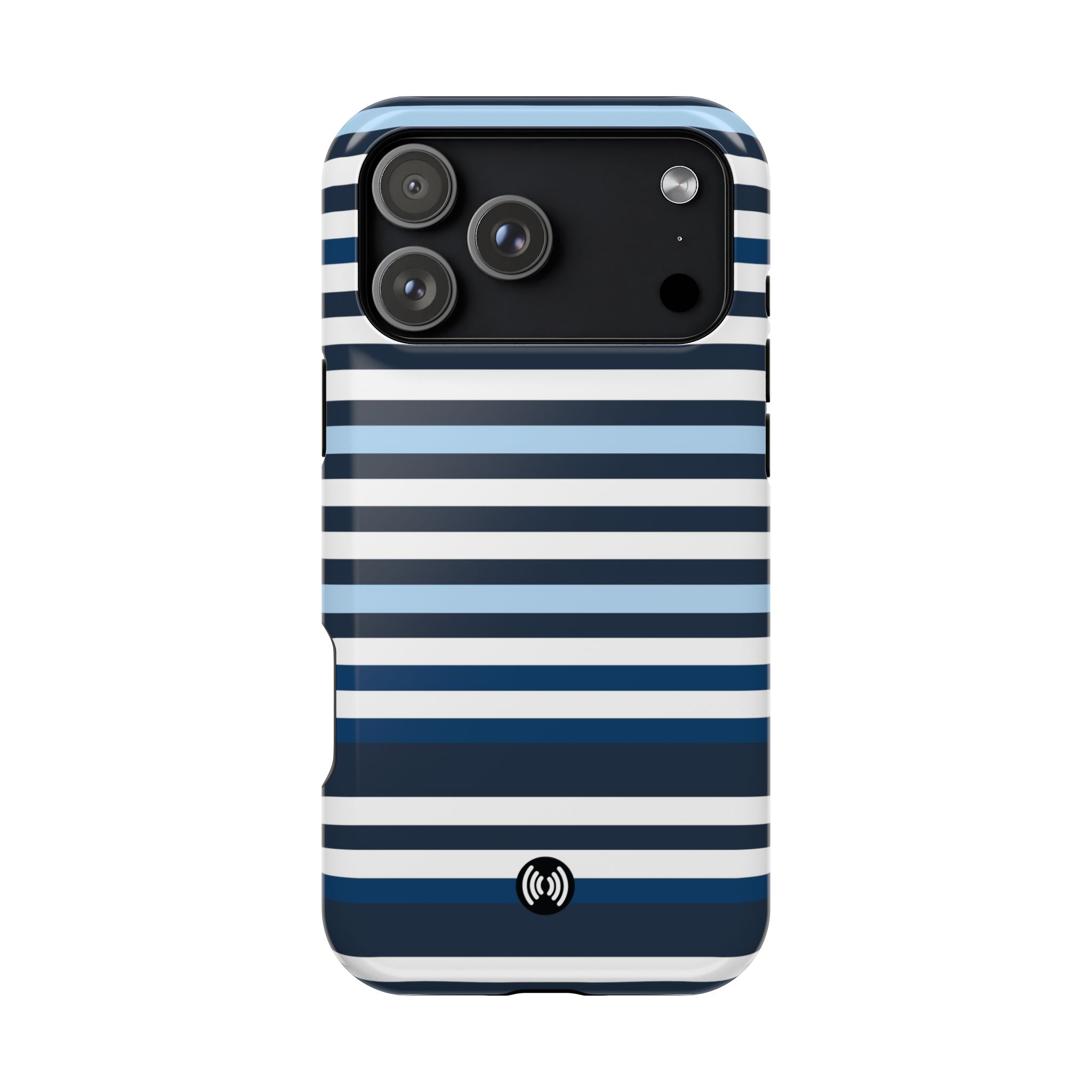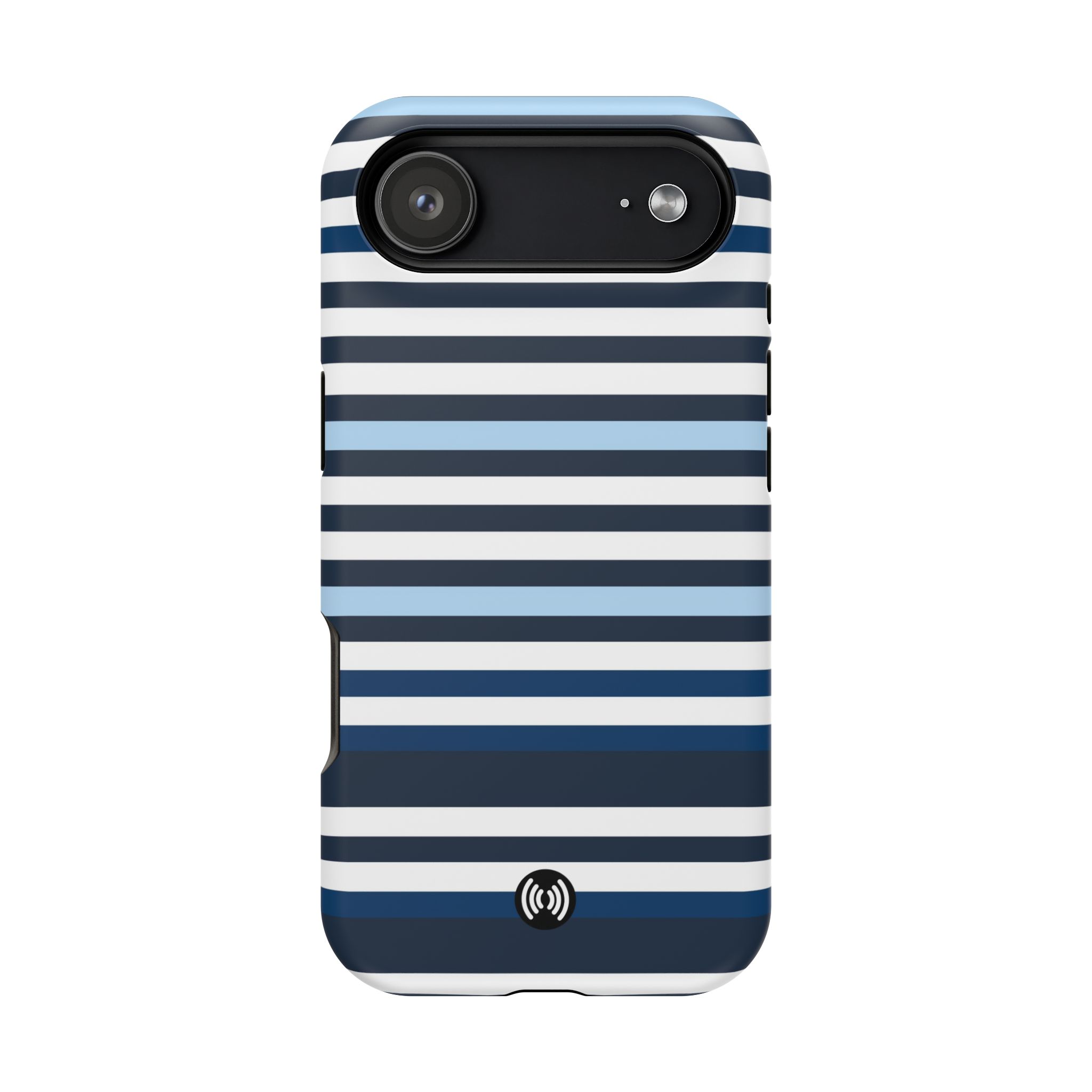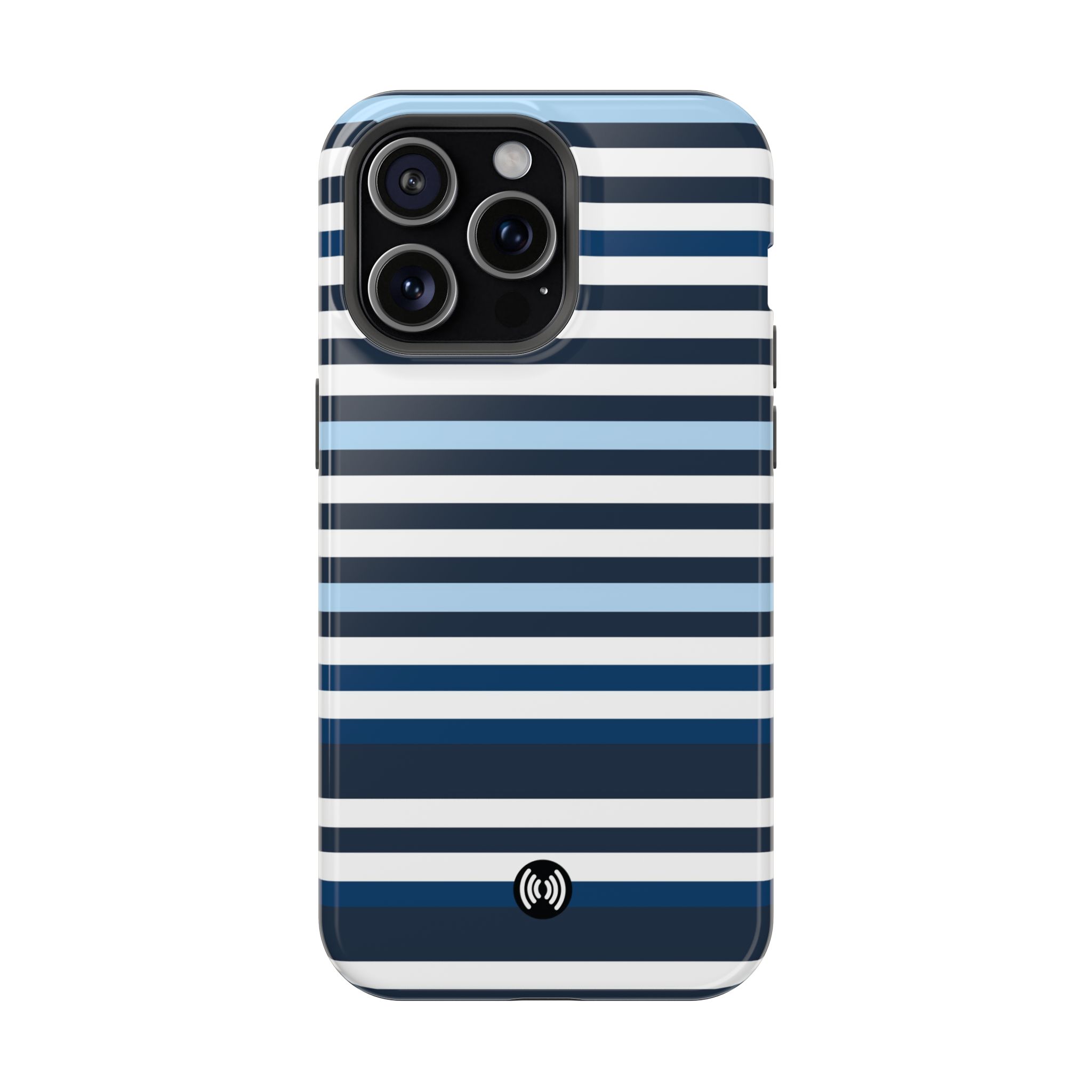 This slim, impact-resistant phone case brings everyday reliability with a calm, coastal look. The soft navy and sky-blue stripes wrap the edges for a seamless, full-coverage print that feels both modern and quietly familiar. Built as a dual-layer shell — a rigid polycarbonate exterior with a cushioned TPU inner liner — it absorbs bumps and resists scratches while keeping your phone lightweight and pocket-friendly. A glossy or matte finish lets you choose a sleek shine or a low-reflective texture. Embedded magnets make it work with MagSafe® accessories so charging and mounts sit right where they should. For people who move between café tables and commuter trains, this case blends polished design with protective engineering, keeping your device secure without shouting for attention.