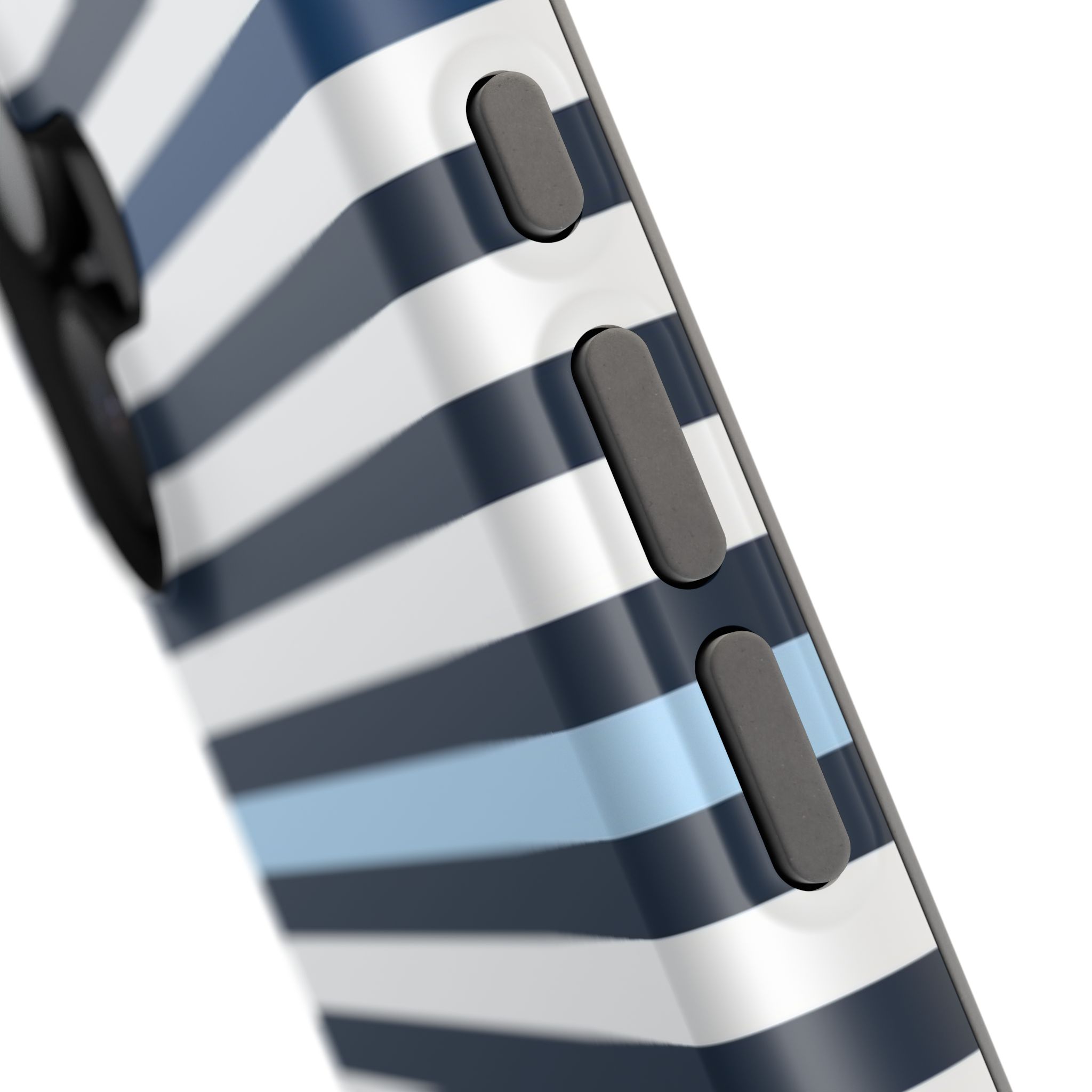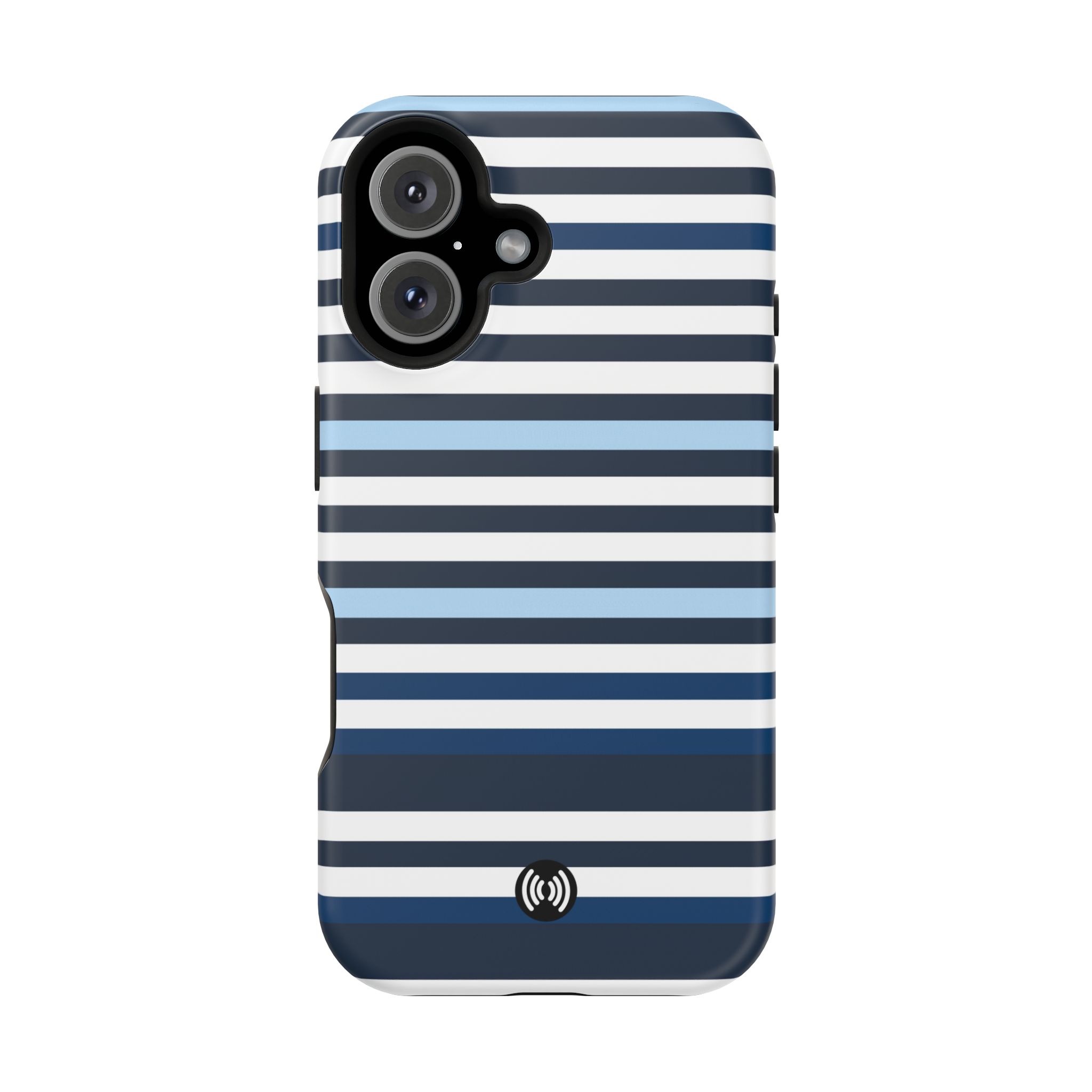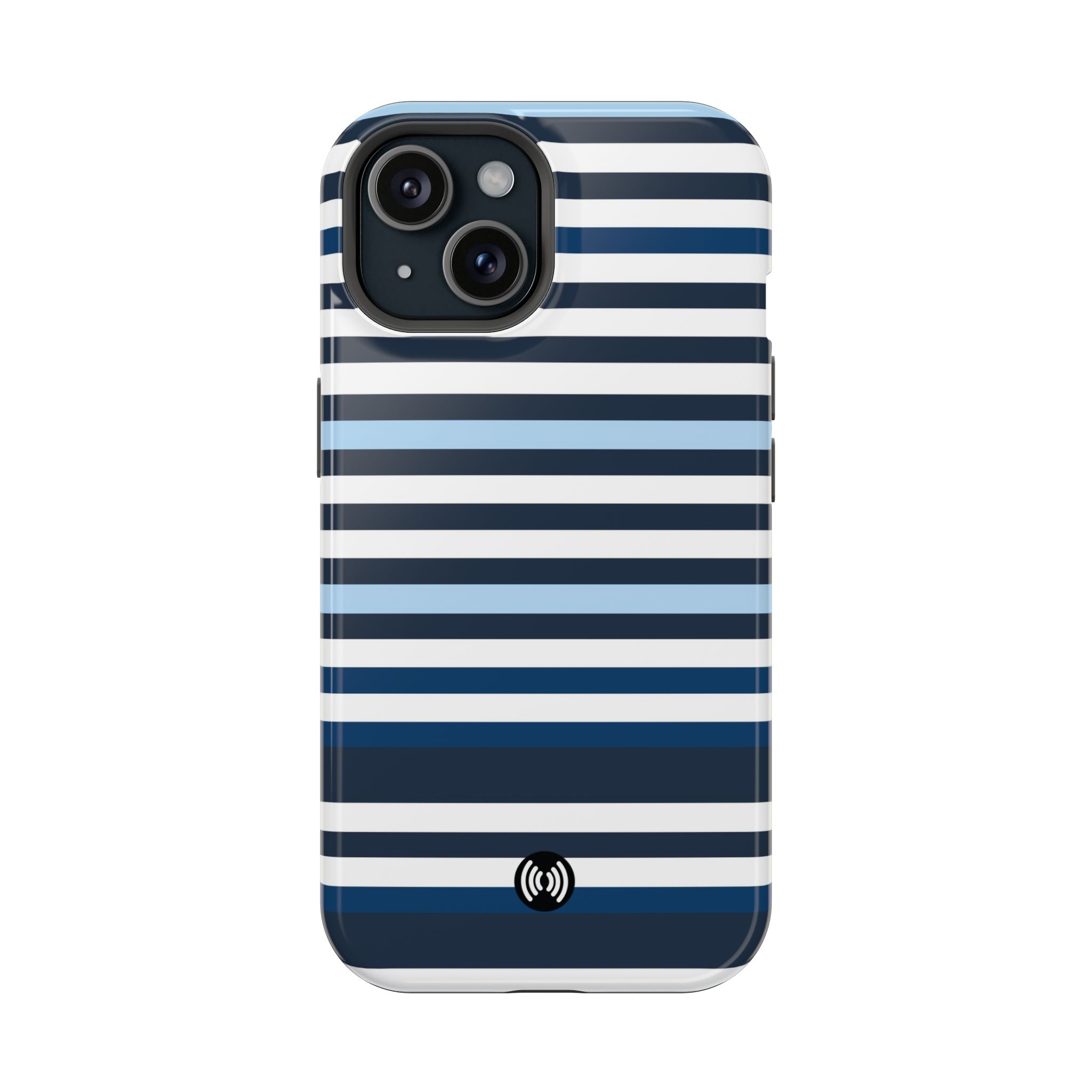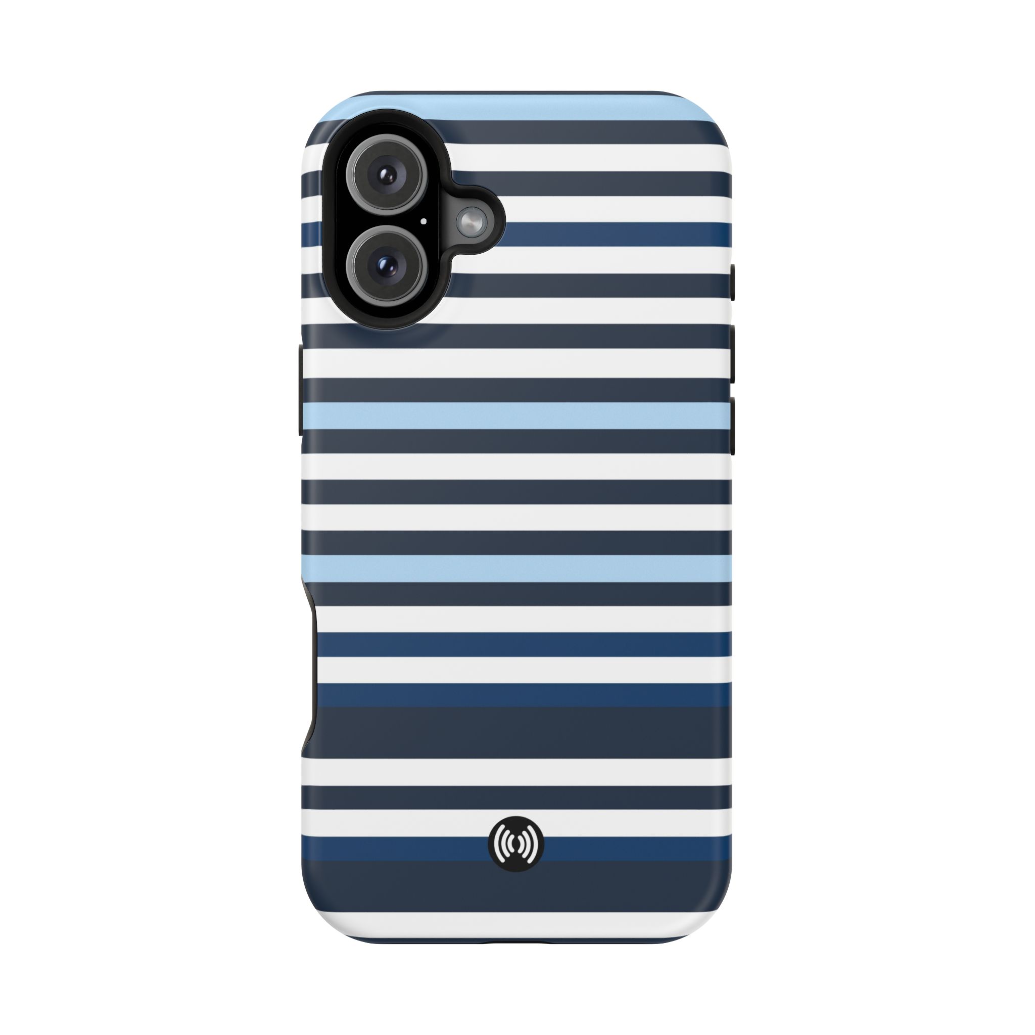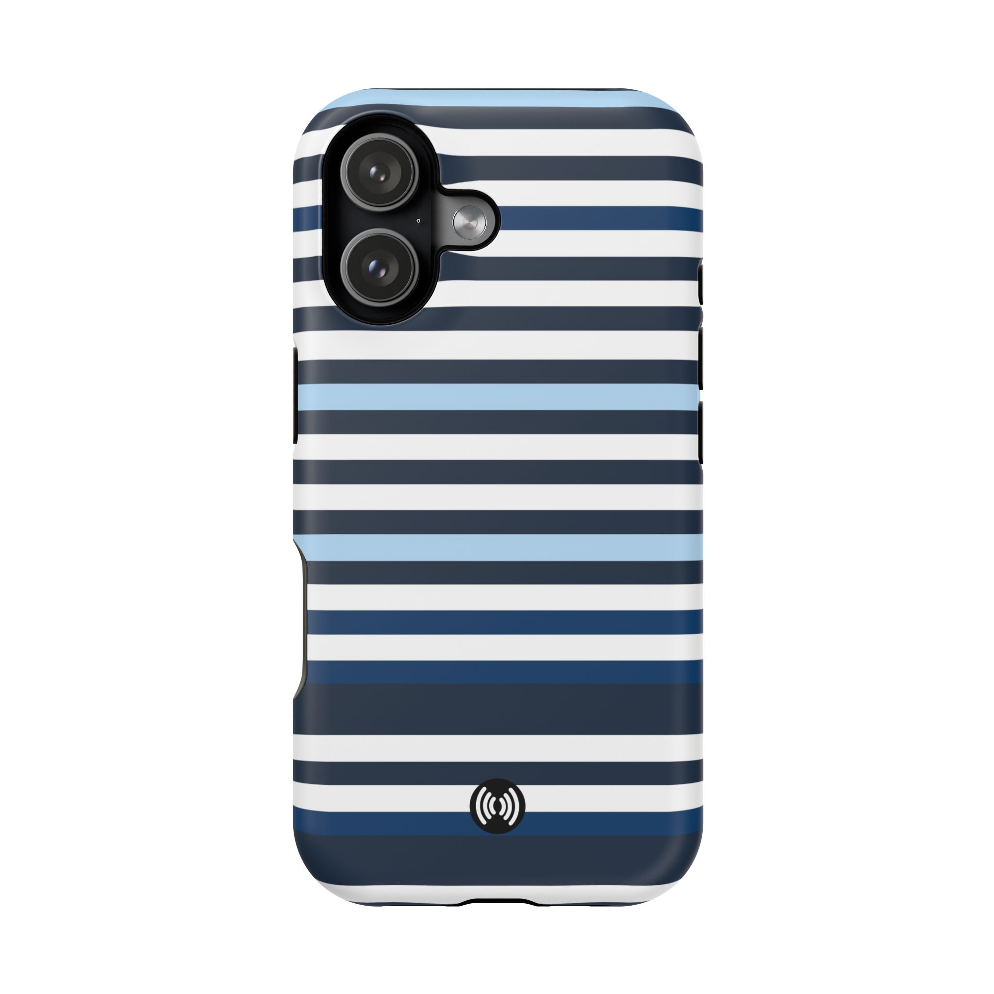 This slim, impact-resistant phone case brings everyday reliability with a calm, coastal look. The soft navy and sky-blue stripes wrap the edges for a seamless, full-coverage print that feels both modern and quietly familiar. Built as a dual-layer shell — a rigid polycarbonate exterior with a cushioned TPU inner liner — it absorbs bumps and resists scratches while keeping your phone lightweight and pocket-friendly. A glossy or matte finish lets you choose a sleek shine or a low-reflective texture. Embedded magnets make it work with MagSafe® accessories so charging and mounts sit right where they should. For people who move between café tables and commuter trains, this case blends polished design with protective engineering, keeping your device secure without shouting for attention.