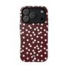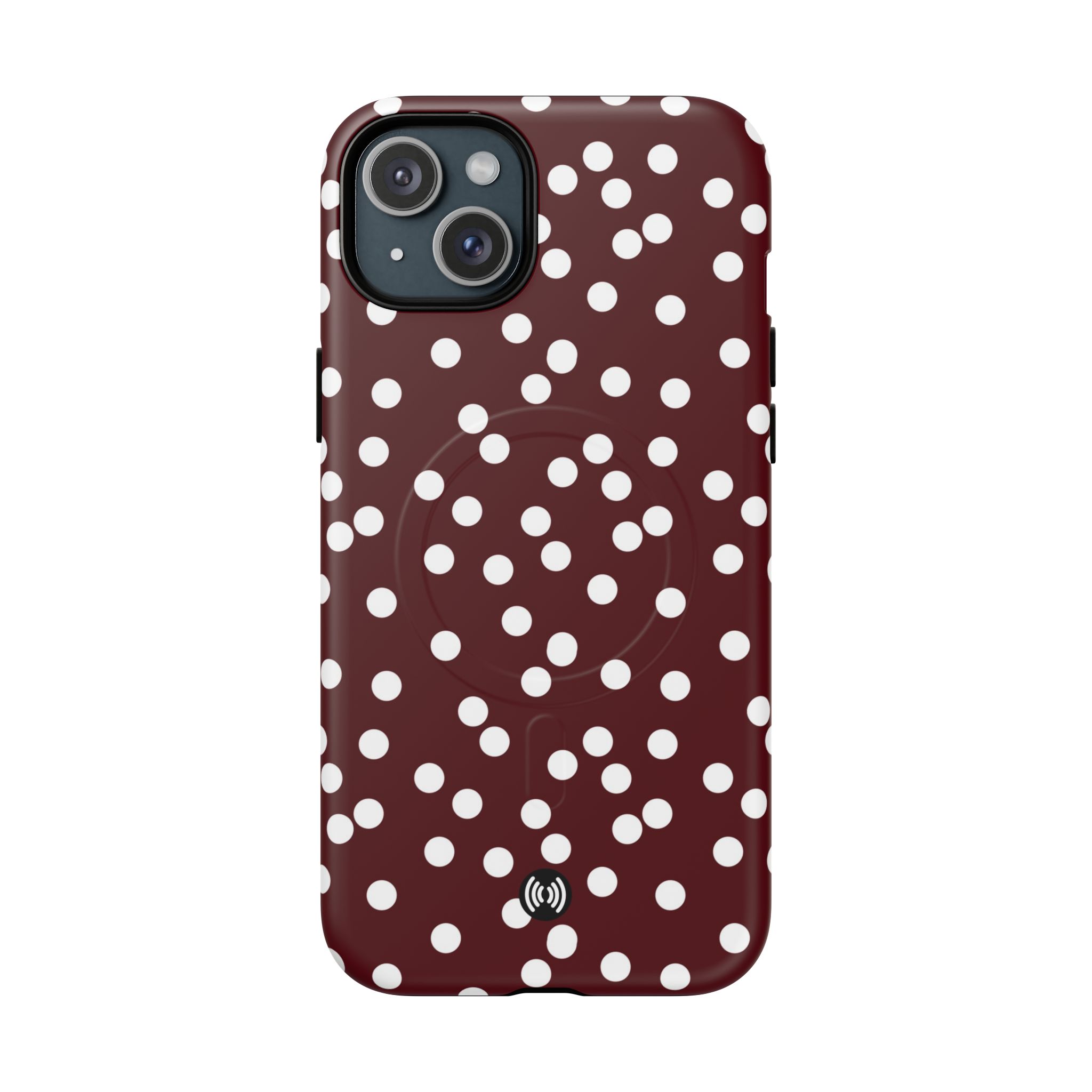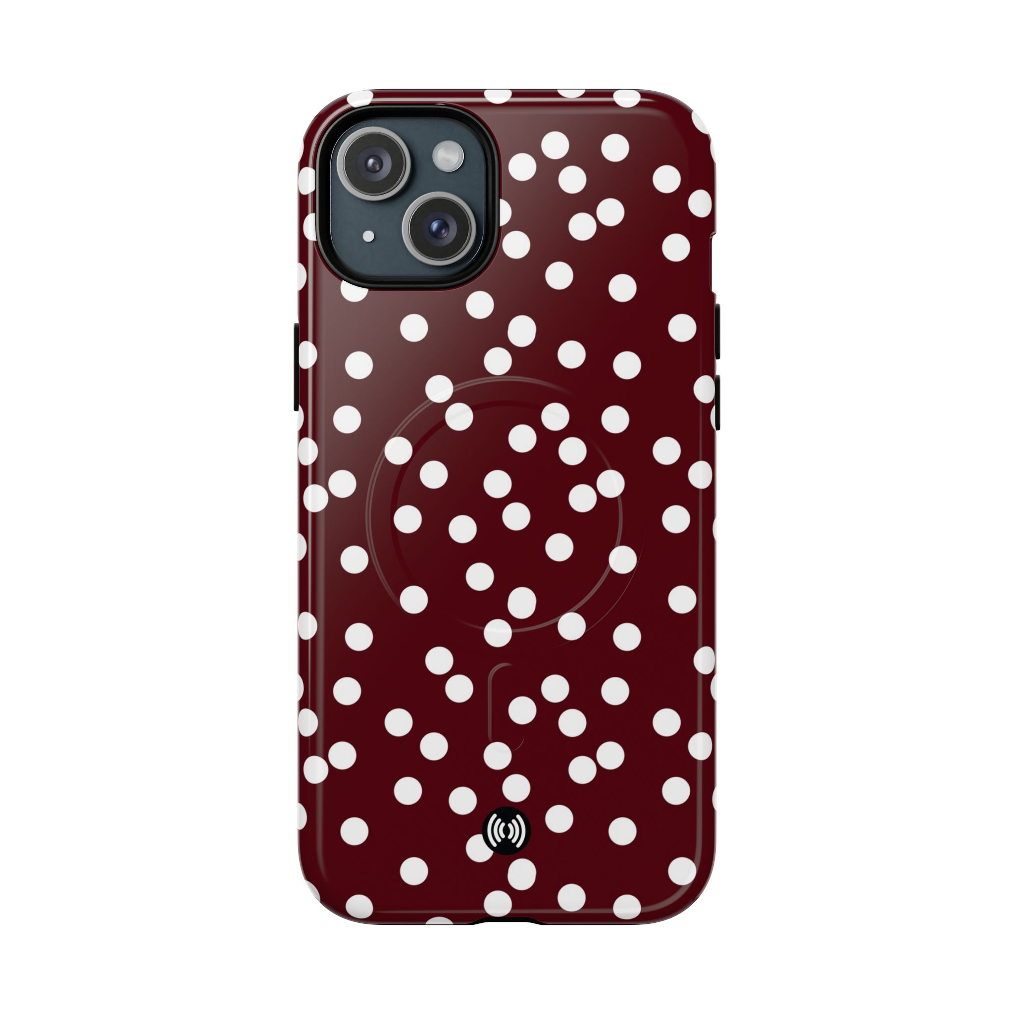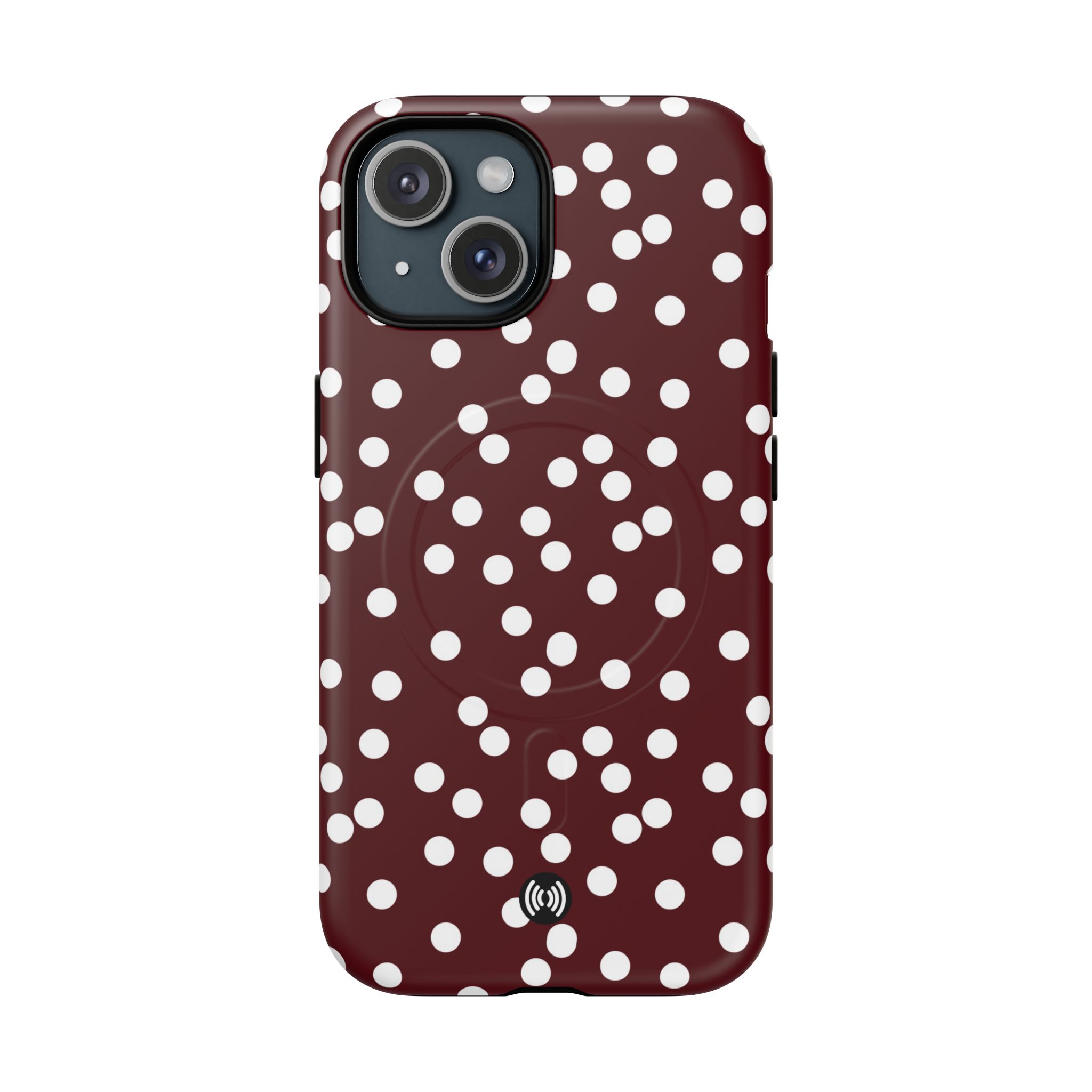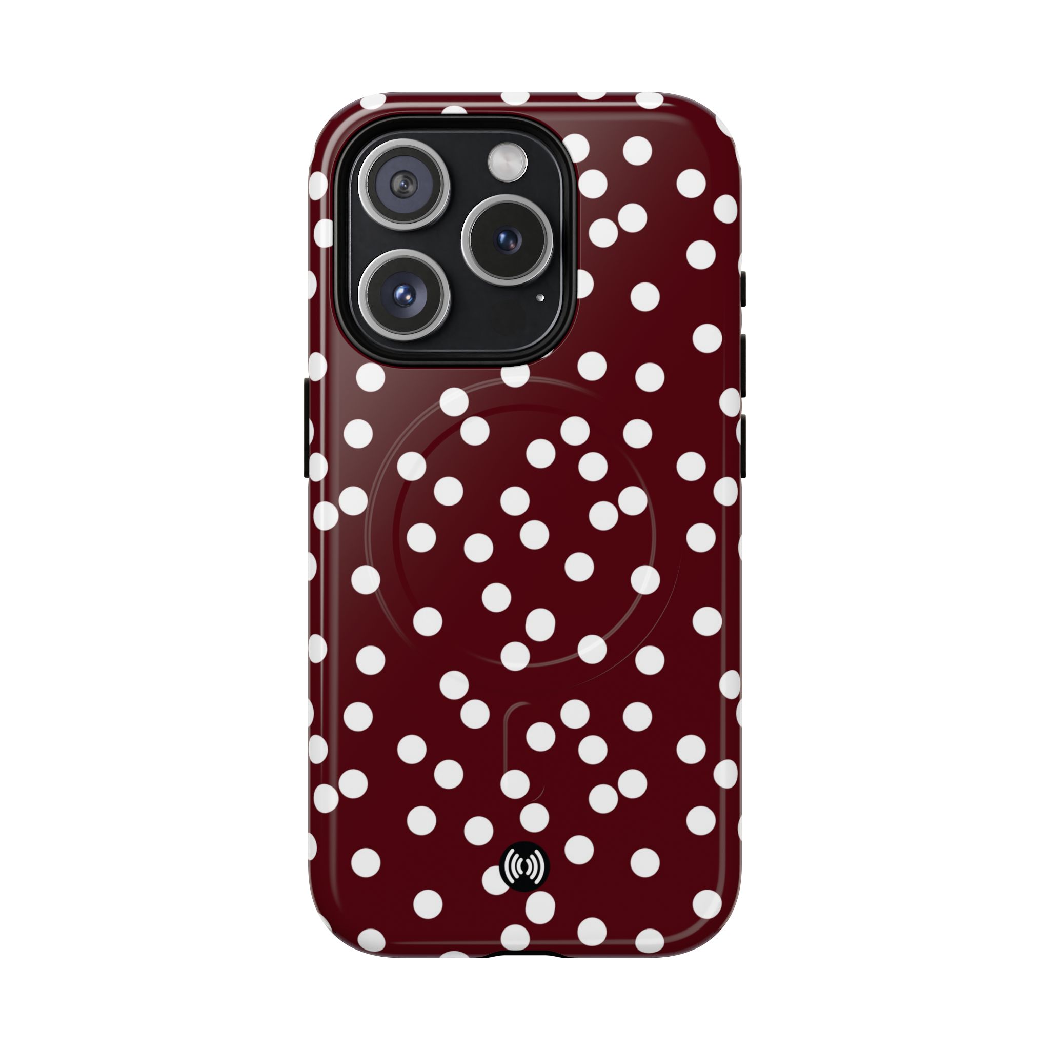 This slim, protective phone case wraps your iPhone in confident, tactile armor while showing off a playful polka-dot design. The glossy/matte shell melds a deep burgundy background with crisp white dots that ripple across the surface — lively yet refined. Inside, a soft TPU liner cushions against drops and everyday bumps while the hard polycarbonate shell resists scratches and impacts. The built-in magnetic module works with MagSafe® accessories for easy snap-on charging and mounts. Clear, accessible ports and precise cutouts keep your phone fully usable without removing the case. It arrives ready for grown-up usage and fits the latest iPhone 17 series models.