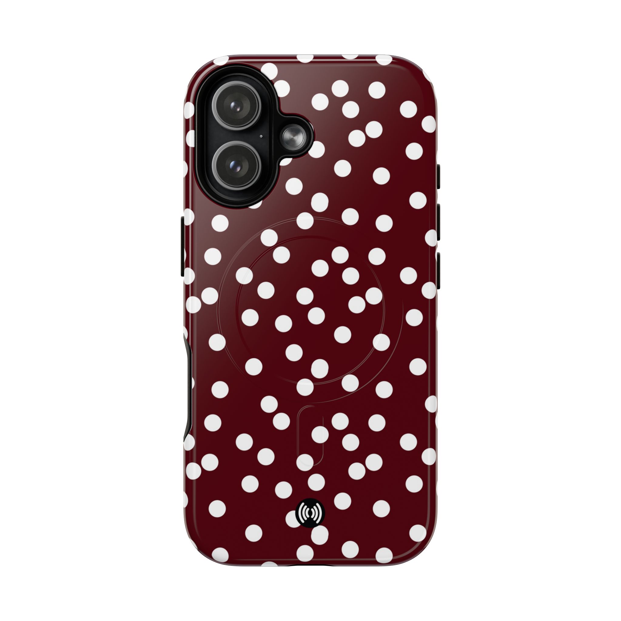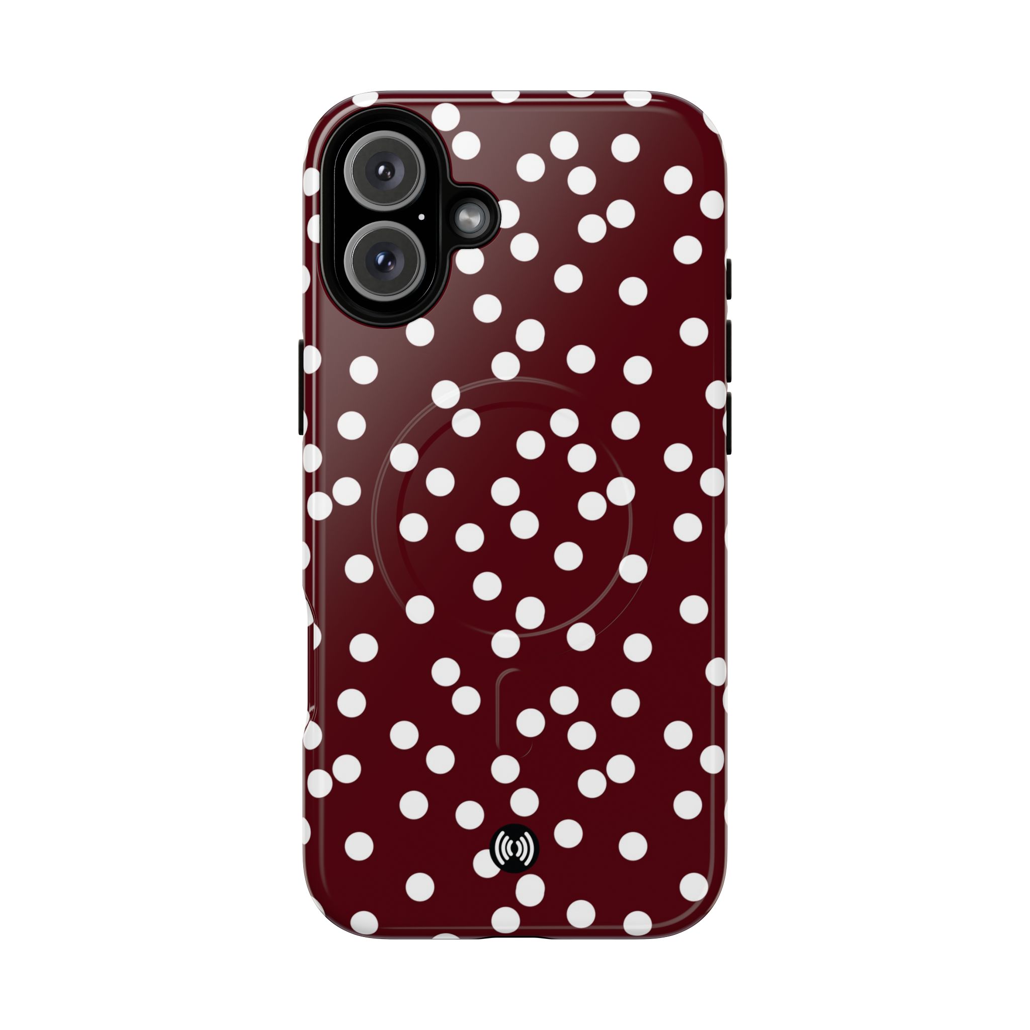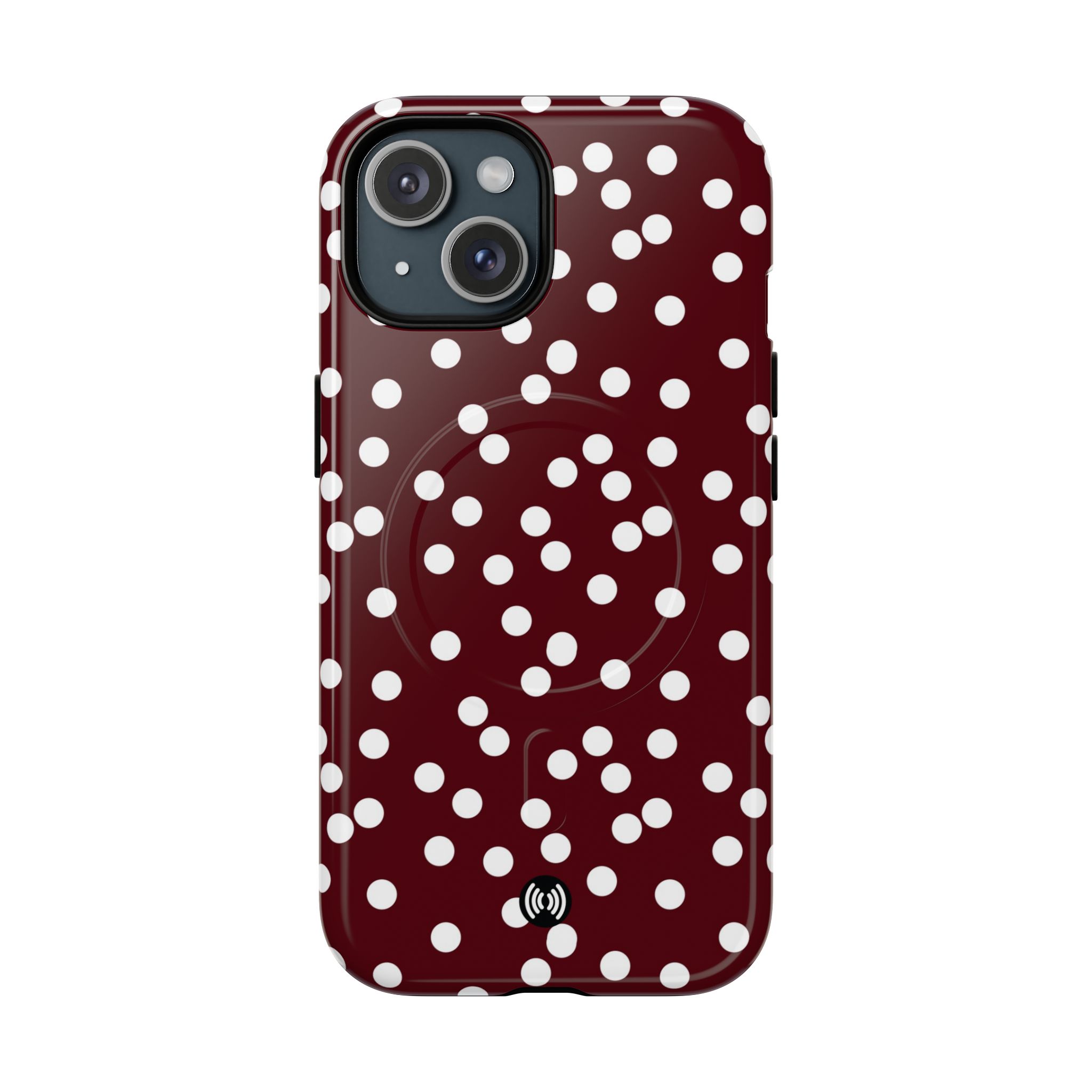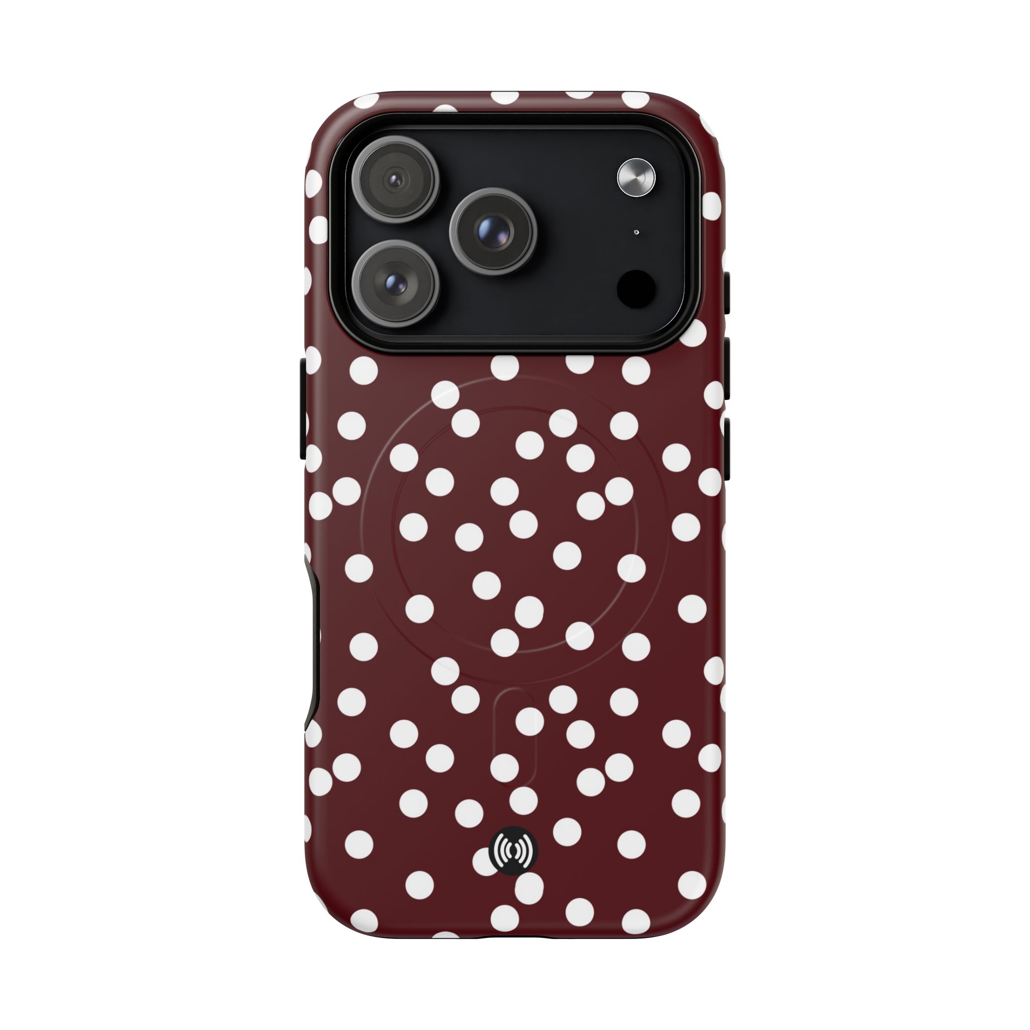 A slim, protective phone case that blends confident protection with playful style. The deep burgundy background is peppered with irregular white dots, giving a lively, hand-painted look that feels both modern and warm. Dual-layer construction—rigid polycarbonate shell with a soft TPU silicone liner—cushions against drops while the 3D wrap print preserves vibrant color across every edge. A built-in magnetic module works with MagSafe® accessories for effortless attachment, and precise cutouts keep ports and buttons accessible. Choose glossy for a polished shine or matte for a softer, satiny finish. This case brings durable, everyday protection with a spirited, artful pattern that stands out without shouting.