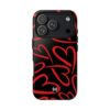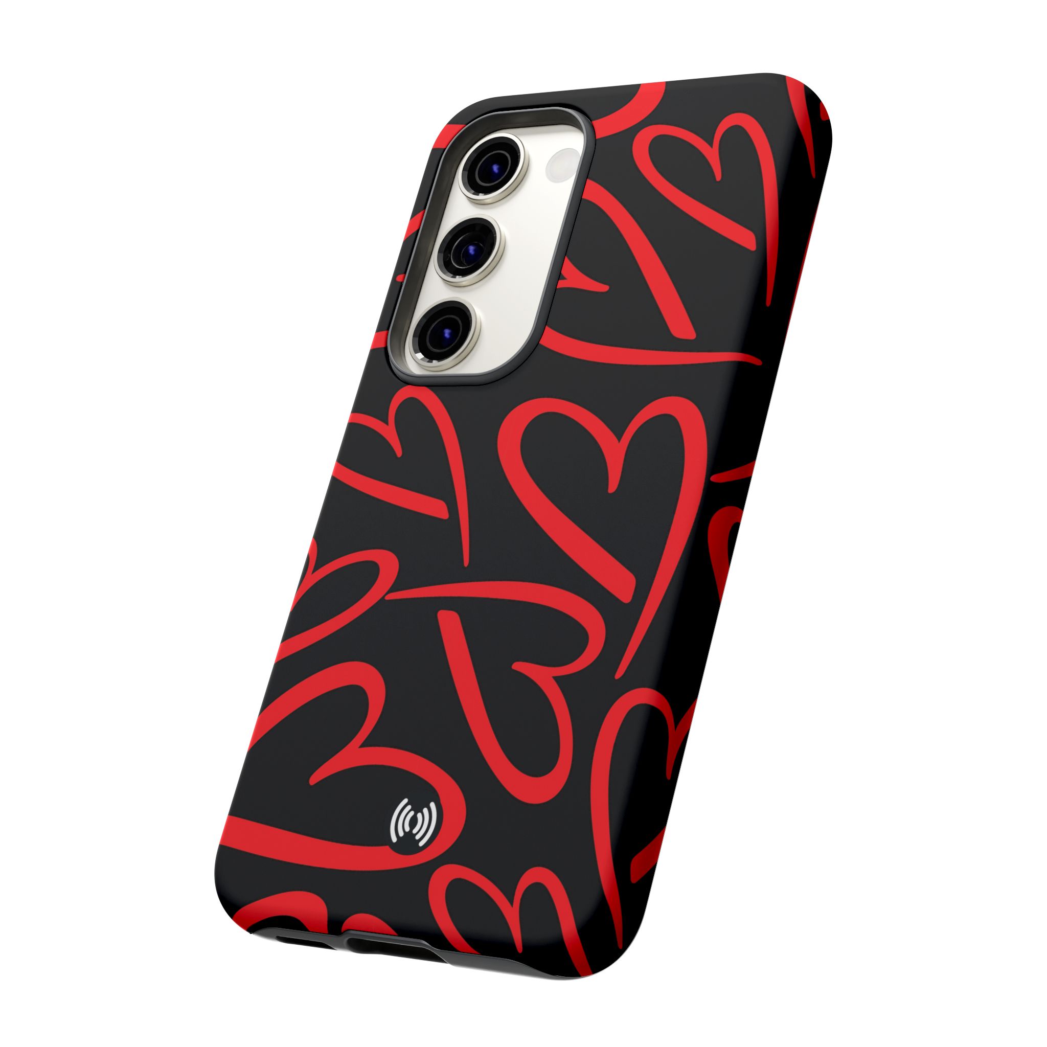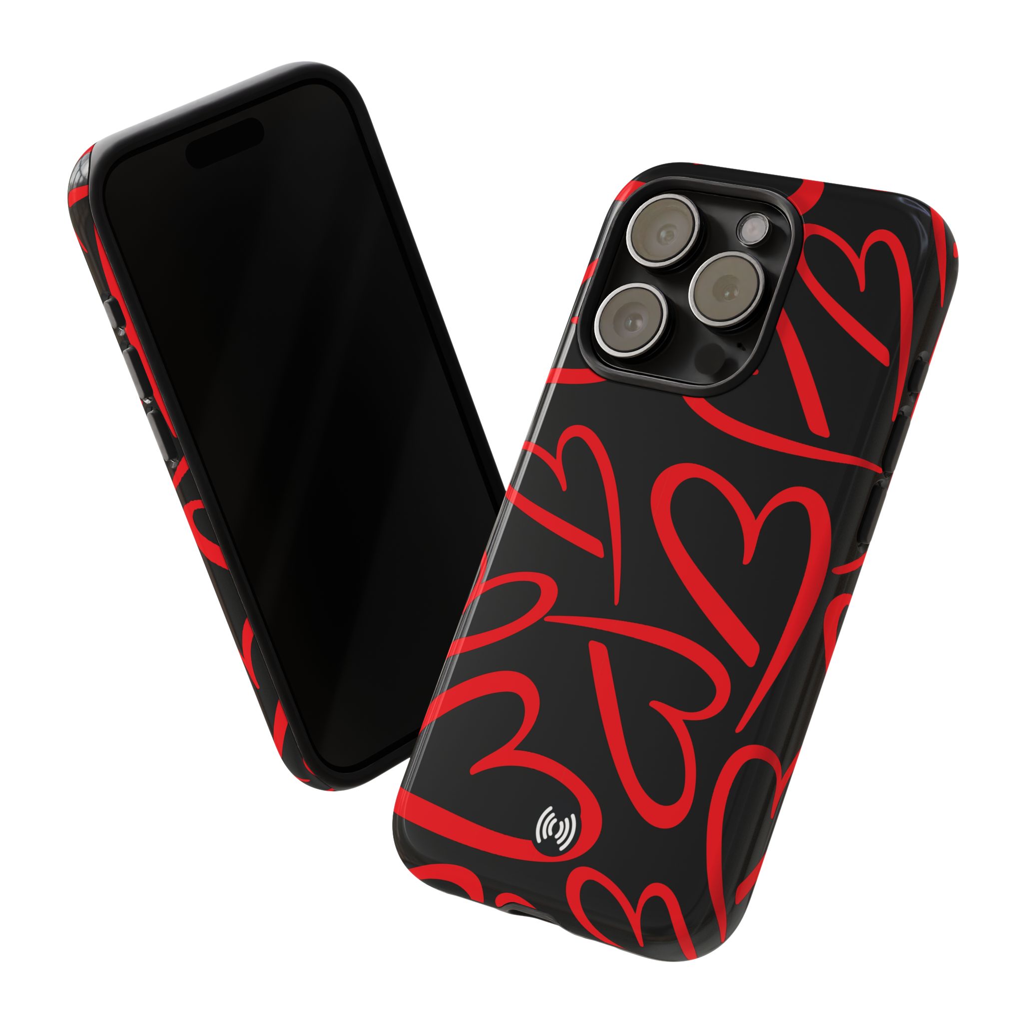 This protective phone case brings bold, hand-drawn energy to everyday carry. Wrapped edge-to-edge with looping red heart outlines on a black base, the graphic pattern feels modern, expressive, and playful—statement-making without trying too hard.