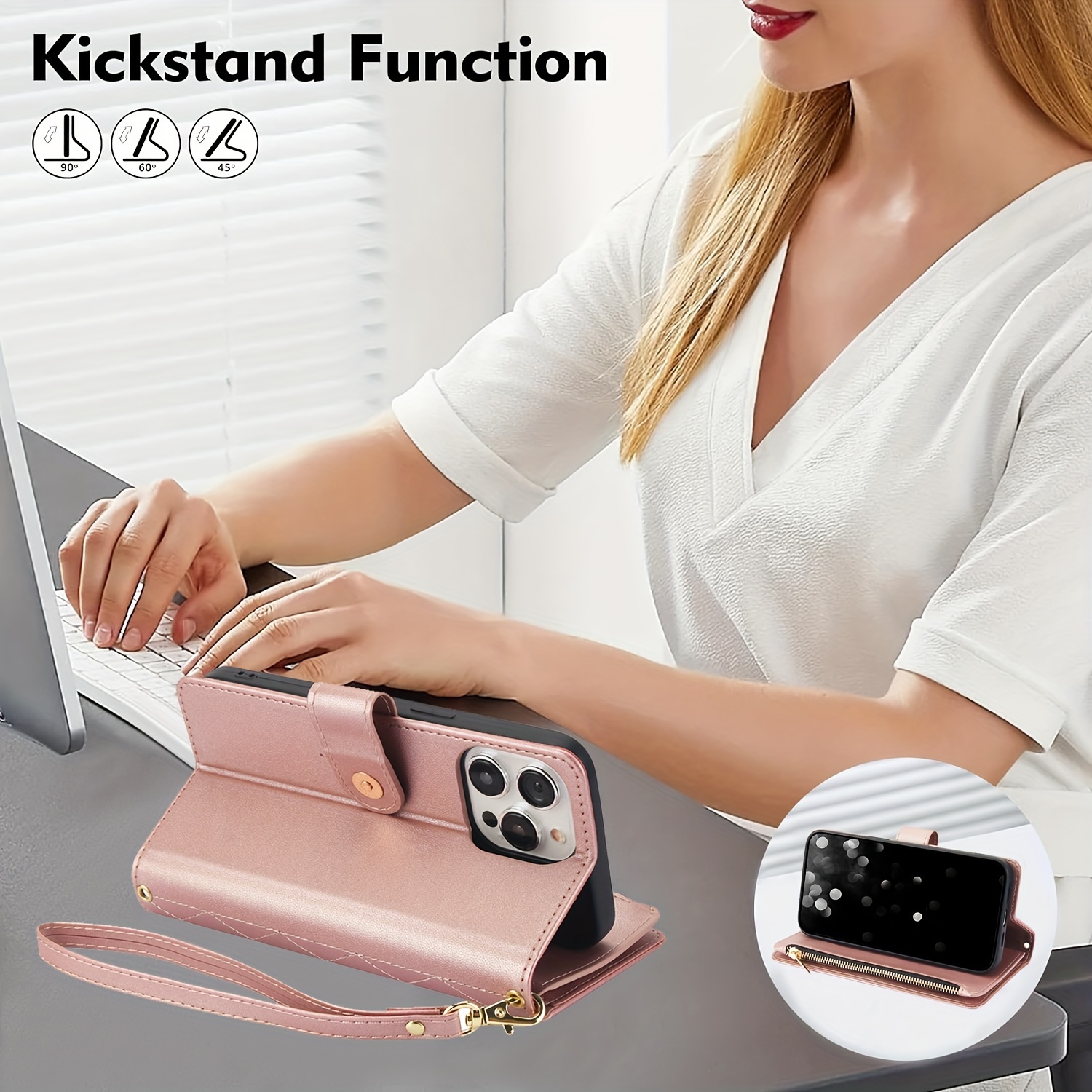 Enjoy flexible carrying options with the detachable wrist strap and adjustable crossbody strap, perfect for hands-free shopping, traveling, or daily errands. The shockproof inner shell adds full protection against drops and scratches, while the flip folio design doubles as a kickstand for easy video viewing.