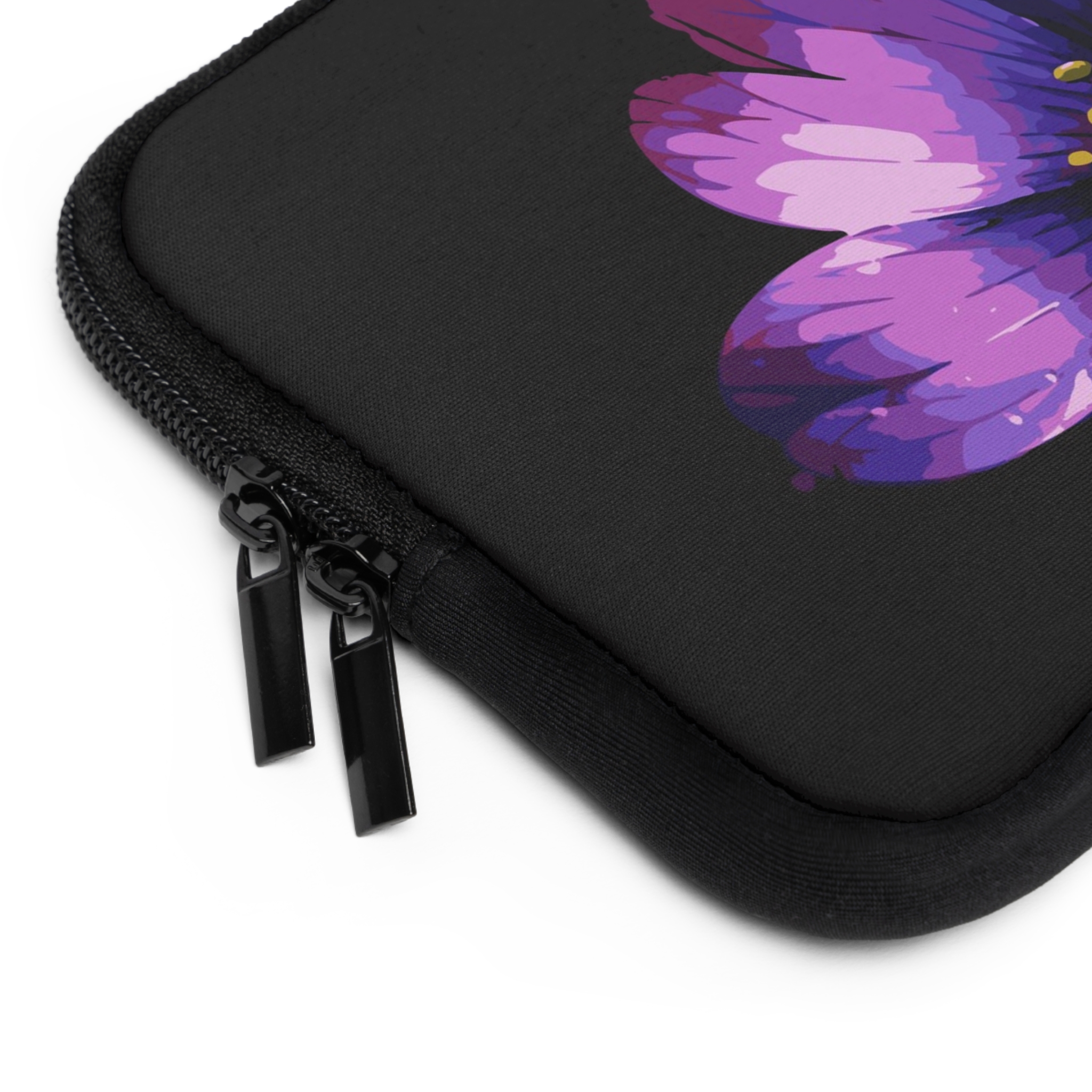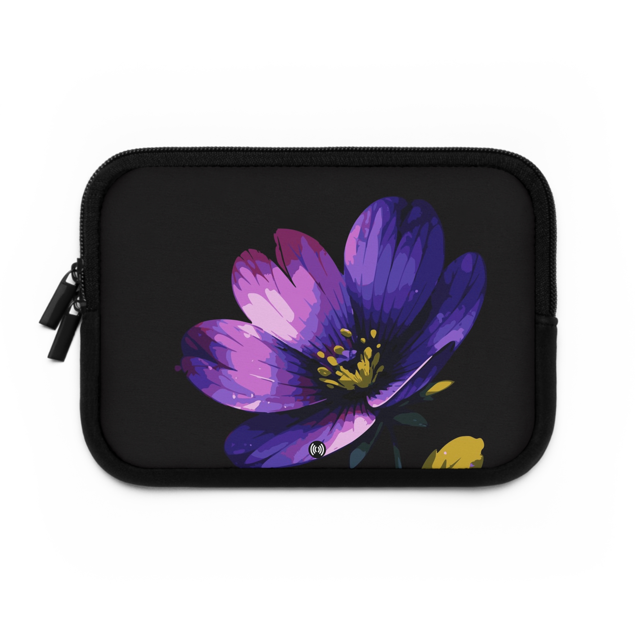 Slide your laptop into a soft, padded sleeve that feels like a quiet exhale. The rich black neoprene sets off a single painterly purple bloomābold but gentleāso your tech carries a sense of calm wherever you go.