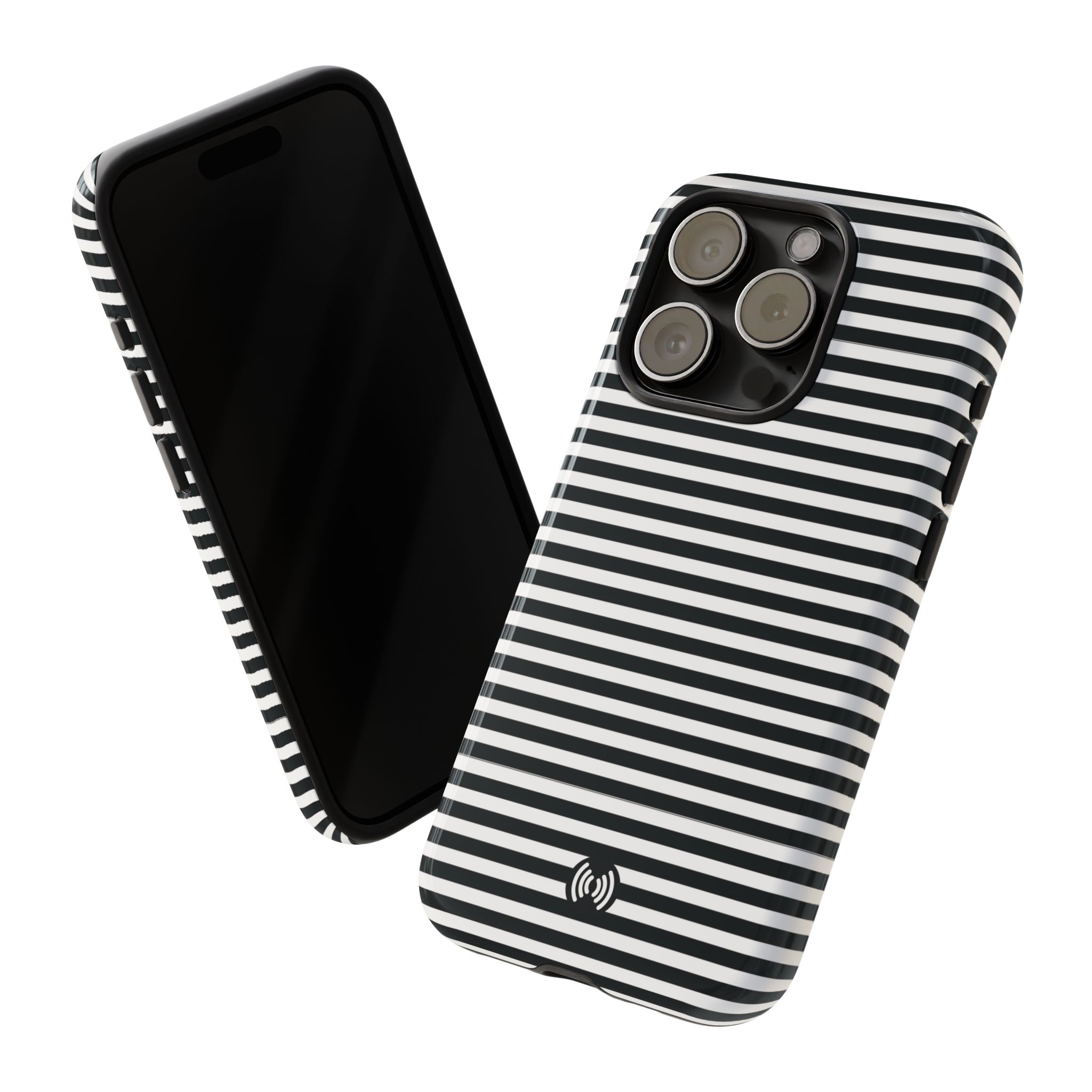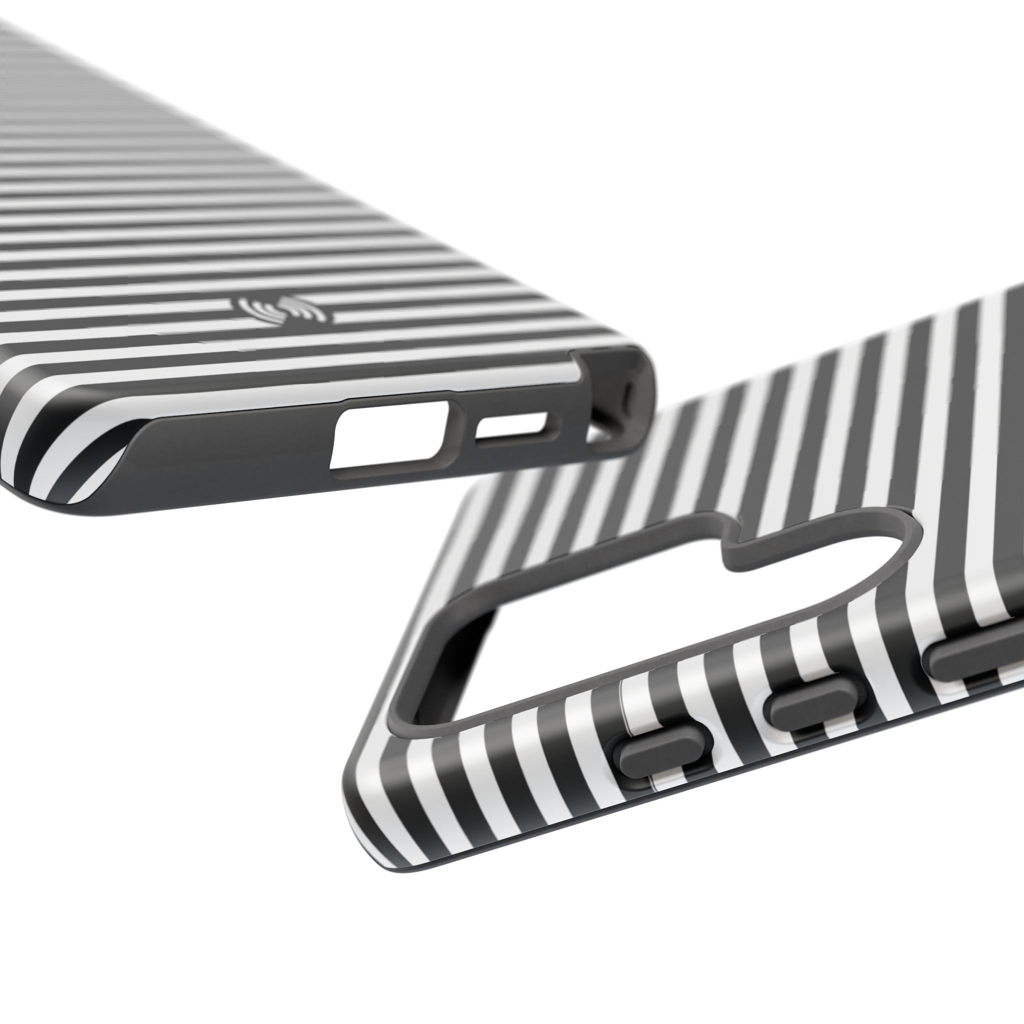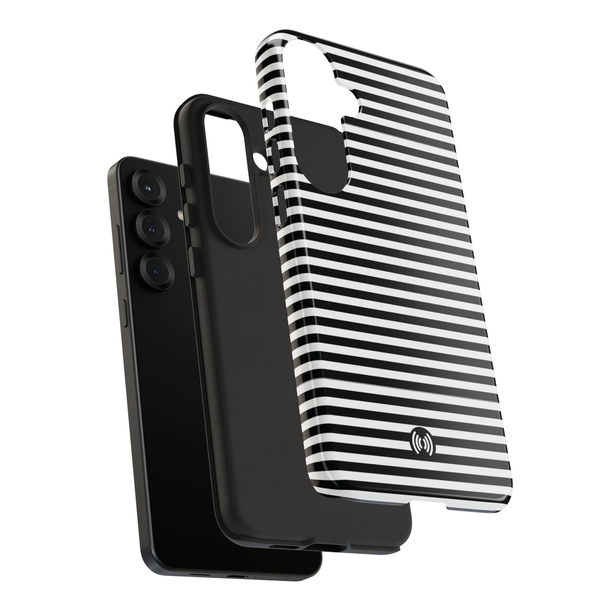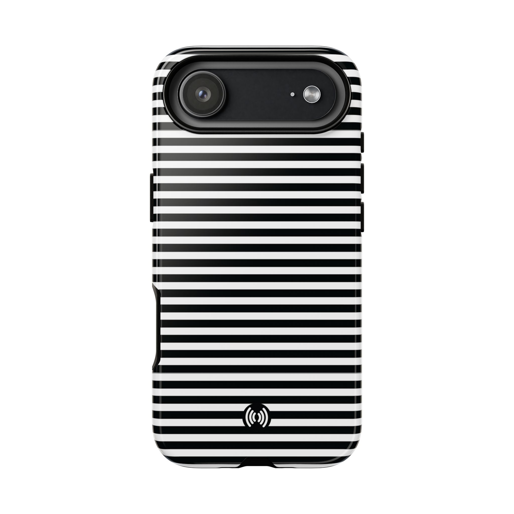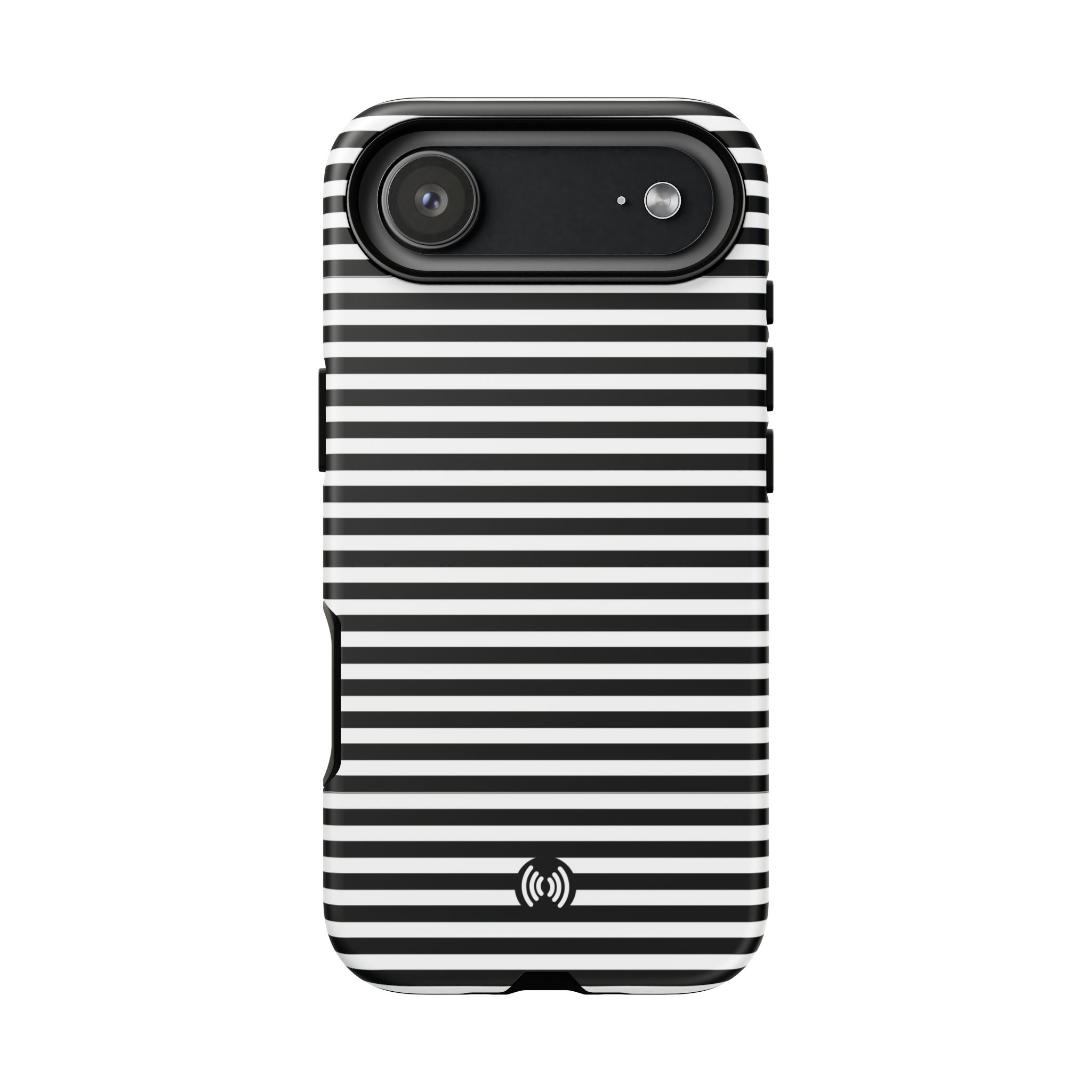 A slim, dual-layer phone case with a bold black-and-white striped design that reads modern and understated. The shell’s full-wrap print creates a seamless pattern around the edges while a soft TPU liner cushions drops. Outdoor-safe coatings resist fading so the graphic stays crisp through everyday use. It sits light in the hand, keeps ports open, and supports wireless charging — a practical everyday shield that complements a streamlined, design-forward wardrobe.