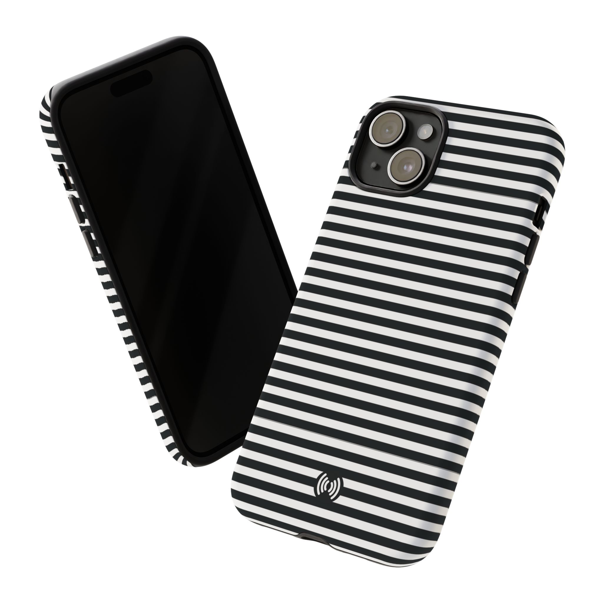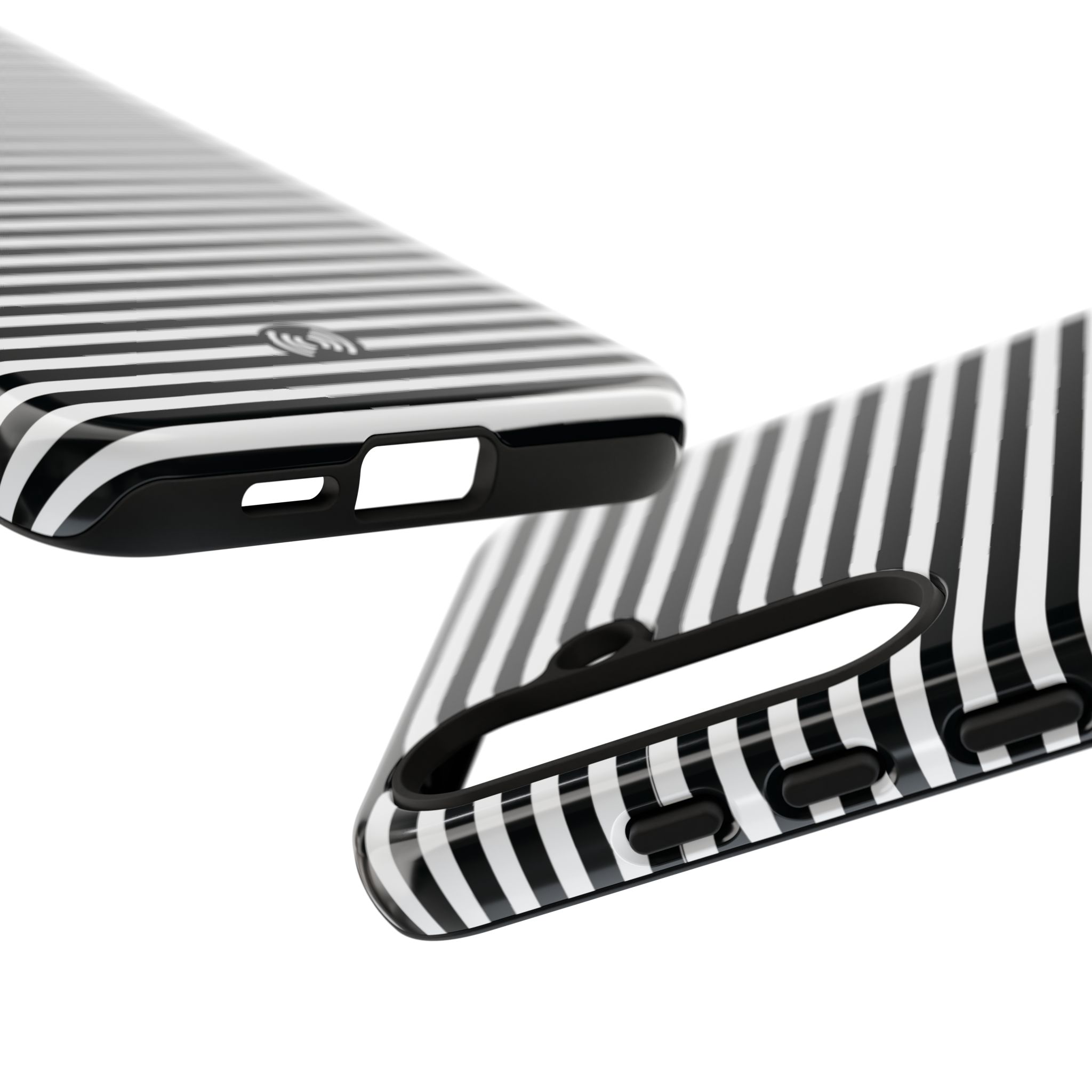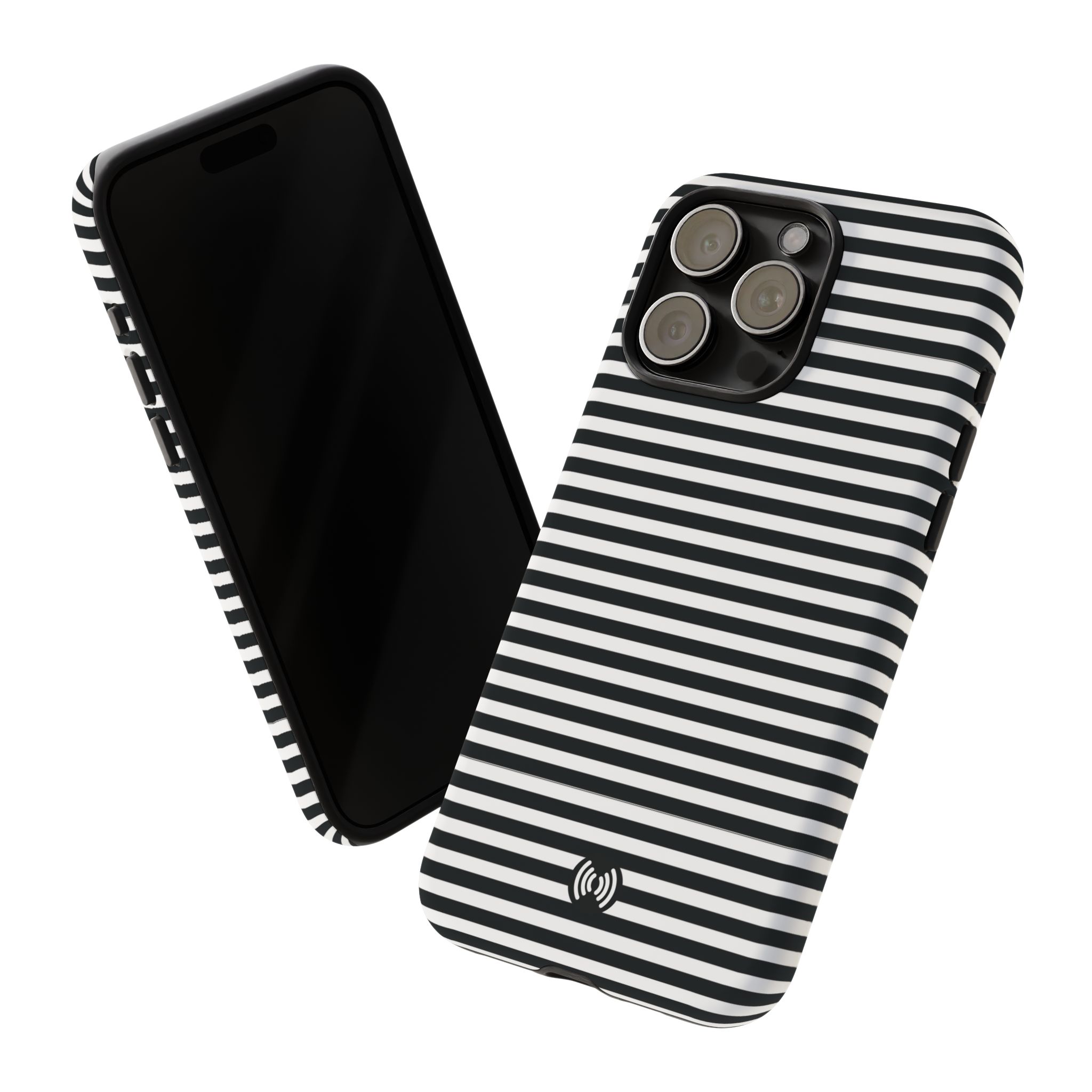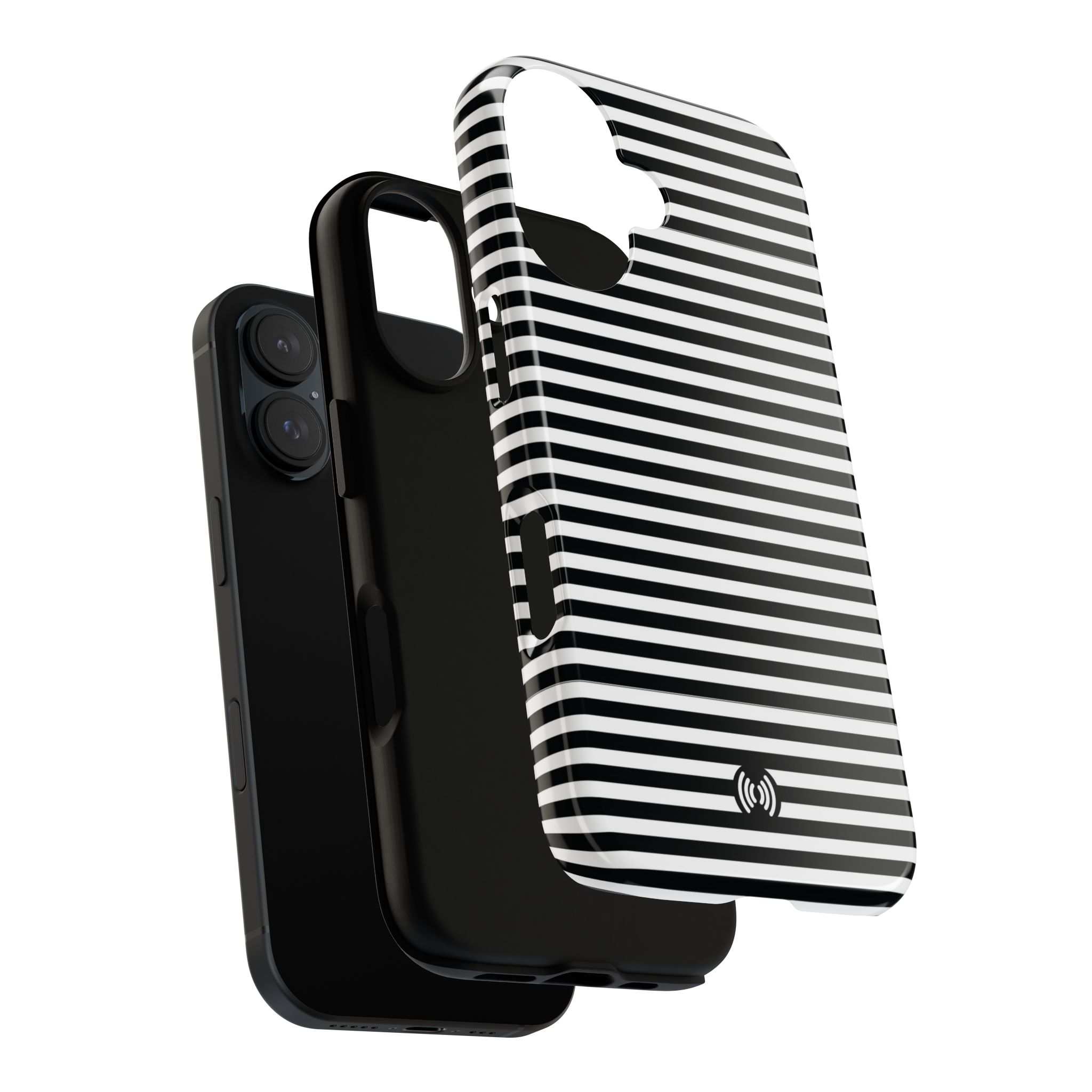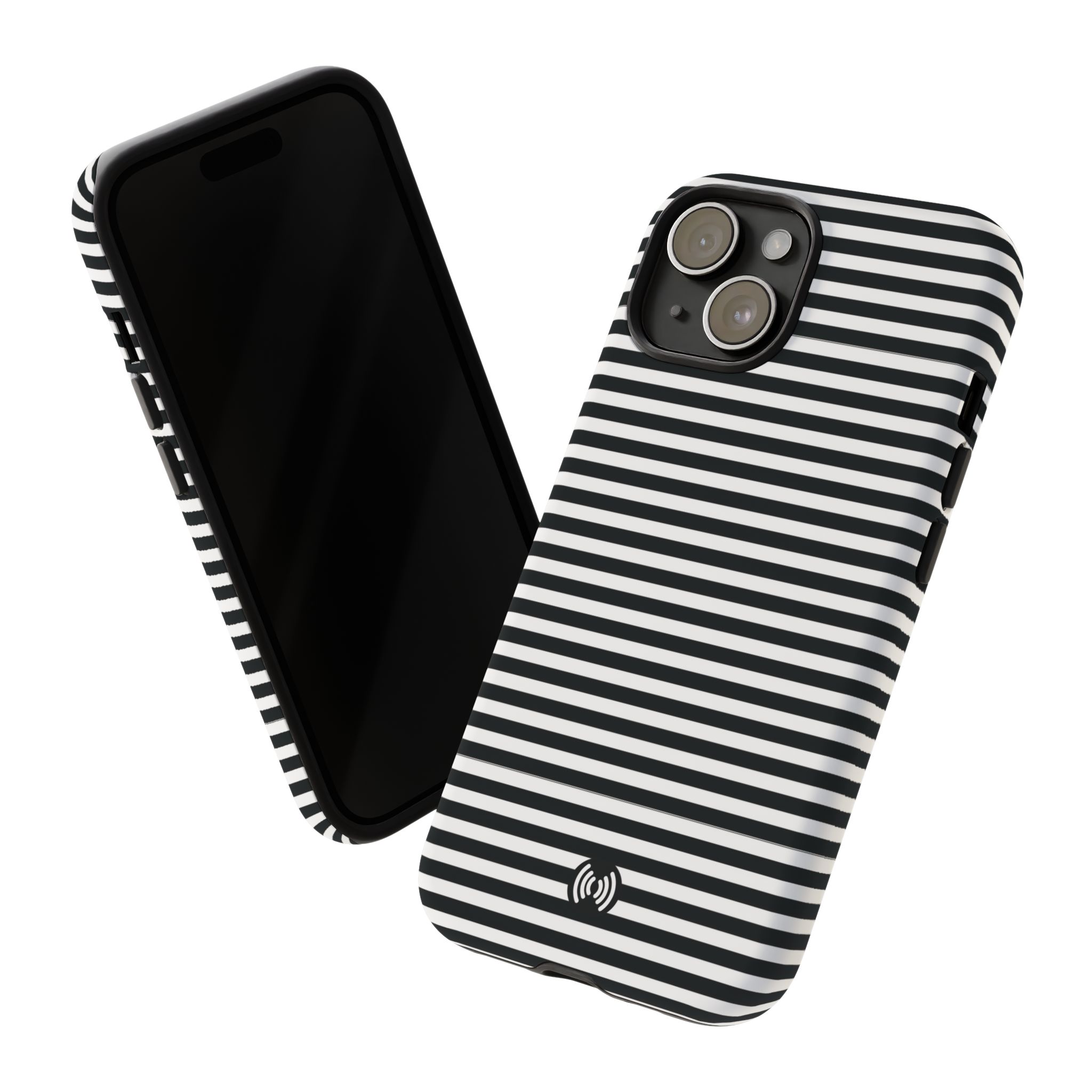 A slim, dual-layer phone case with a bold black-and-white striped design that reads modern and understated. The shell’s full-wrap print creates a seamless pattern around the edges while a soft TPU liner cushions drops. Outdoor-safe coatings resist fading so the graphic stays crisp through everyday use. It sits light in the hand, keeps ports open, and supports wireless charging — a practical everyday shield that complements a streamlined, design-forward wardrobe.