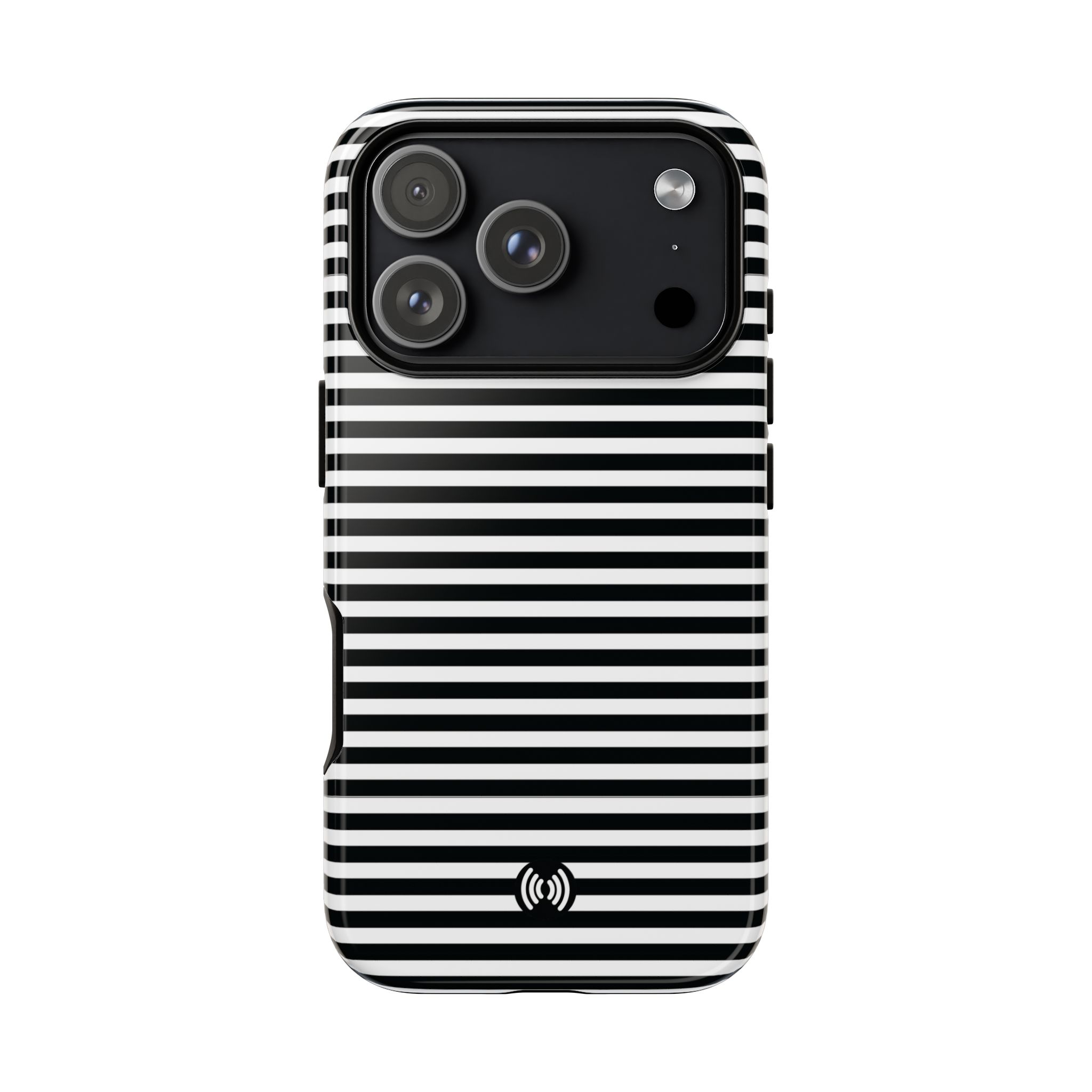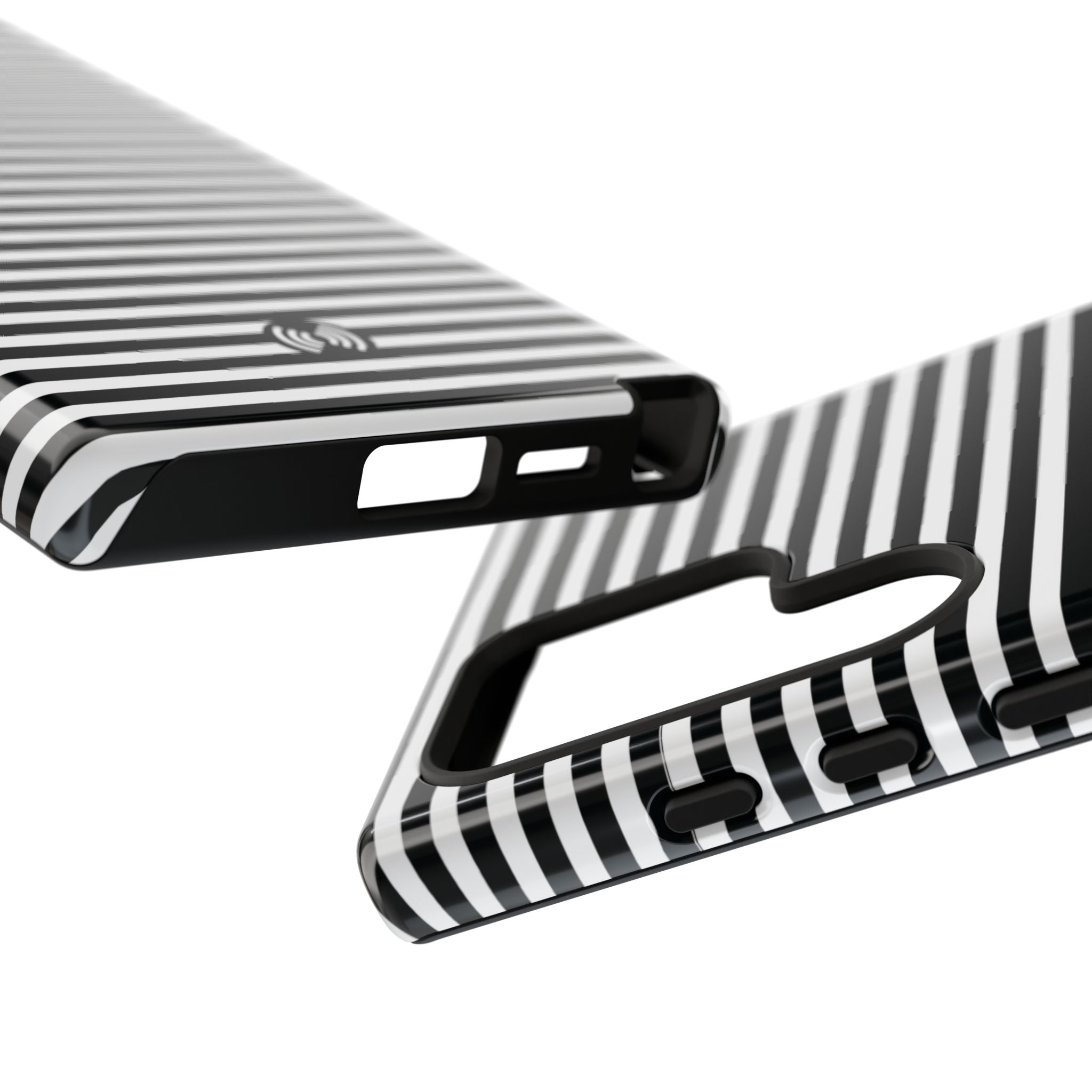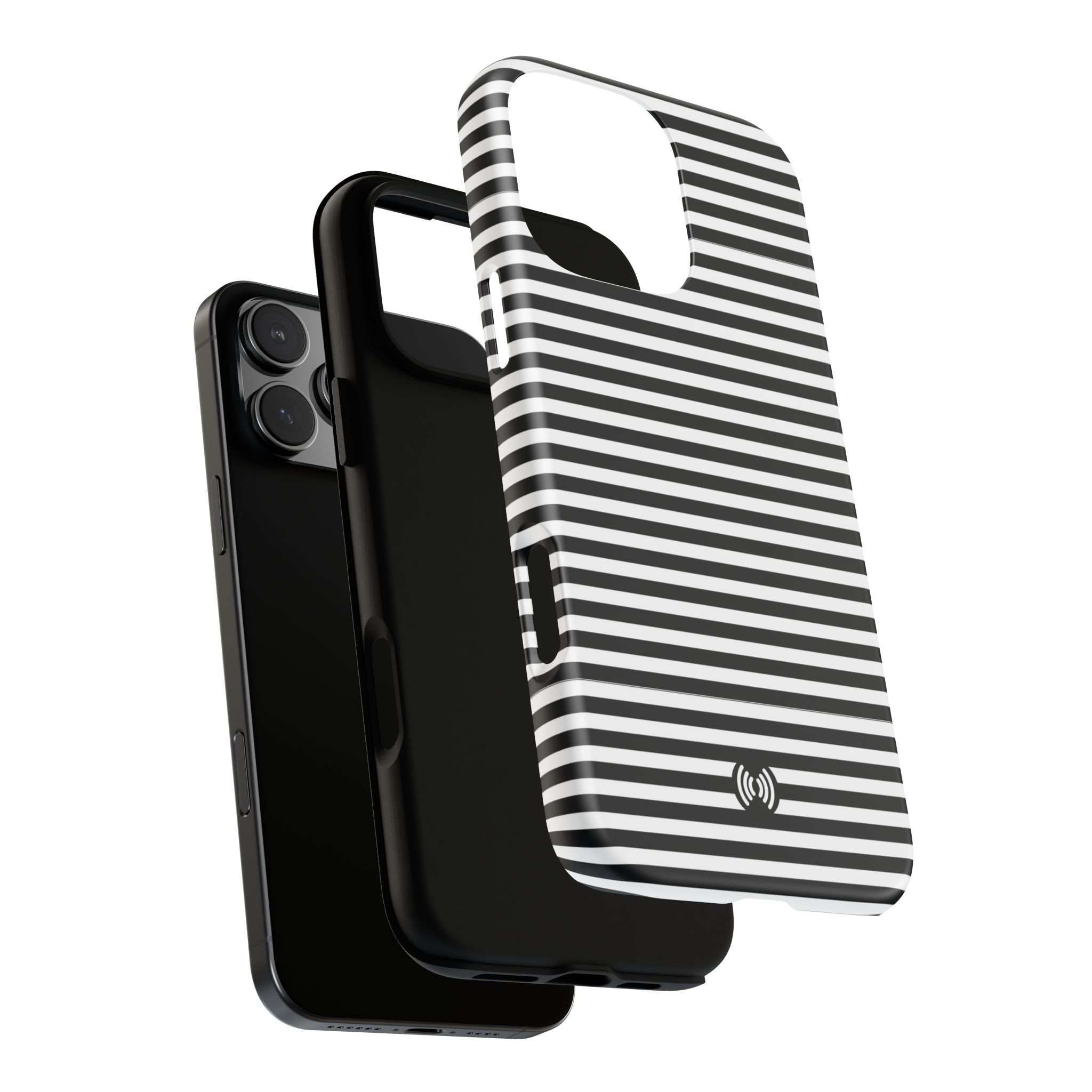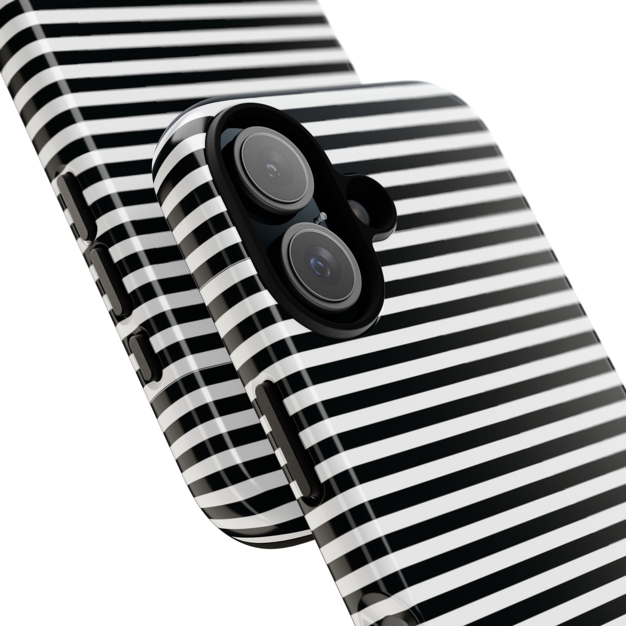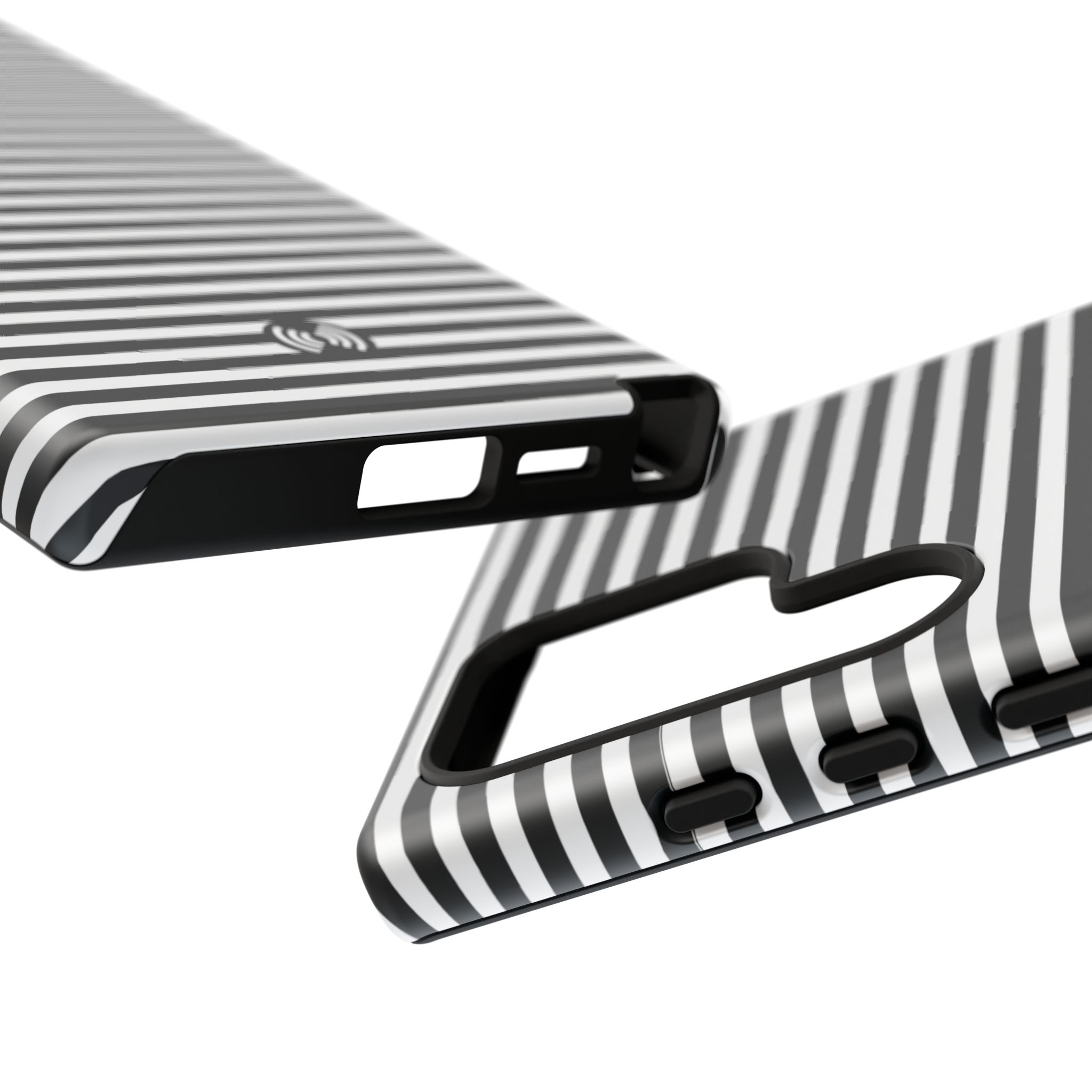 A slim, dual-layer phone case with a bold black-and-white striped design that reads modern and understated. The shell’s full-wrap print creates a seamless pattern around the edges while a soft TPU liner cushions drops. Outdoor-safe coatings resist fading so the graphic stays crisp through everyday use. It sits light in the hand, keeps ports open, and supports wireless charging — a practical everyday shield that complements a streamlined, design-forward wardrobe.