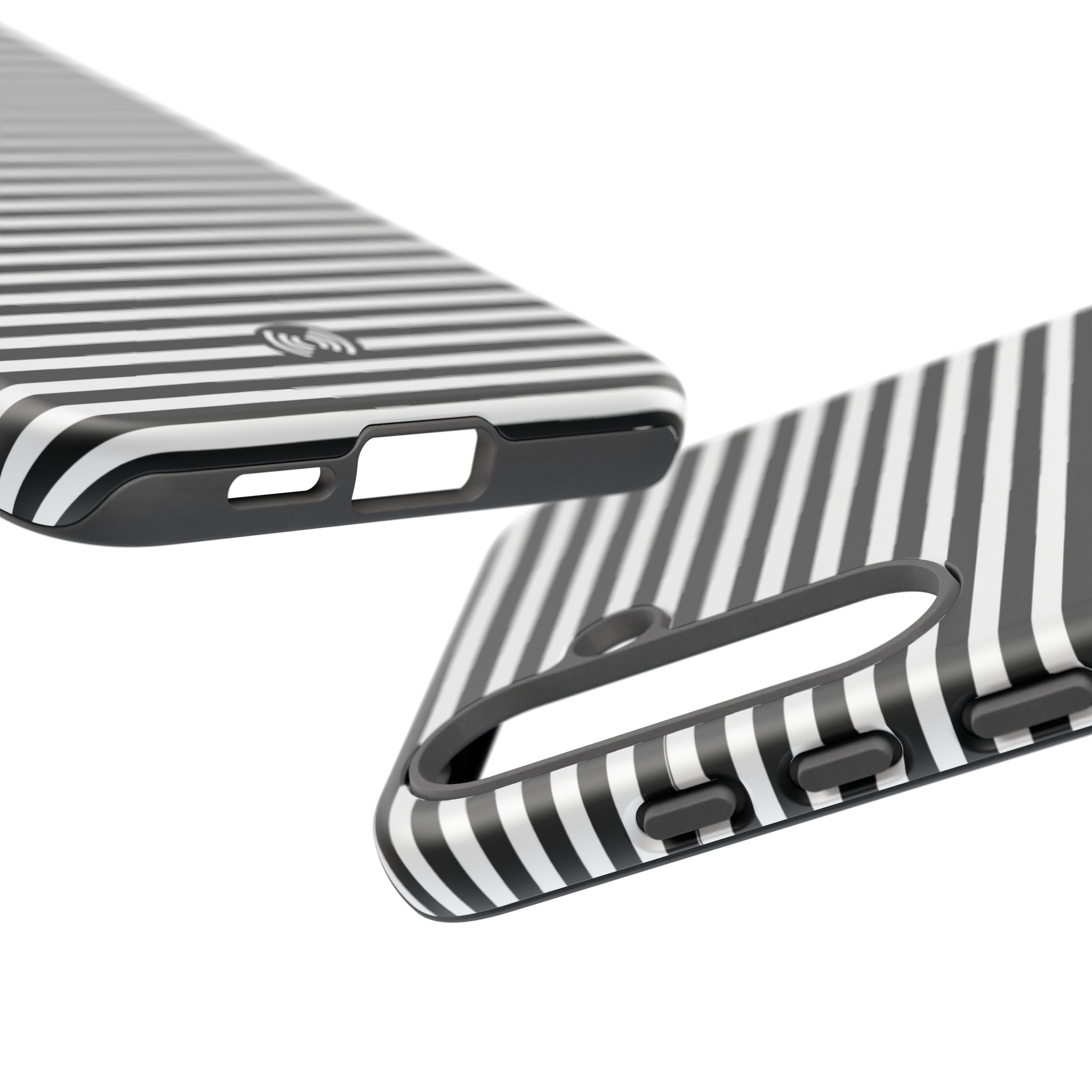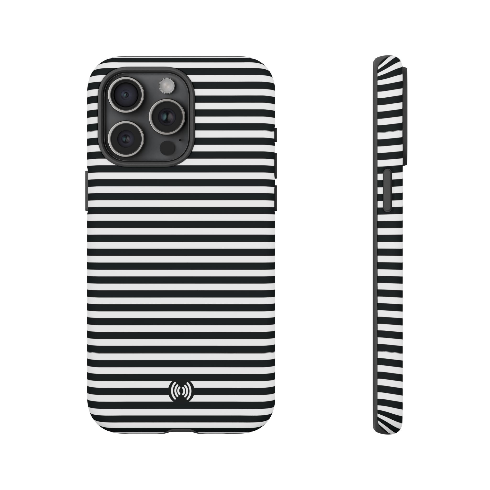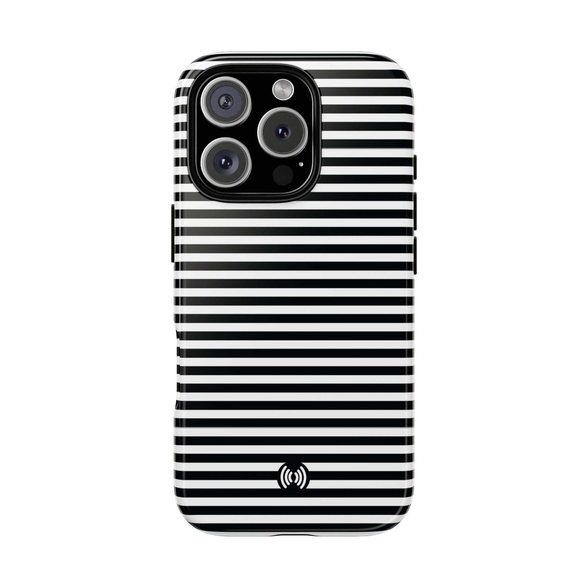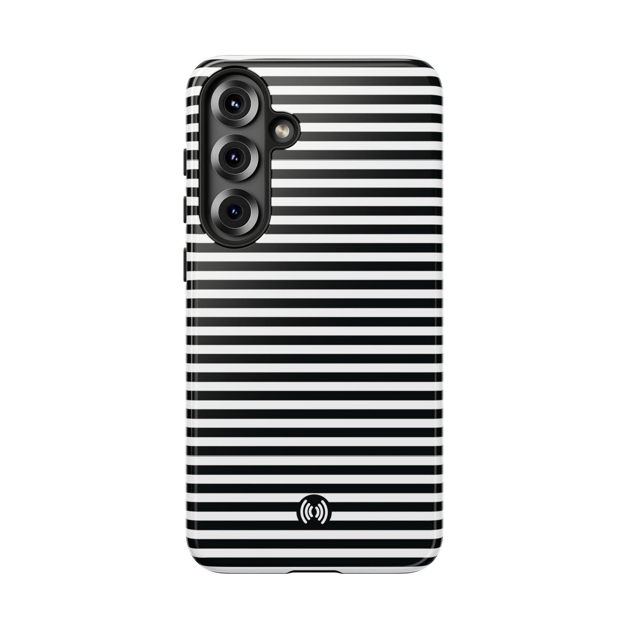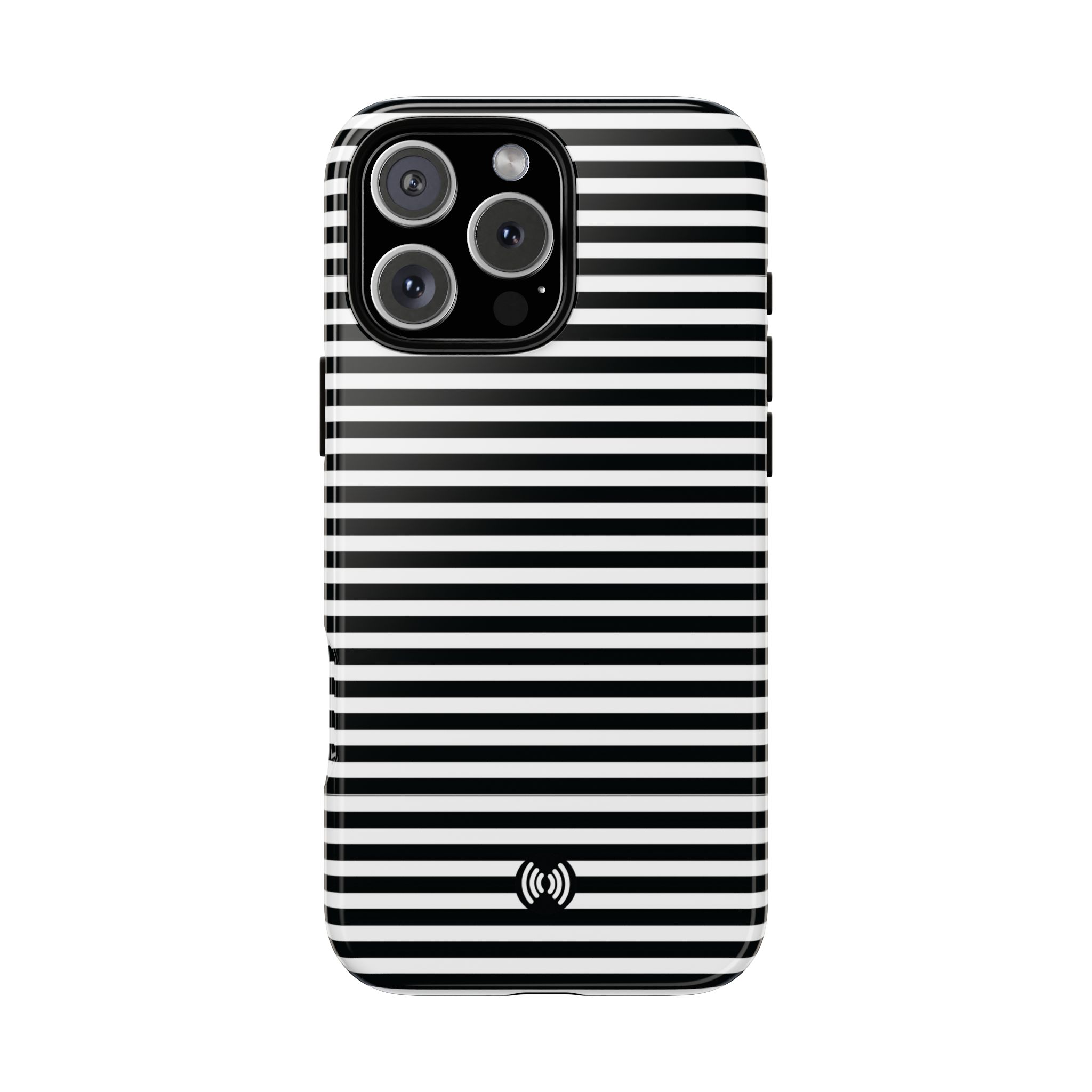 A slim, dual-layer phone case with a bold black-and-white striped design that reads modern and understated. The shell’s full-wrap print creates a seamless pattern around the edges while a soft TPU liner cushions drops. Outdoor-safe coatings resist fading so the graphic stays crisp through everyday use. It sits light in the hand, keeps ports open, and supports wireless charging — a practical everyday shield that complements a streamlined, design-forward wardrobe.