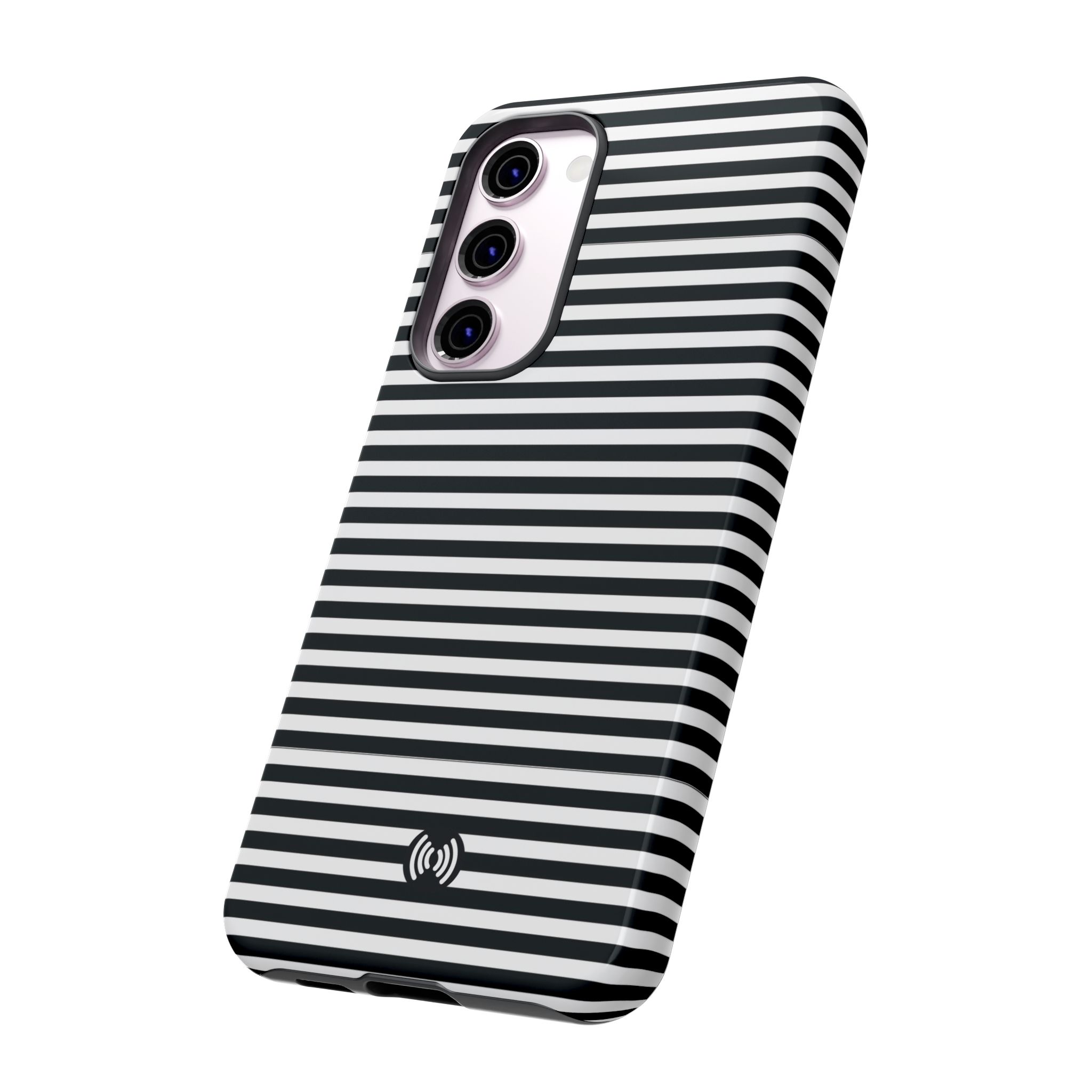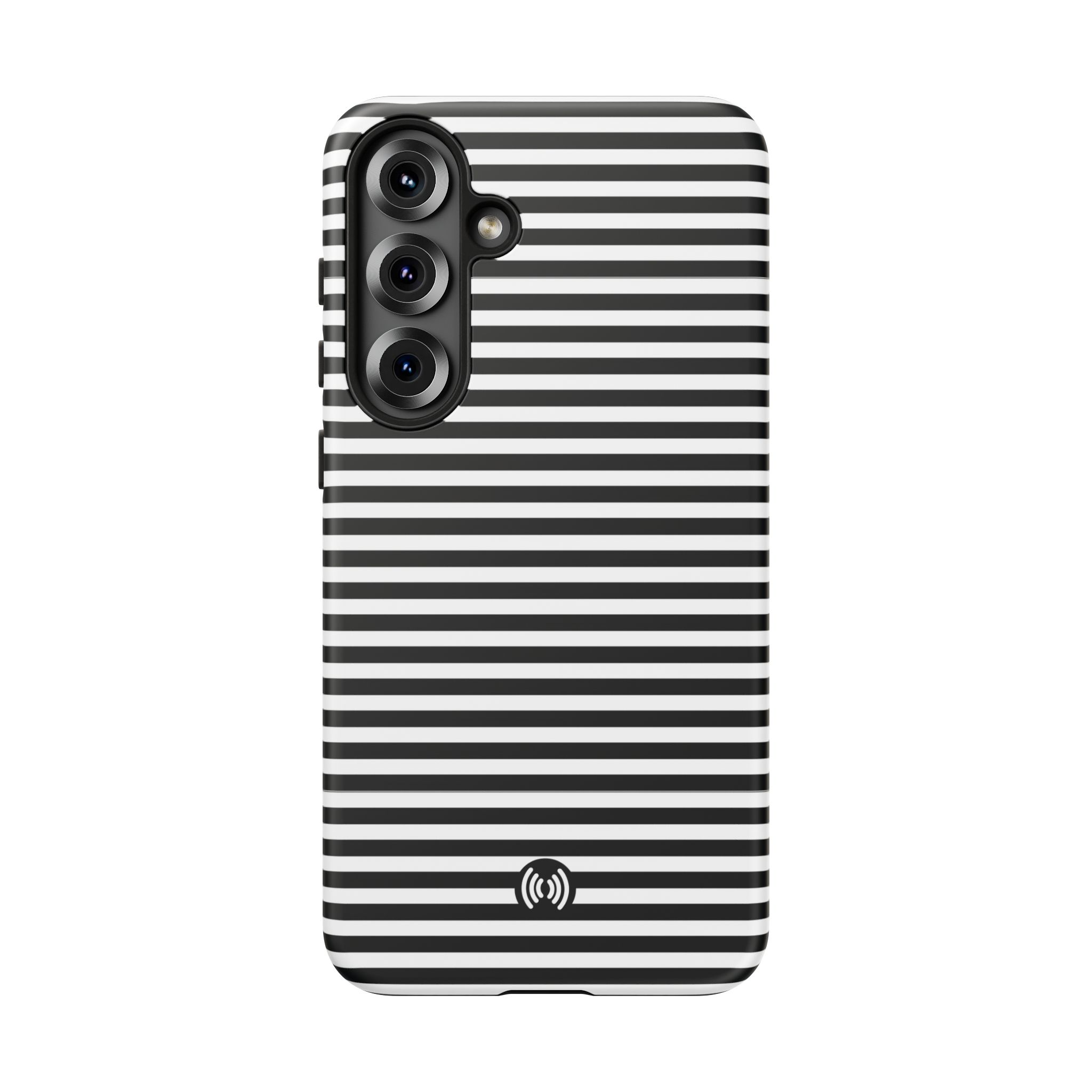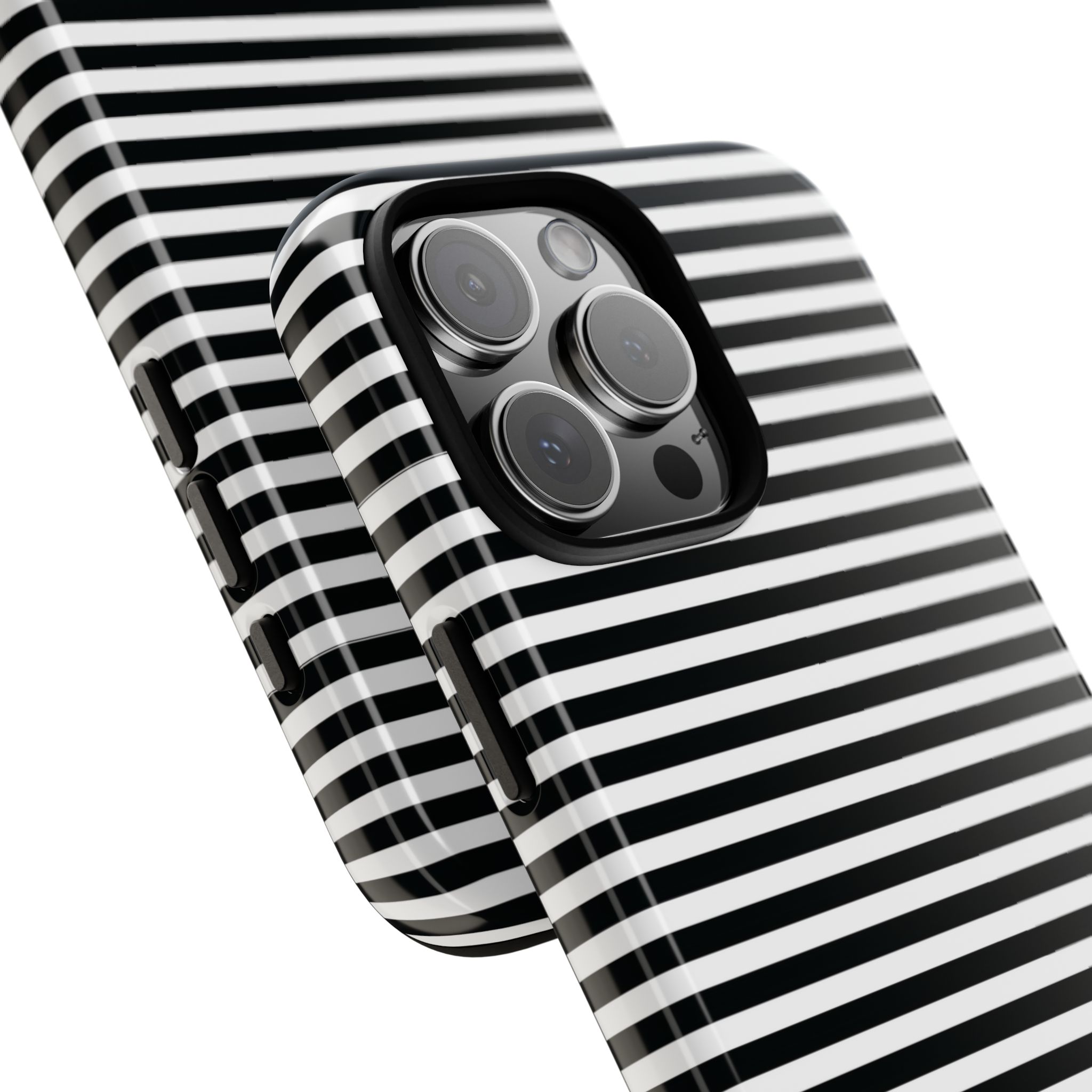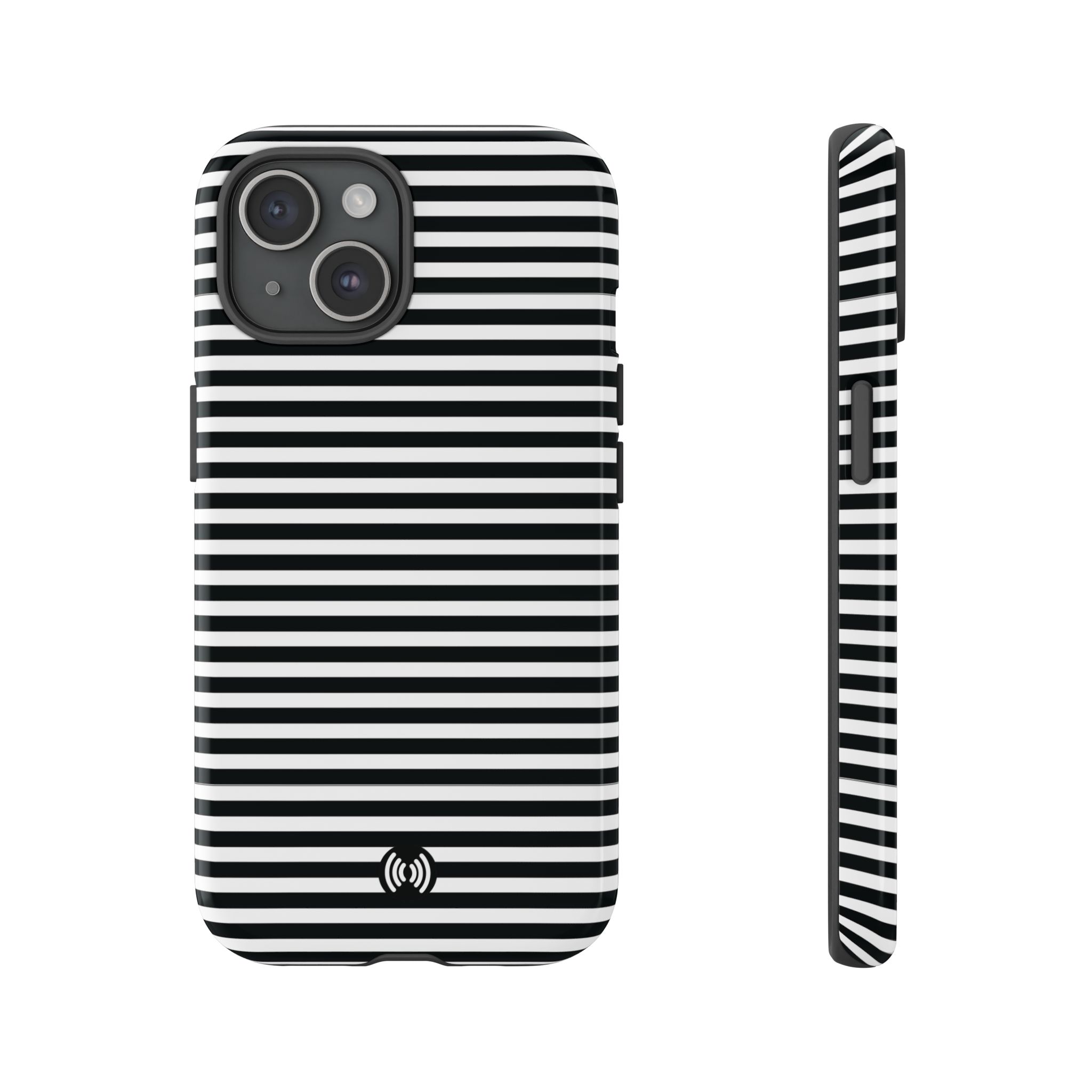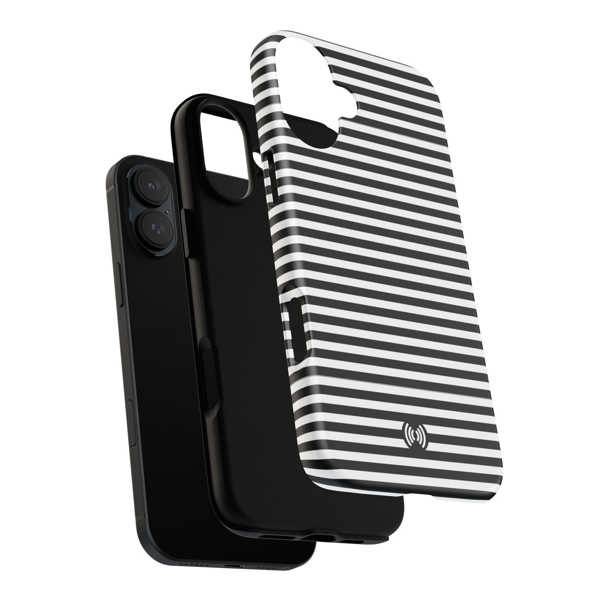 A slim, dual-layer phone case with a bold black-and-white striped design that reads modern and understated. The shell’s full-wrap print creates a seamless pattern around the edges while a soft TPU liner cushions drops. Outdoor-safe coatings resist fading so the graphic stays crisp through everyday use. It sits light in the hand, keeps ports open, and supports wireless charging — a practical everyday shield that complements a streamlined, design-forward wardrobe.