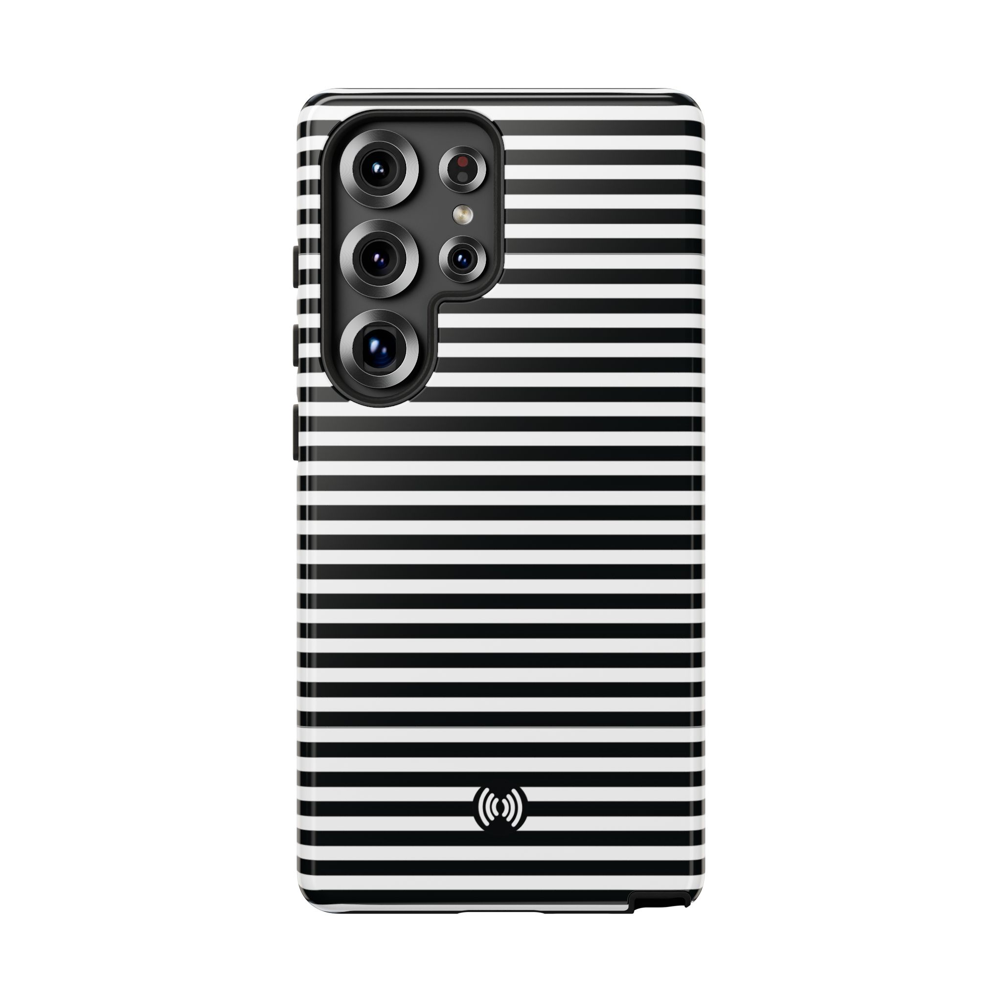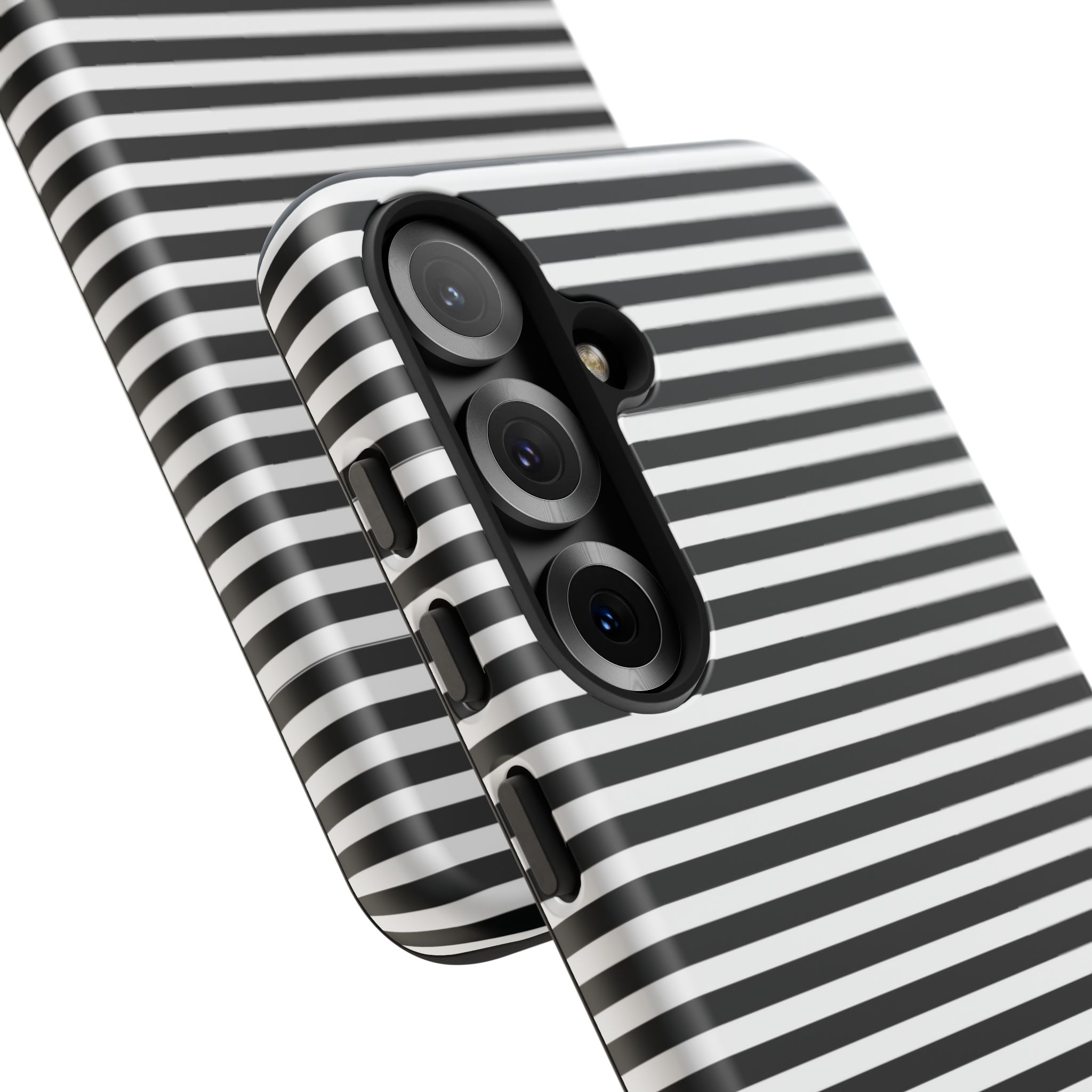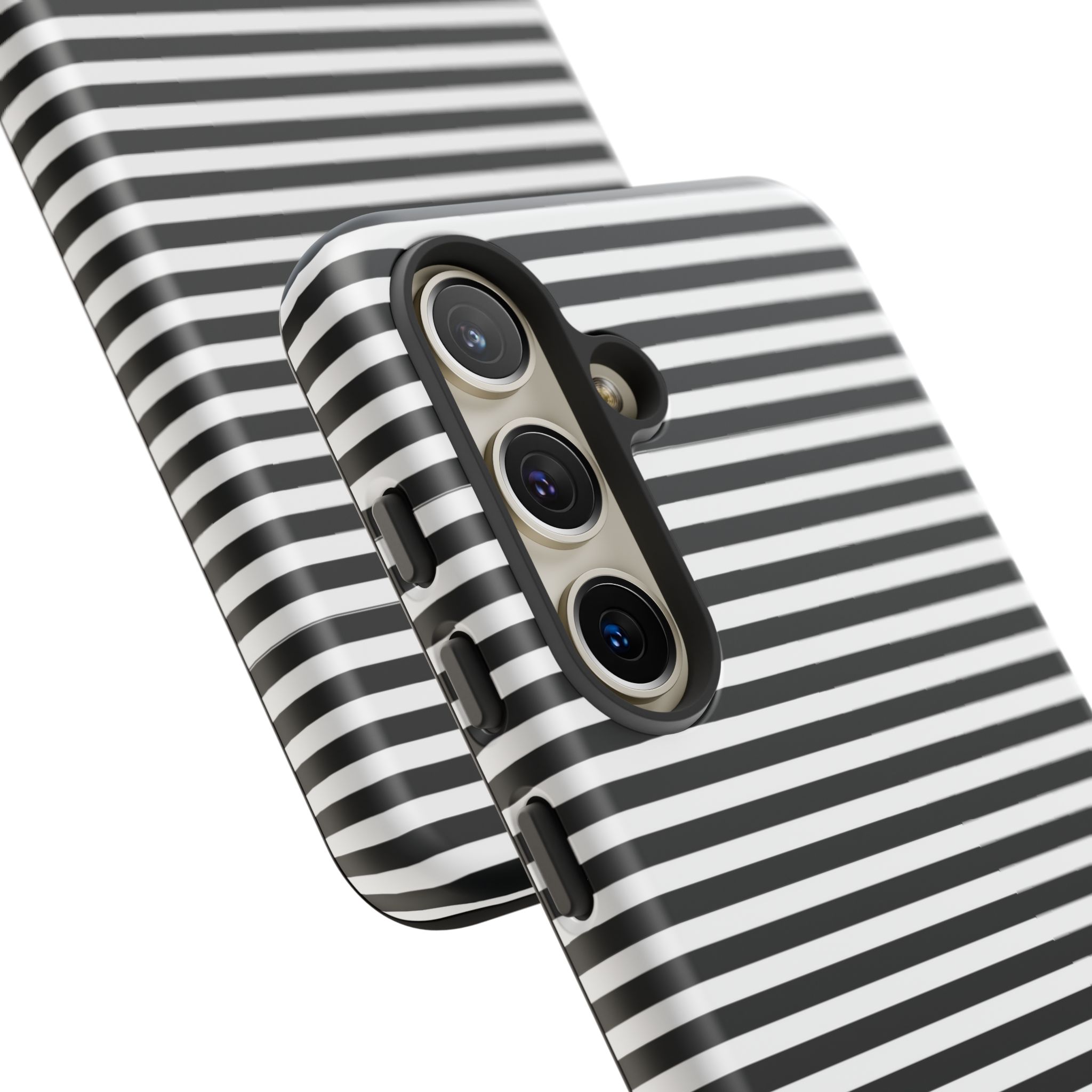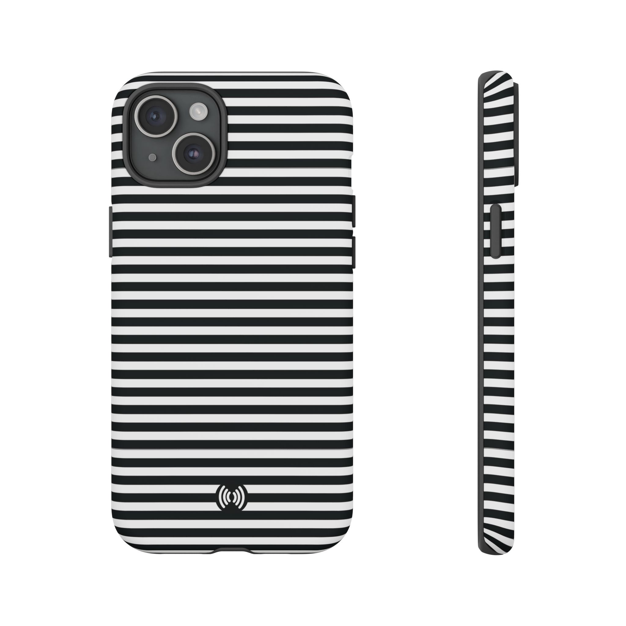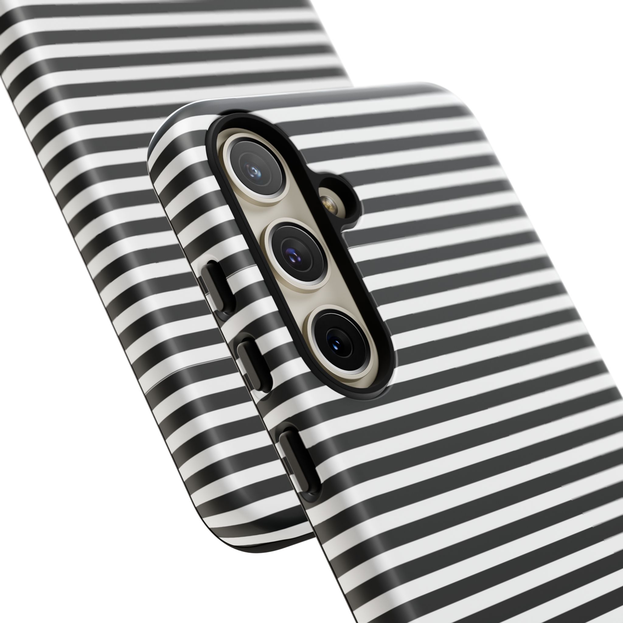 A slim, dual-layer phone case with a bold black-and-white striped design that reads modern and understated. The shell’s full-wrap print creates a seamless pattern around the edges while a soft TPU liner cushions drops. Outdoor-safe coatings resist fading so the graphic stays crisp through everyday use. It sits light in the hand, keeps ports open, and supports wireless charging — a practical everyday shield that complements a streamlined, design-forward wardrobe.