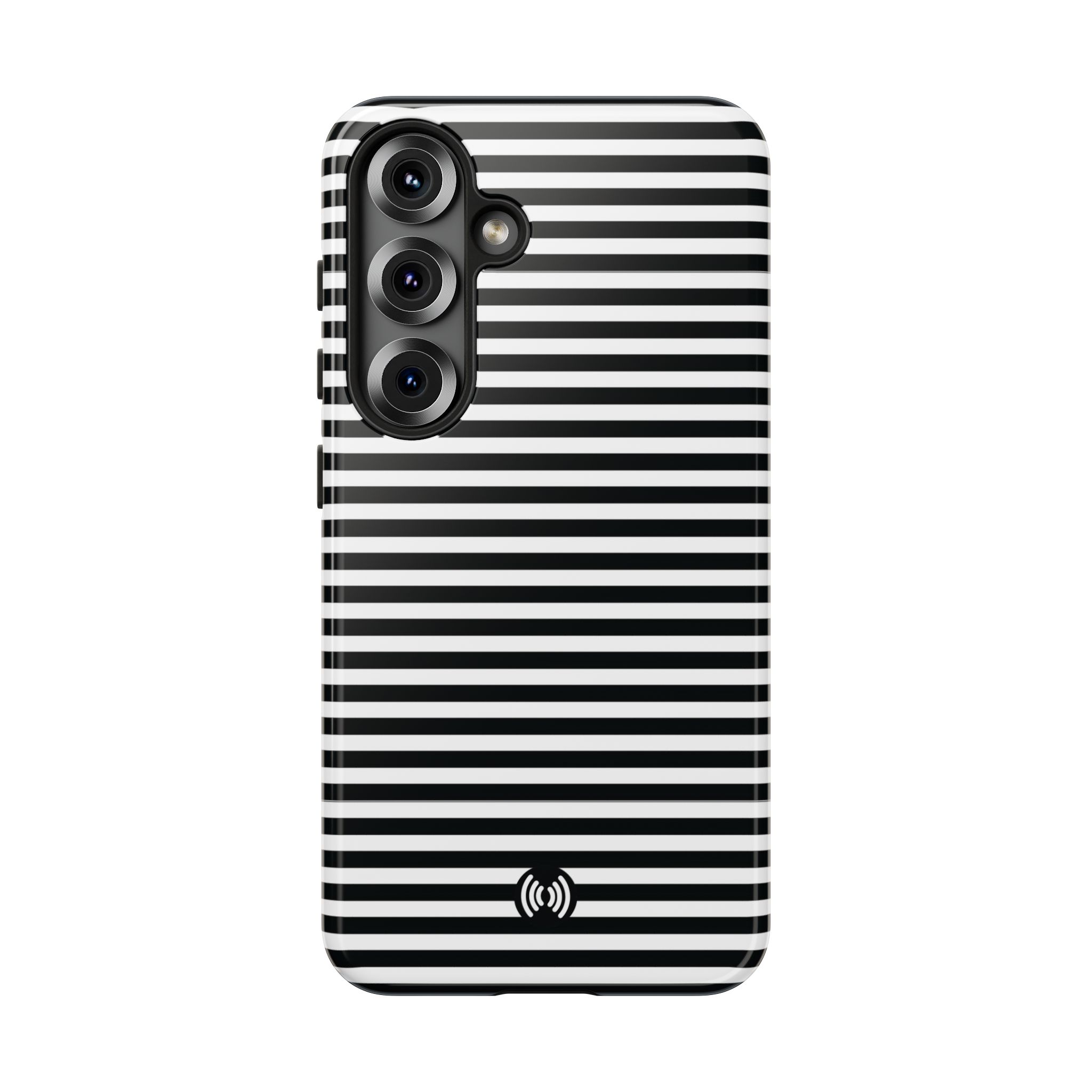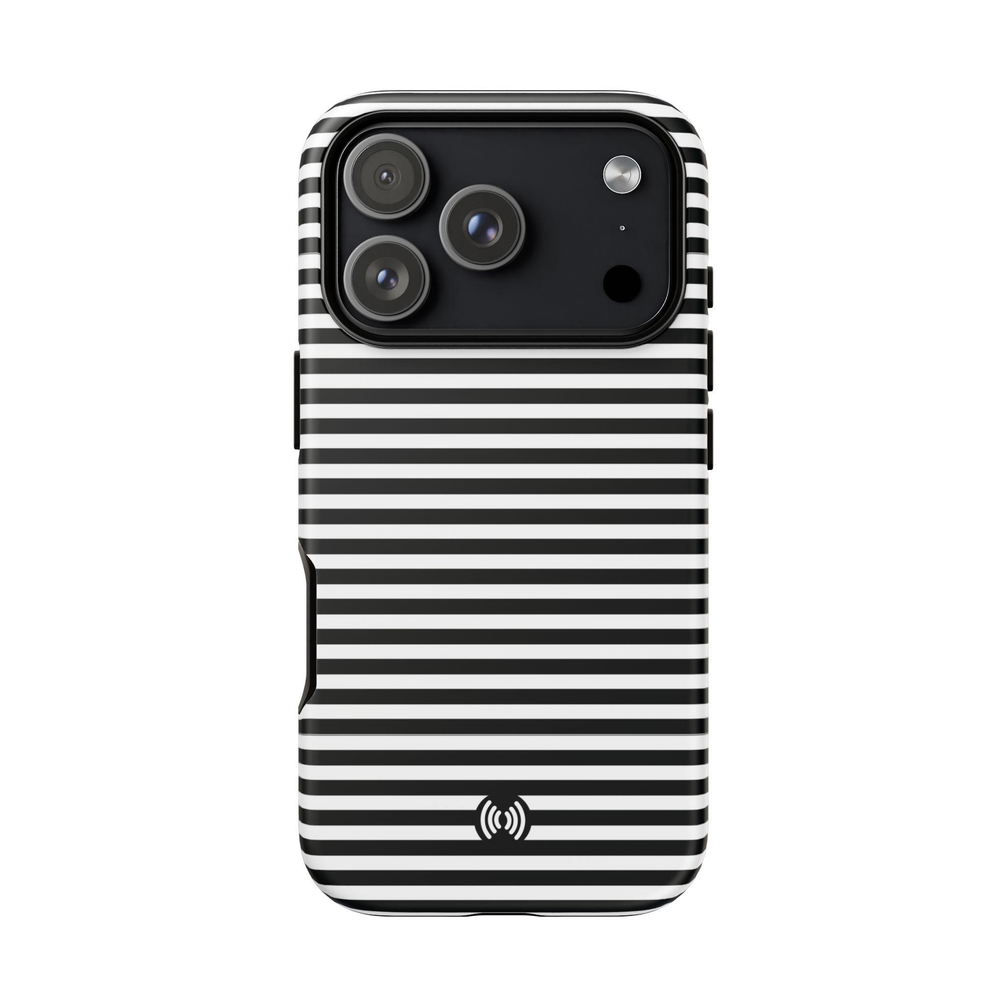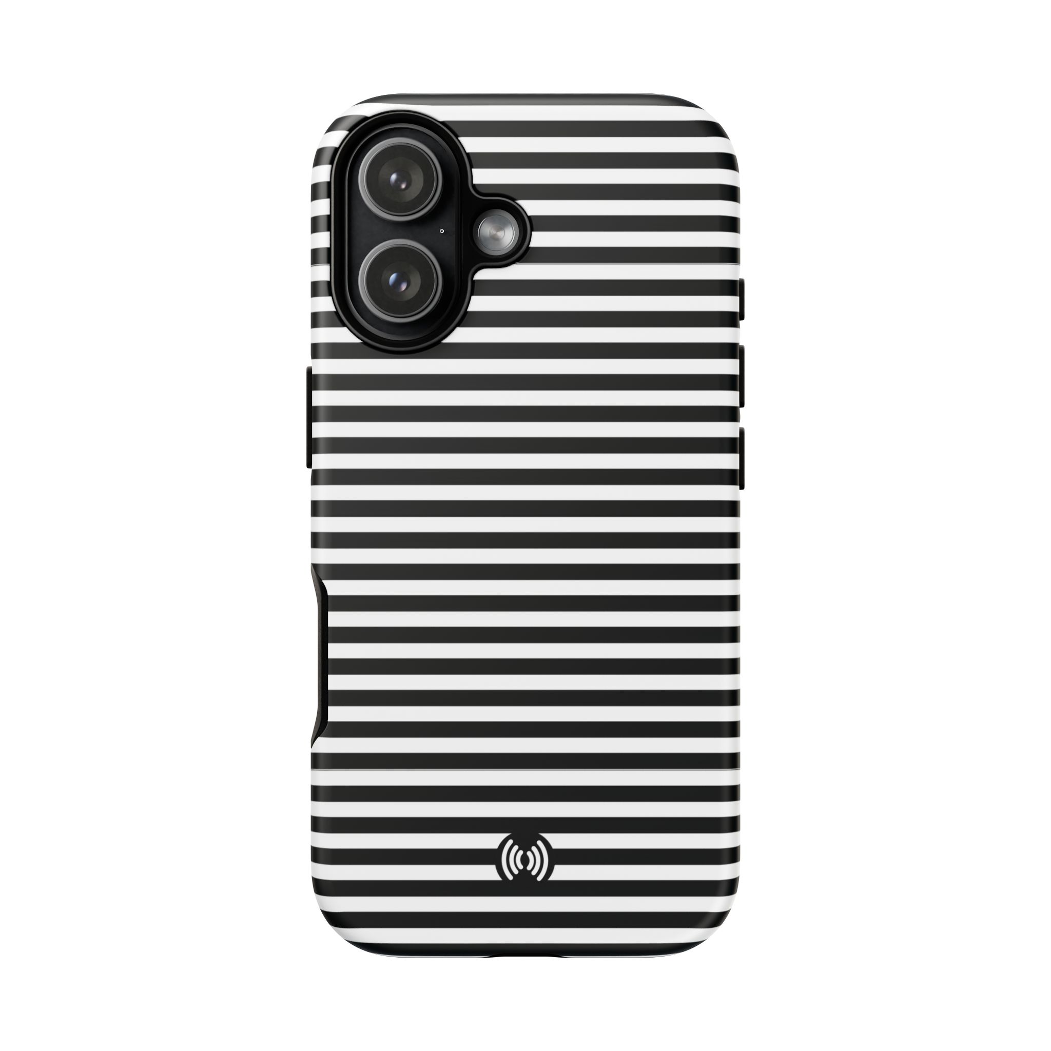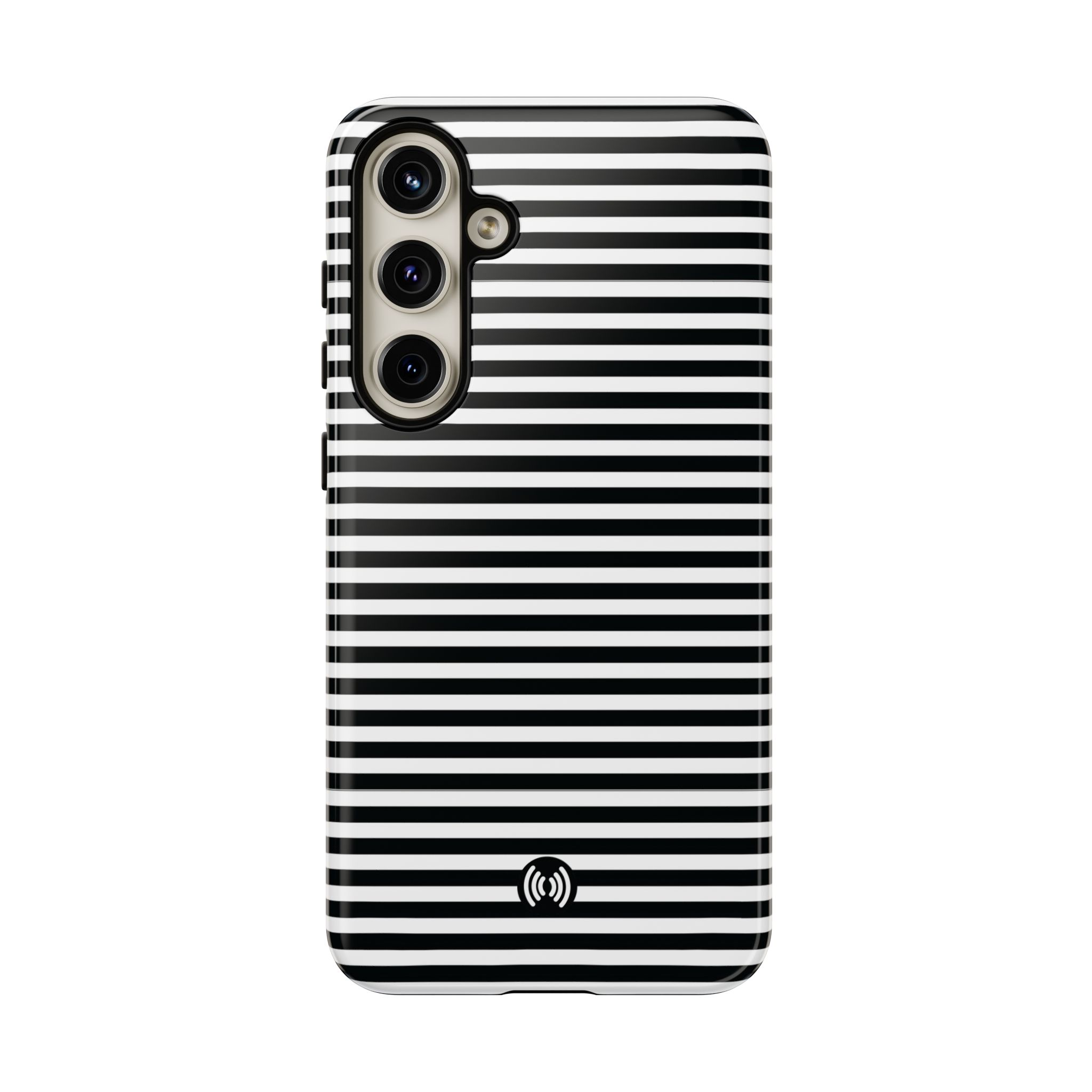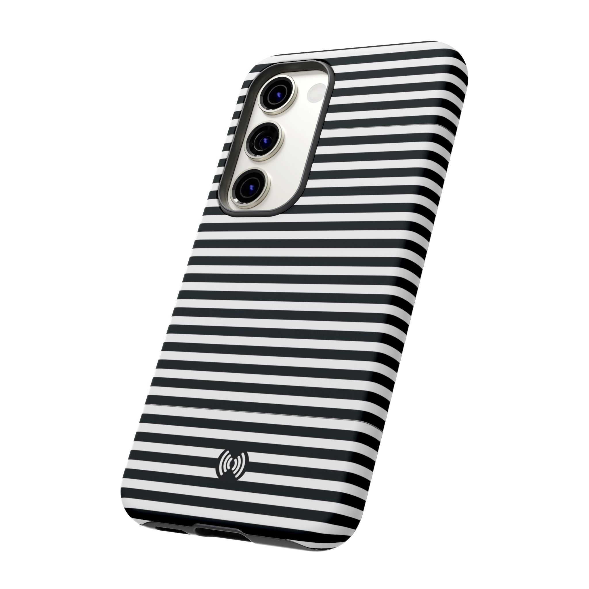 A slim, dual-layer phone case with a bold black-and-white striped design that reads modern and understated. The shell’s full-wrap print creates a seamless pattern around the edges while a soft TPU liner cushions drops. Outdoor-safe coatings resist fading so the graphic stays crisp through everyday use. It sits light in the hand, keeps ports open, and supports wireless charging — a practical everyday shield that complements a streamlined, design-forward wardrobe.
