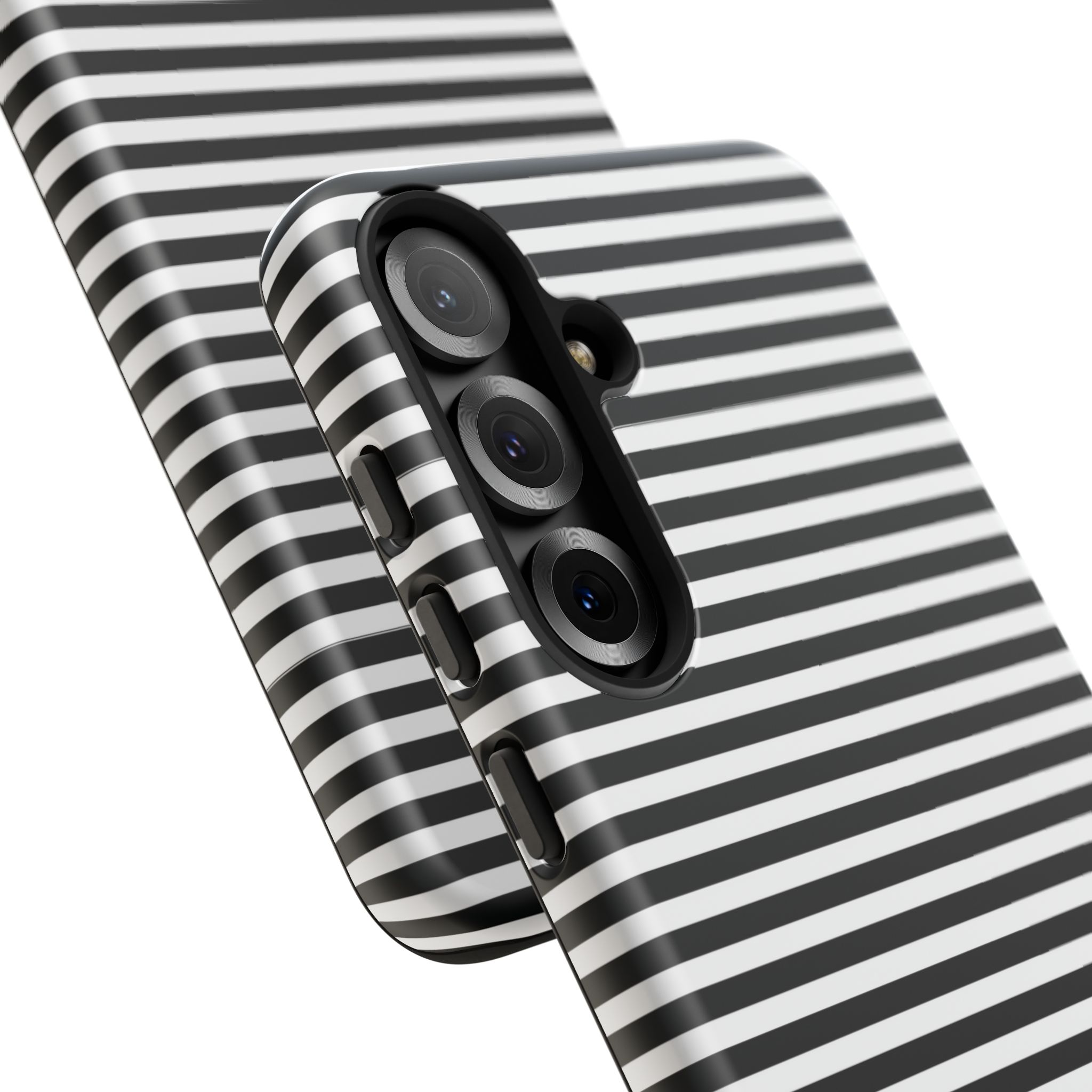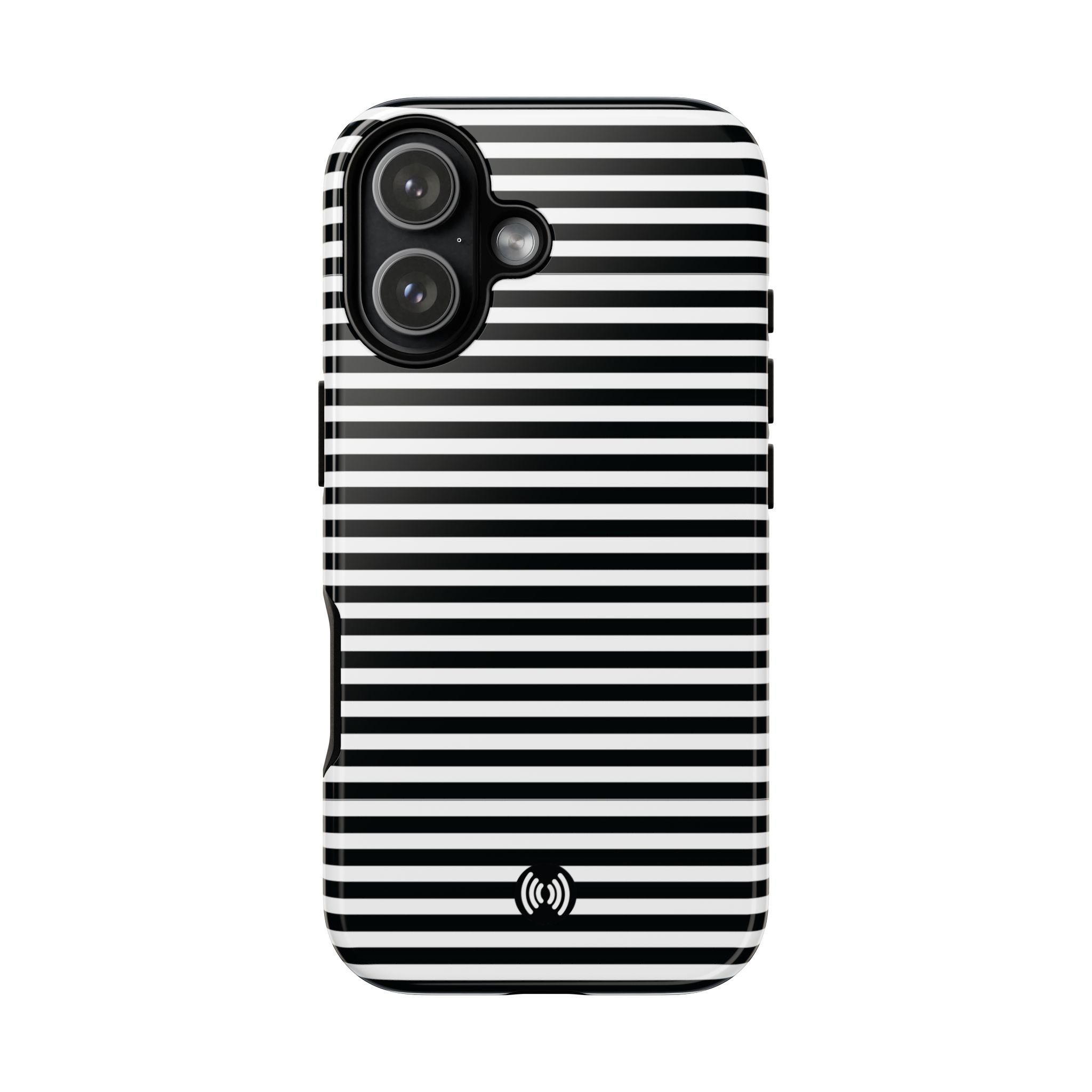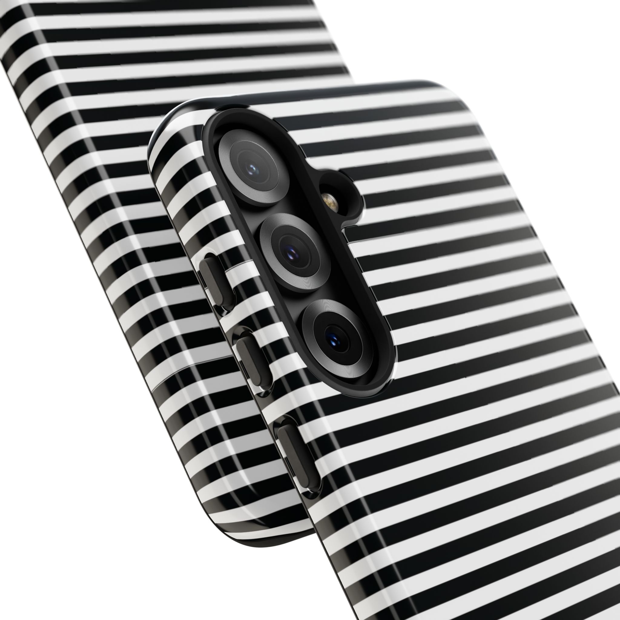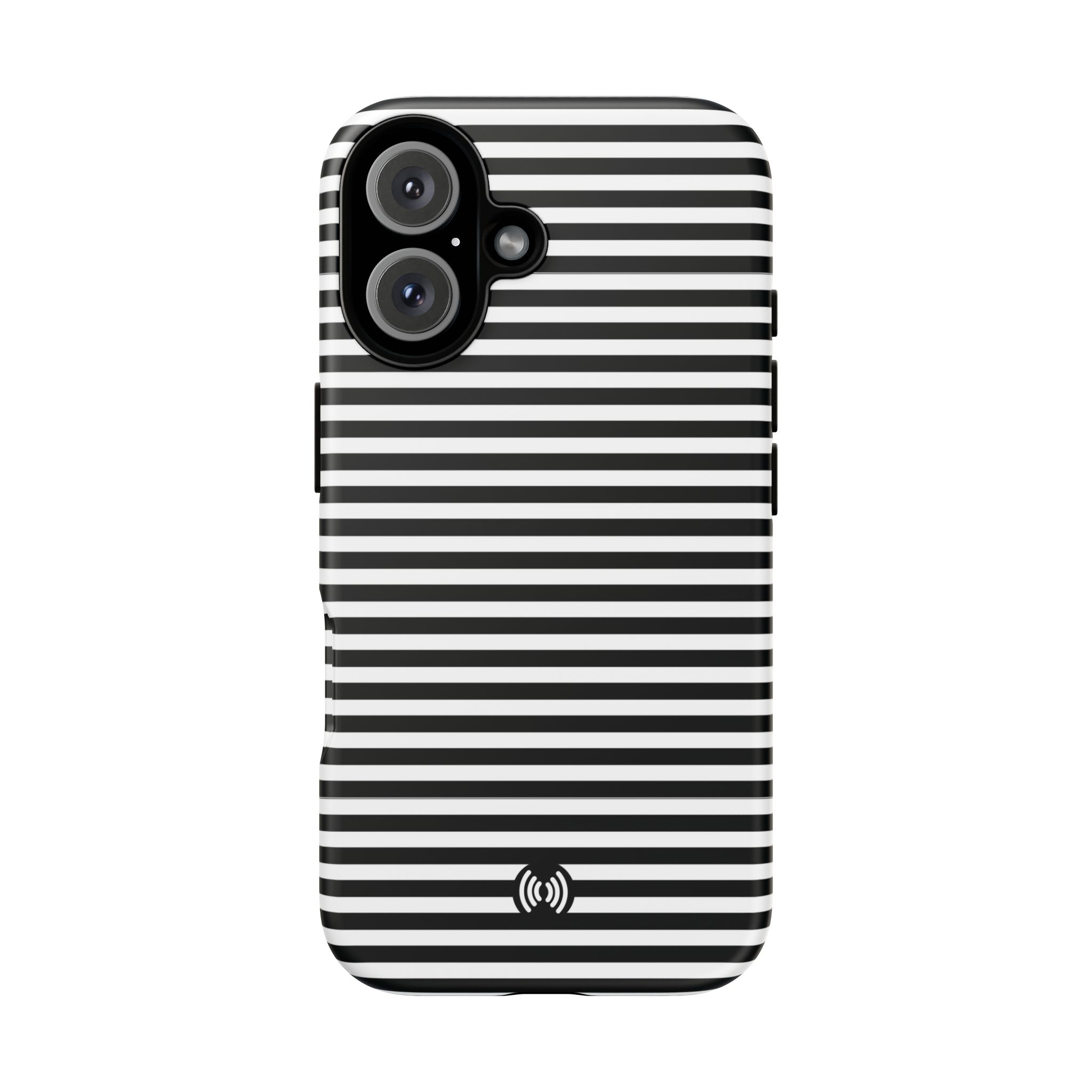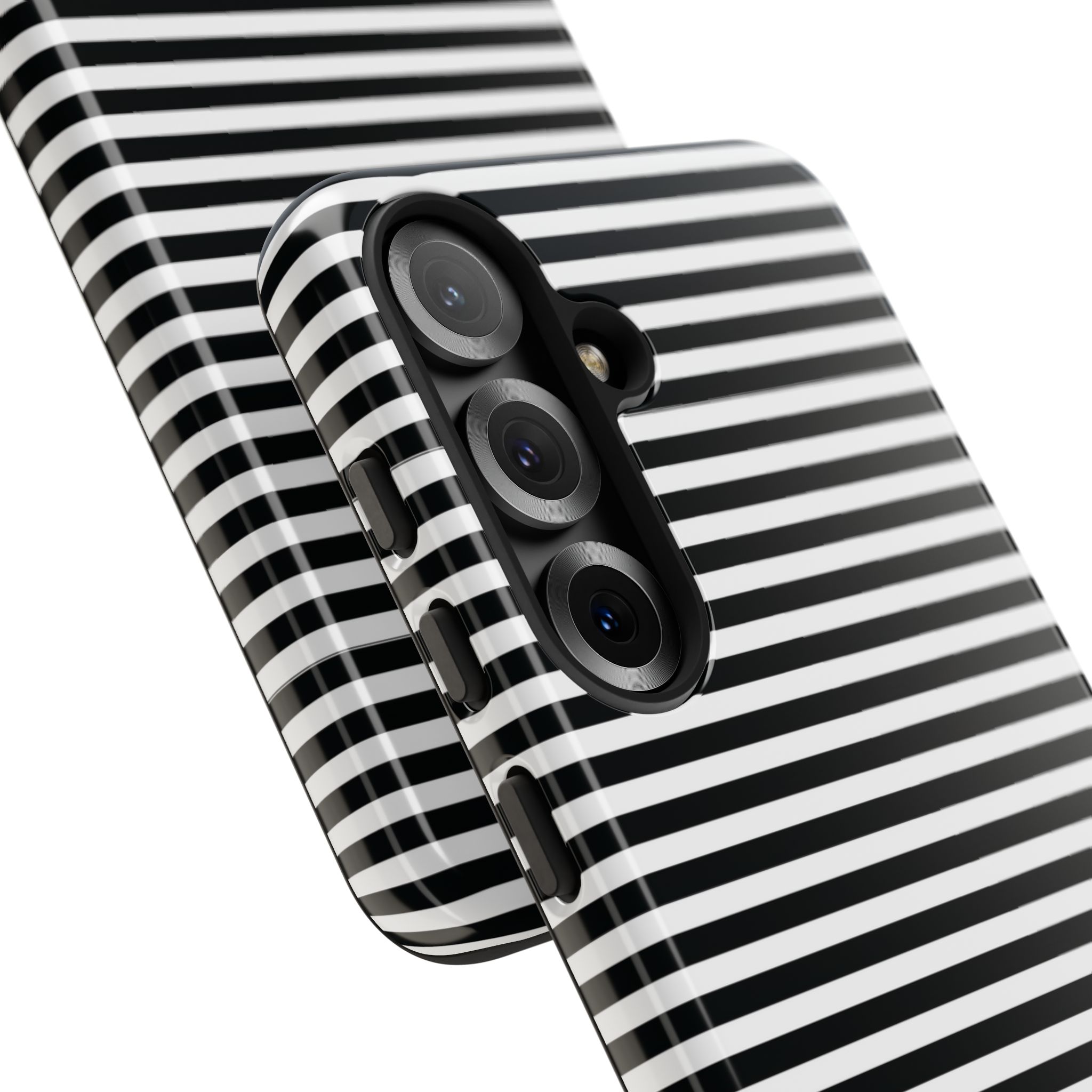 A slim, dual-layer phone case with a bold black-and-white striped design that reads modern and understated. The shell’s full-wrap print creates a seamless pattern around the edges while a soft TPU liner cushions drops. Outdoor-safe coatings resist fading so the graphic stays crisp through everyday use. It sits light in the hand, keeps ports open, and supports wireless charging — a practical everyday shield that complements a streamlined, design-forward wardrobe.