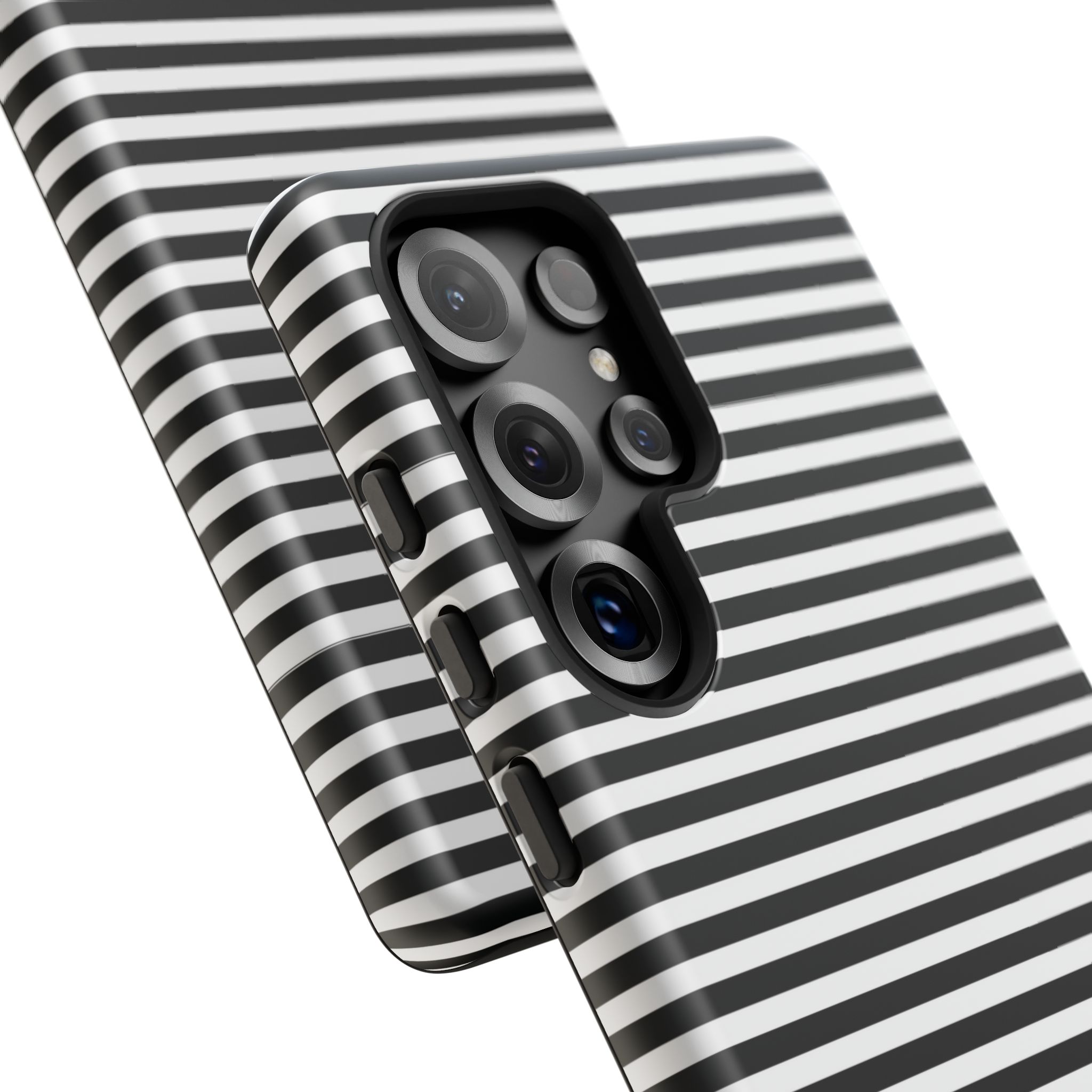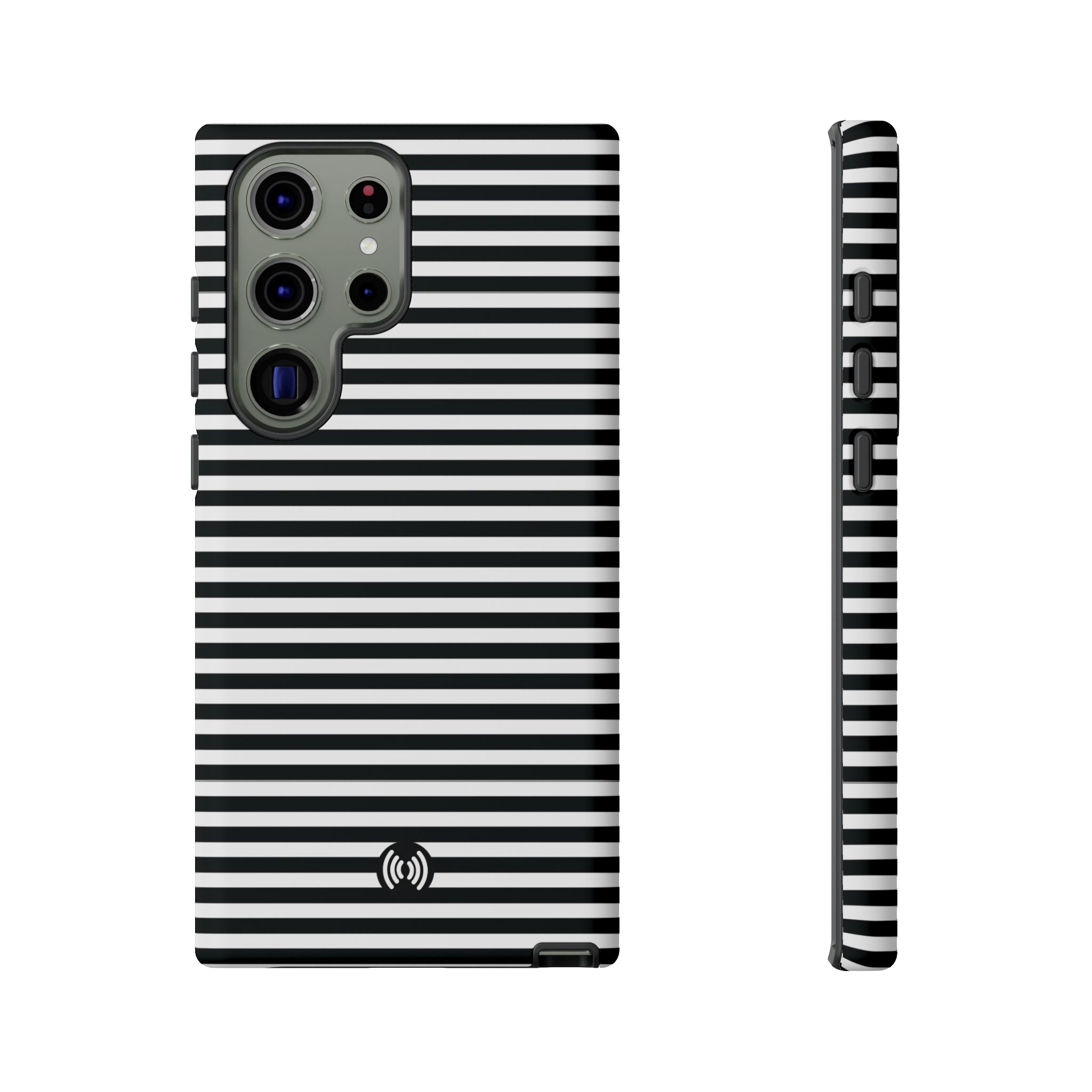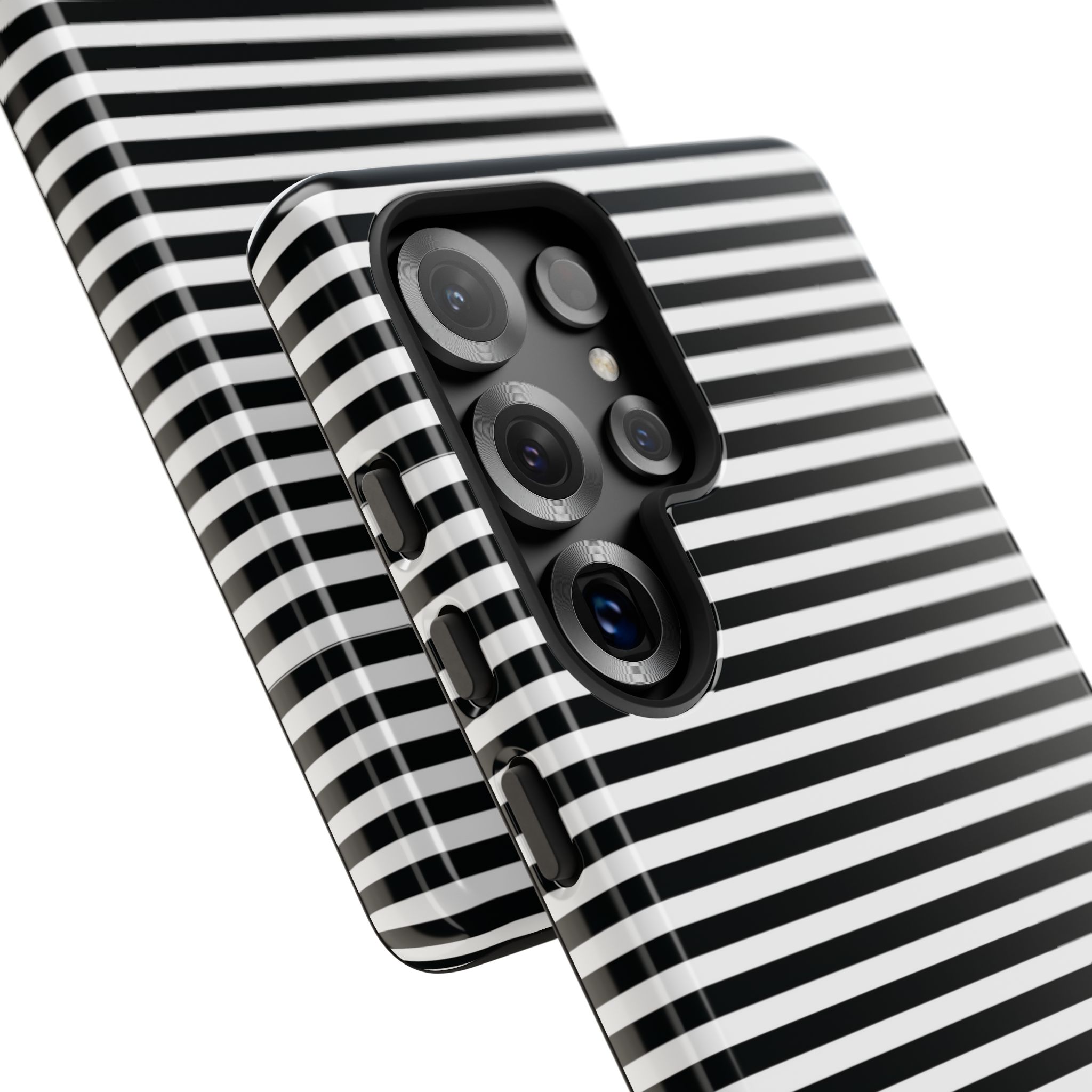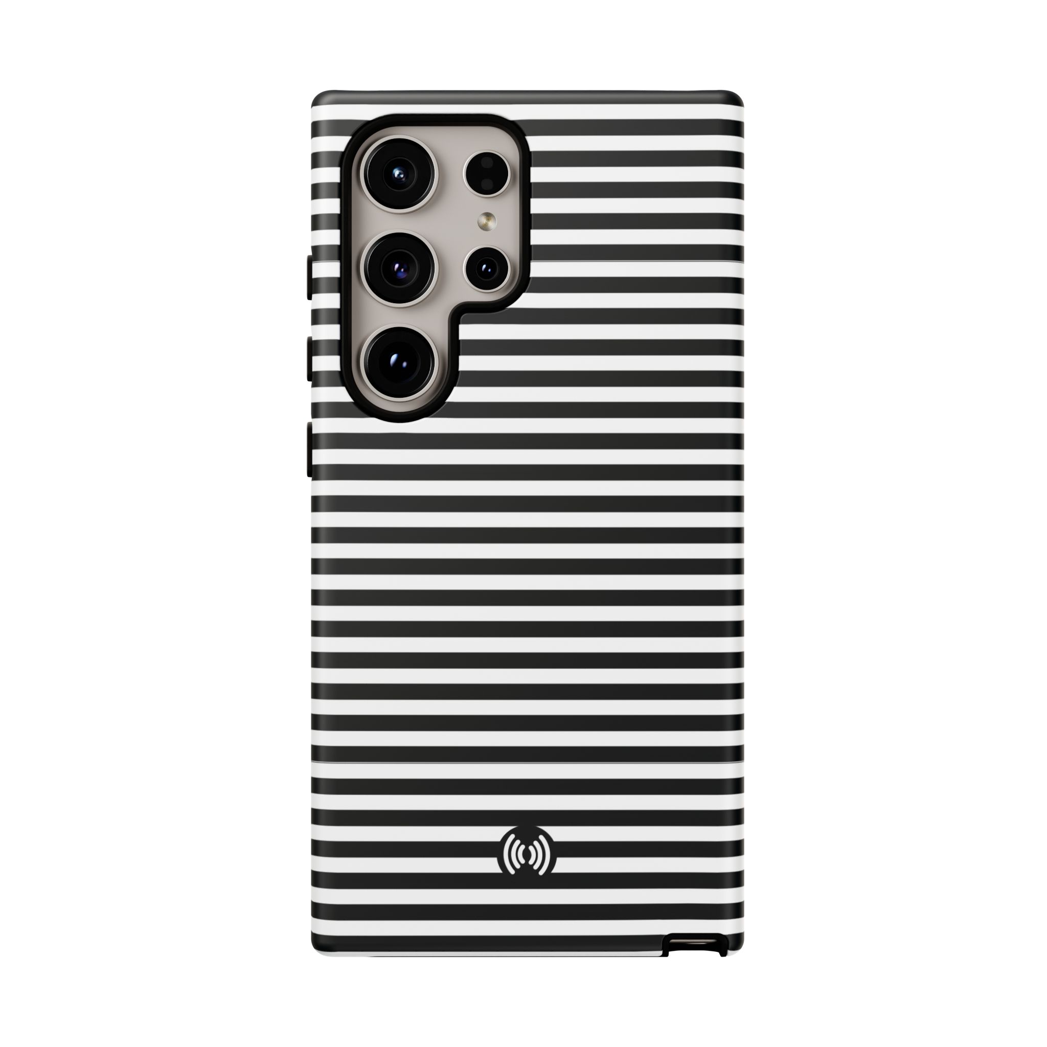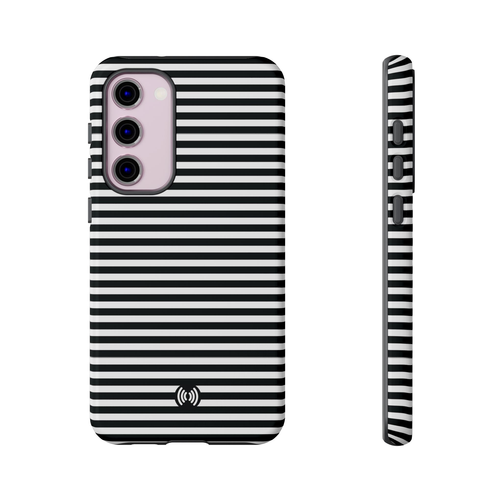 A slim, dual-layer phone case with a bold black-and-white striped design that reads modern and understated. The shell’s full-wrap print creates a seamless pattern around the edges while a soft TPU liner cushions drops. Outdoor-safe coatings resist fading so the graphic stays crisp through everyday use. It sits light in the hand, keeps ports open, and supports wireless charging — a practical everyday shield that complements a streamlined, design-forward wardrobe.