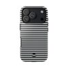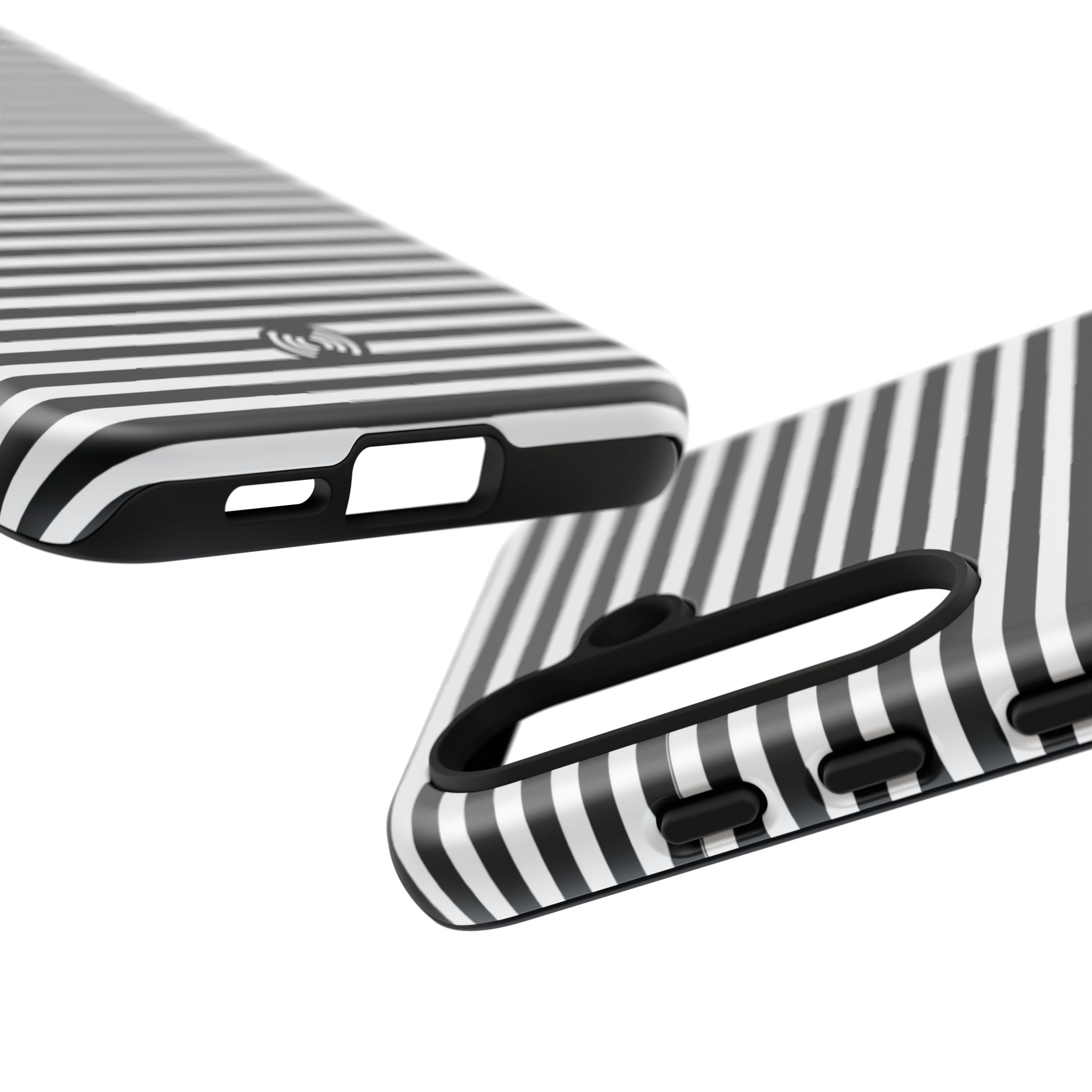 A slim, dual-layer phone case featuring a bold black-and-white striped design that feels modern, understated, and effortlessly wearable. The crisp stripe pattern wraps seamlessly around the edges, creating a clean, graphic look that pairs easily with a streamlined, design-forward wardrobe.